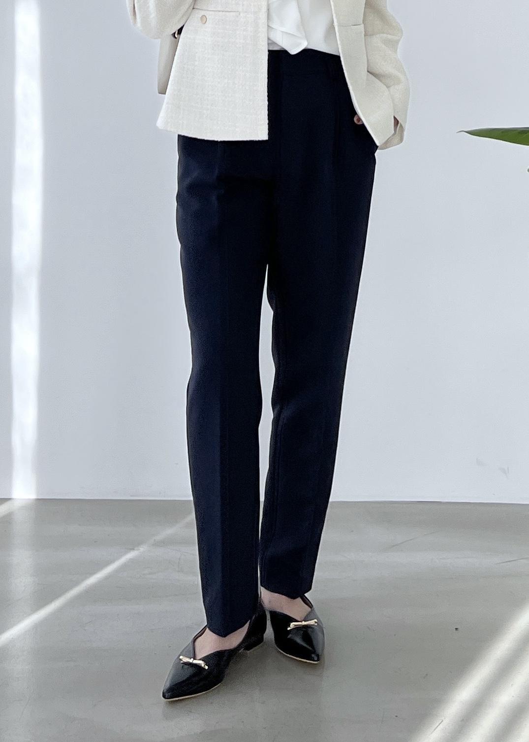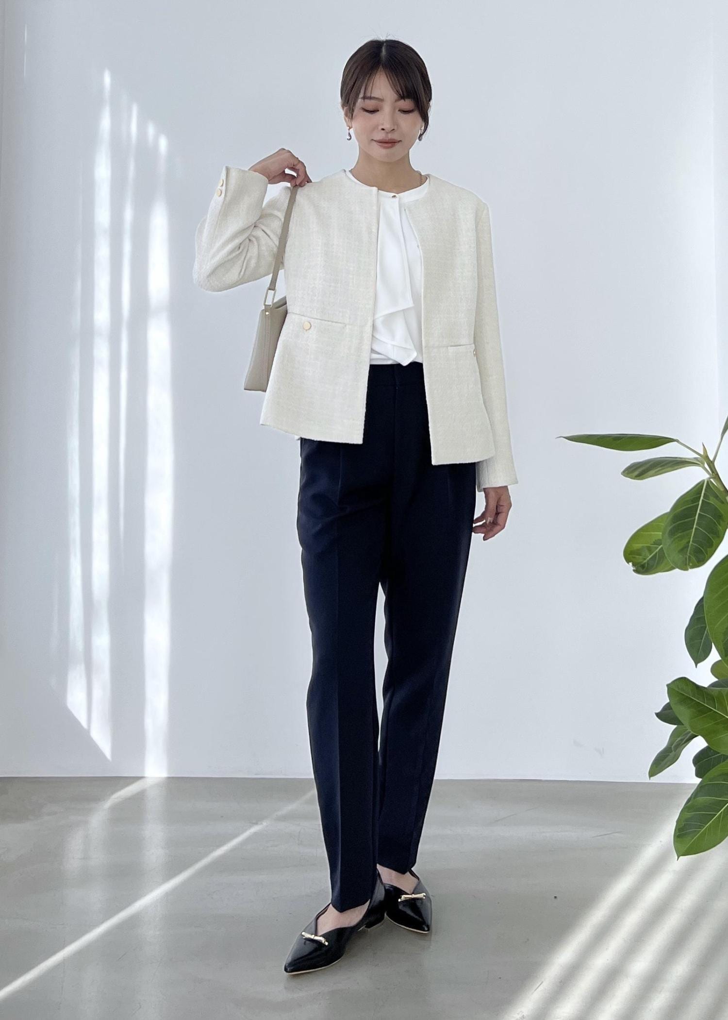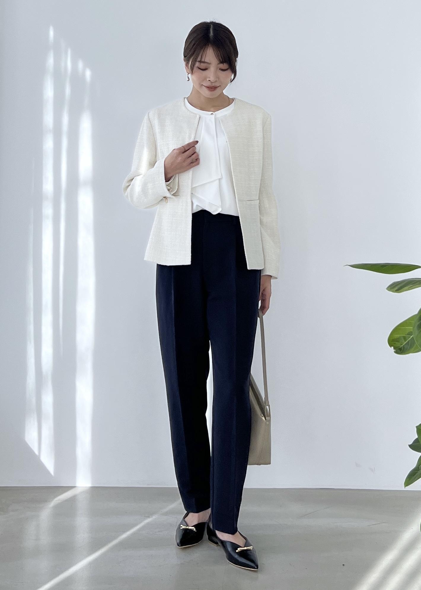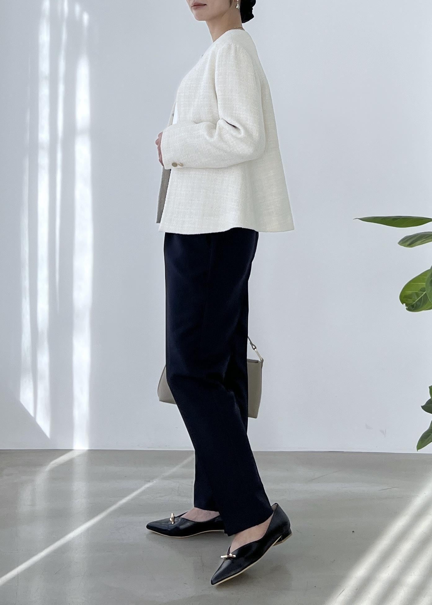 テーパードパンツを合わせてクラシカルな着こなしにしました。