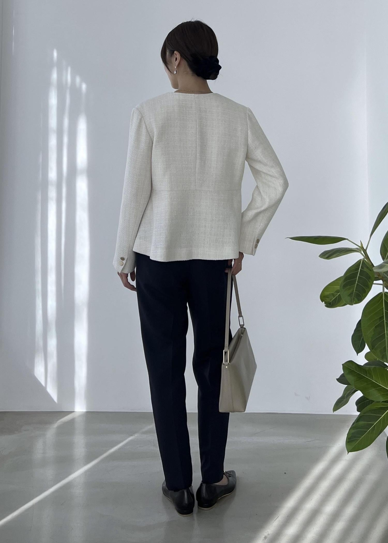 ぺプラムシルエットのツイードジャケットは、軽く柔らかい素材感で着心地も軽やか。