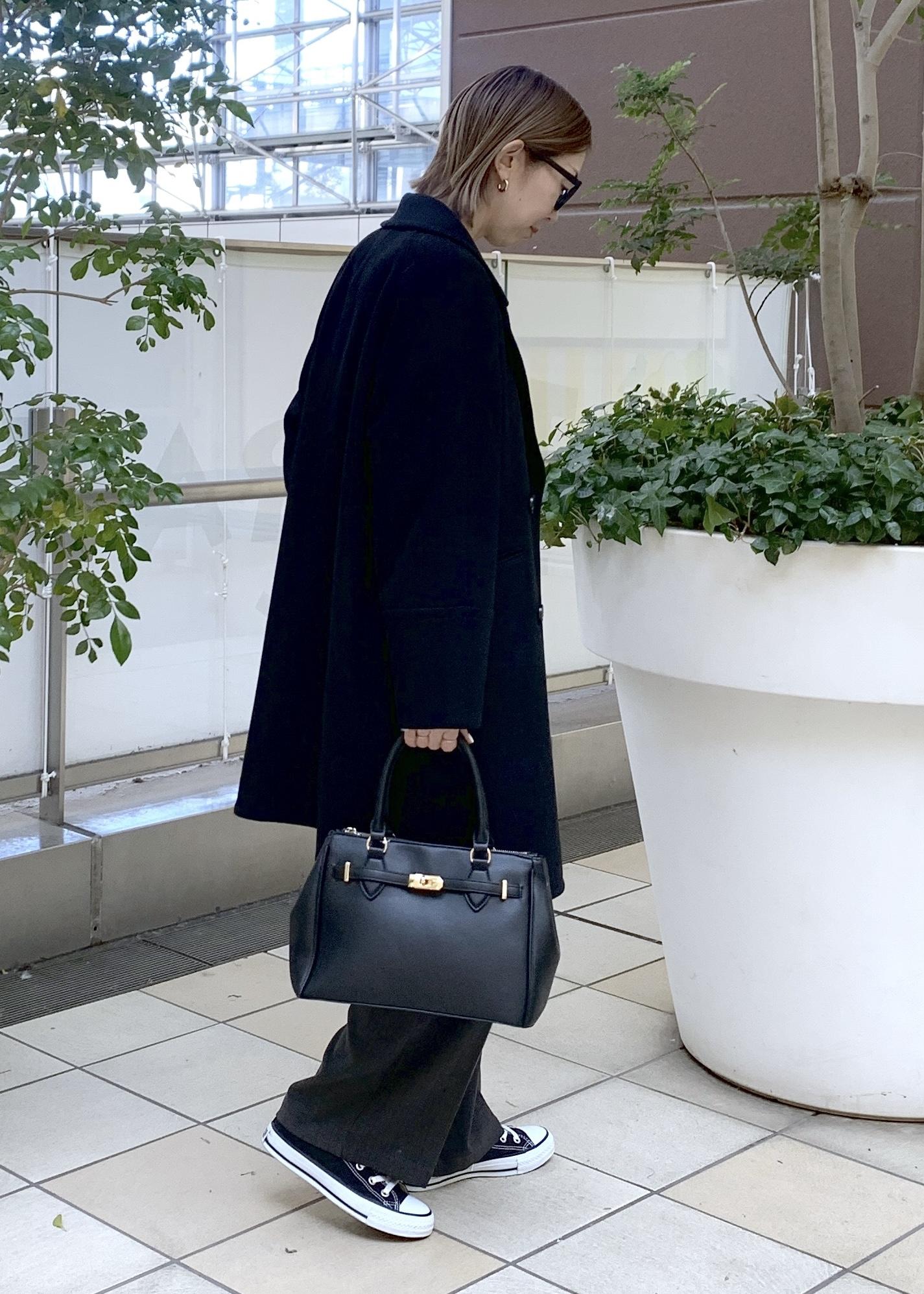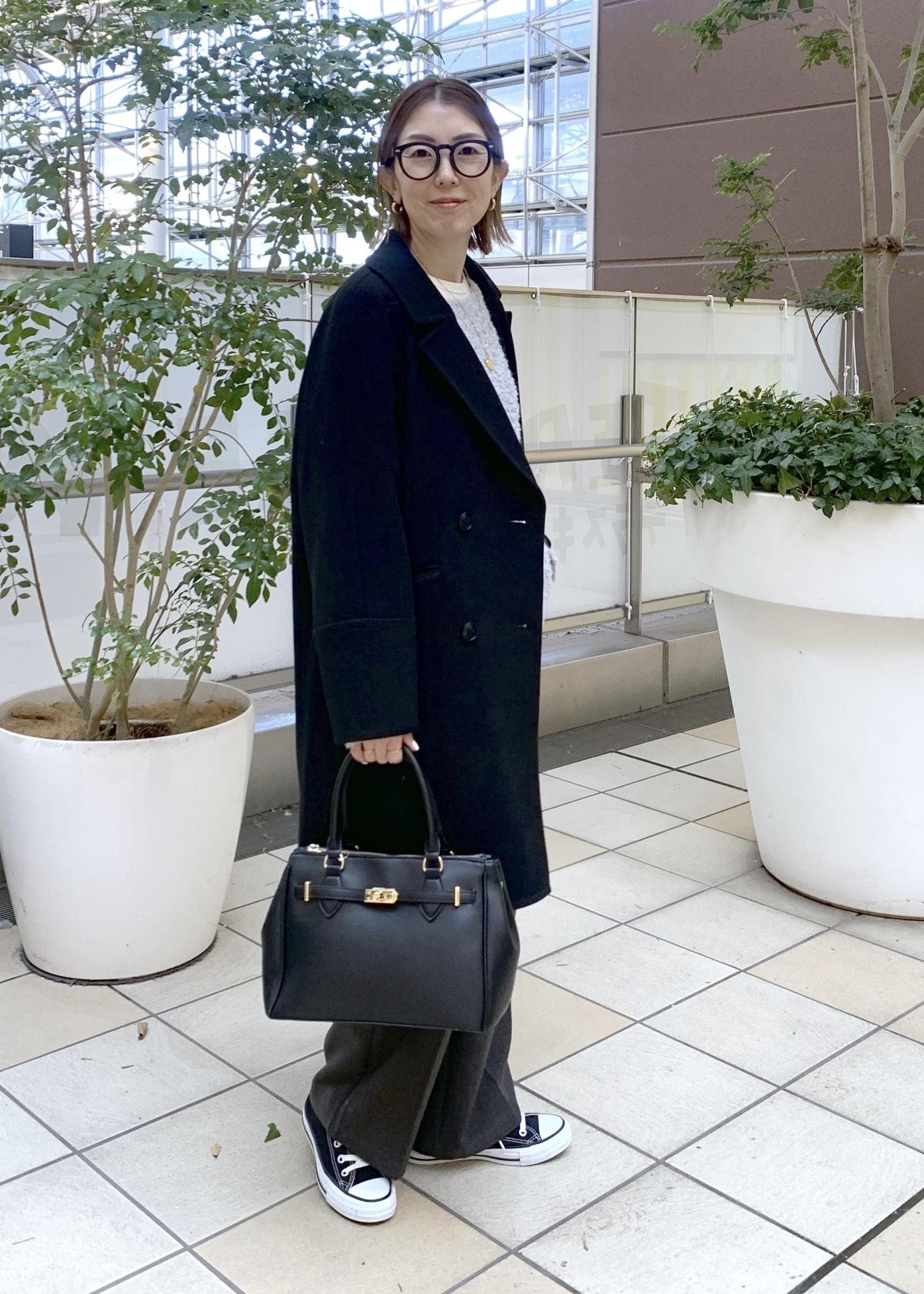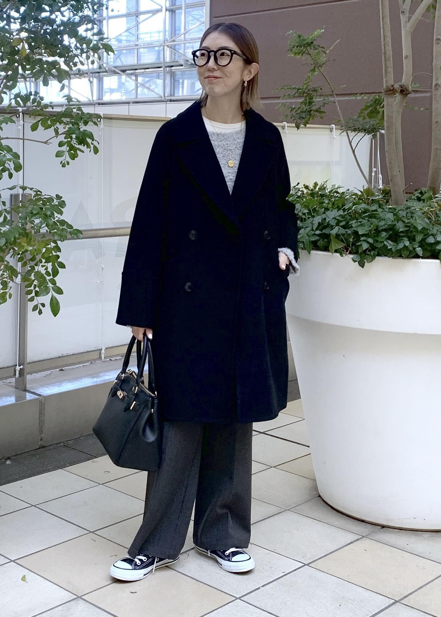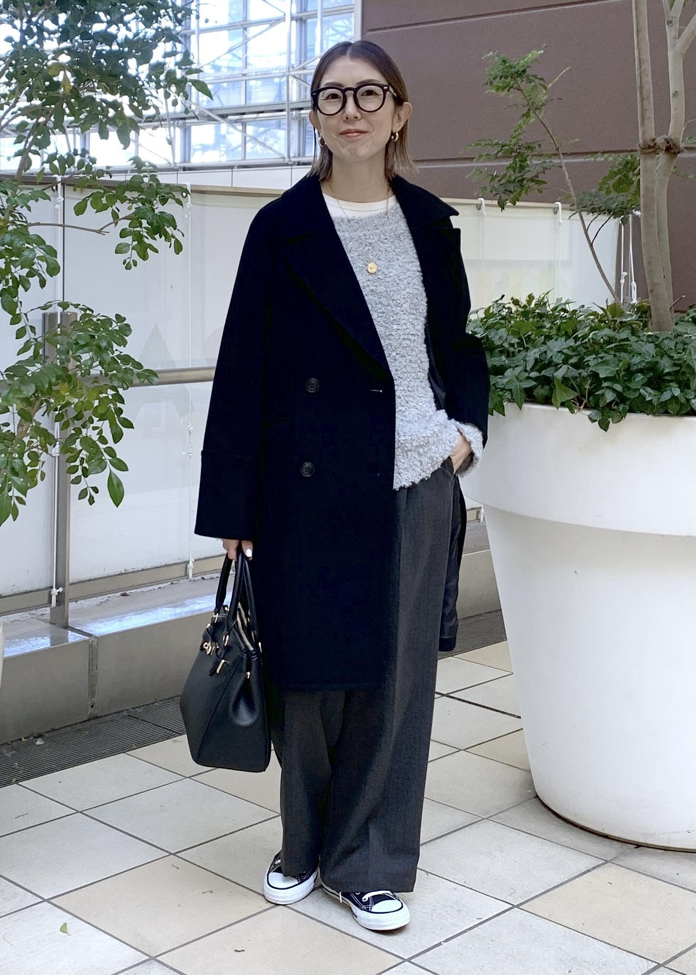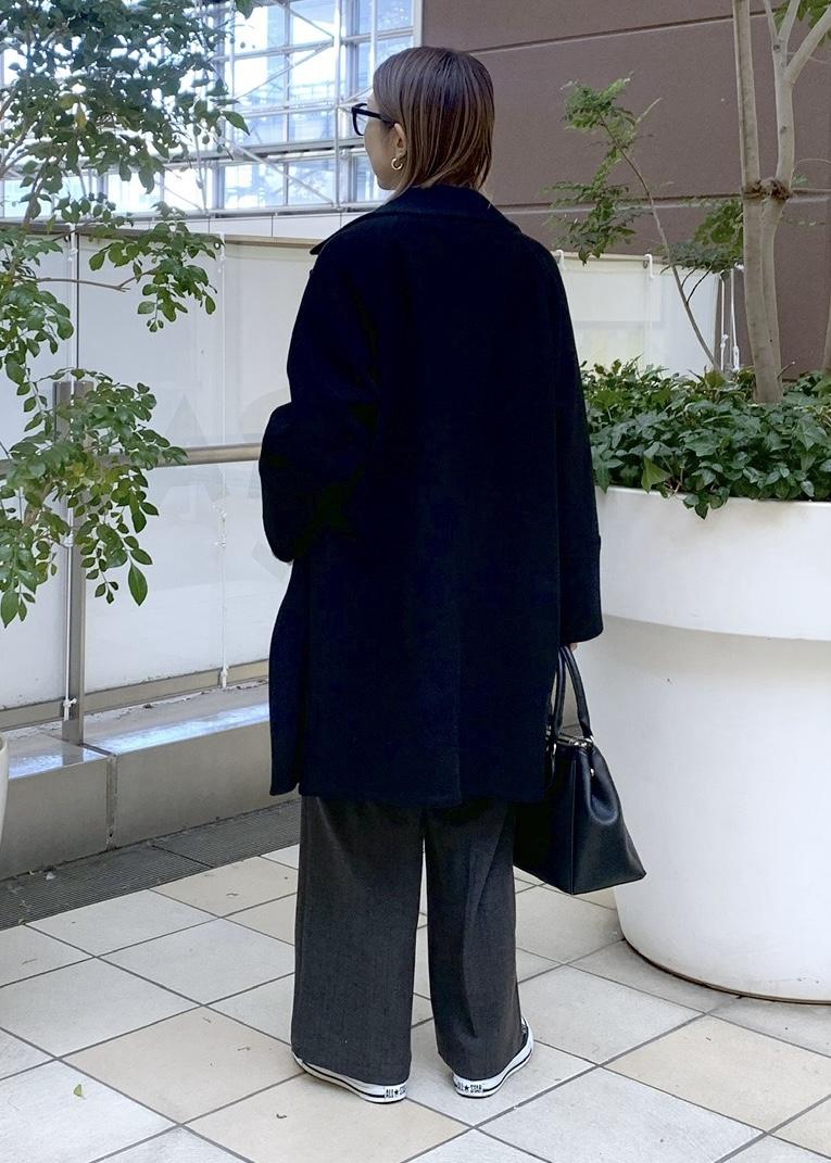 ベーシックカラーでまとめたミドル丈コートのシンプルカジュアルスタイリング。