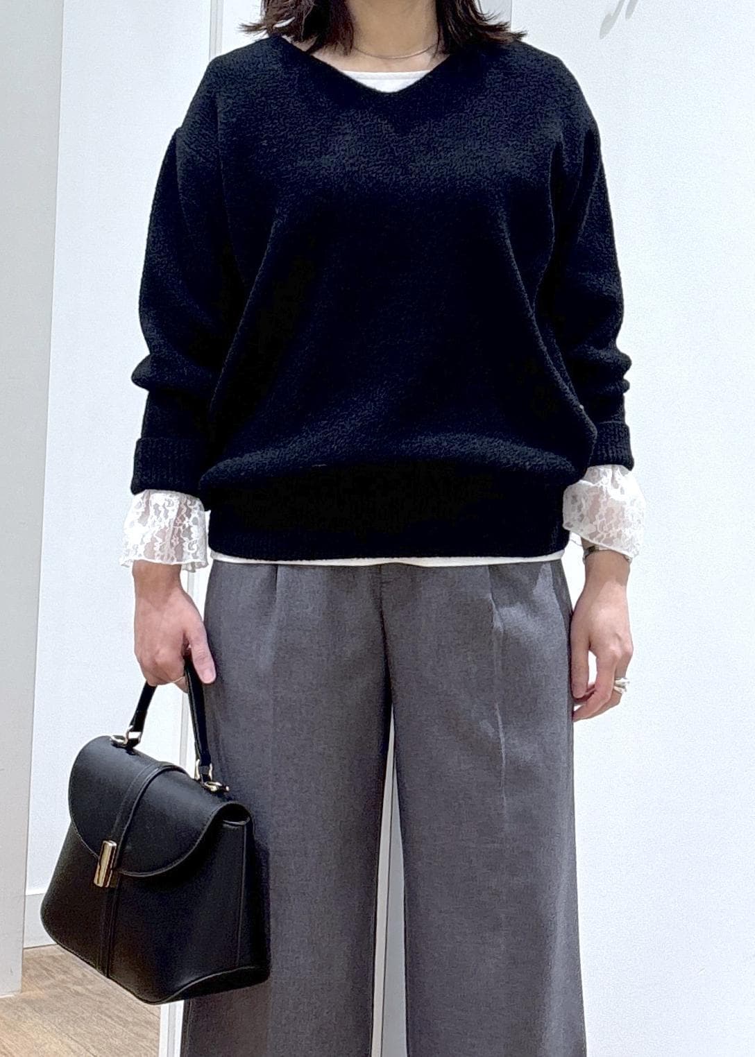 シンプルなVネックのデザインですが、ふわふわした素材や、ゆるっとしたサイズで抜け感が出て、女性らしく着ていただけるニットです。 -