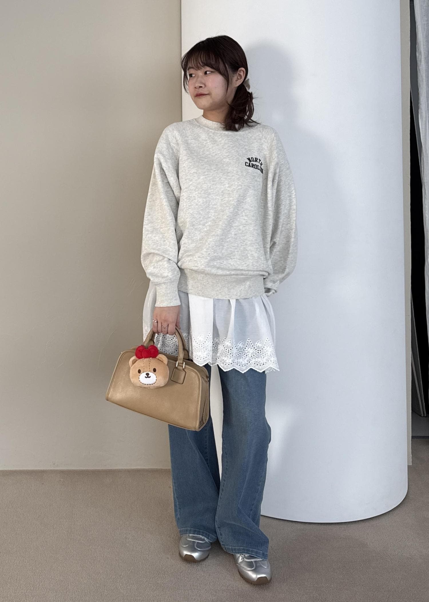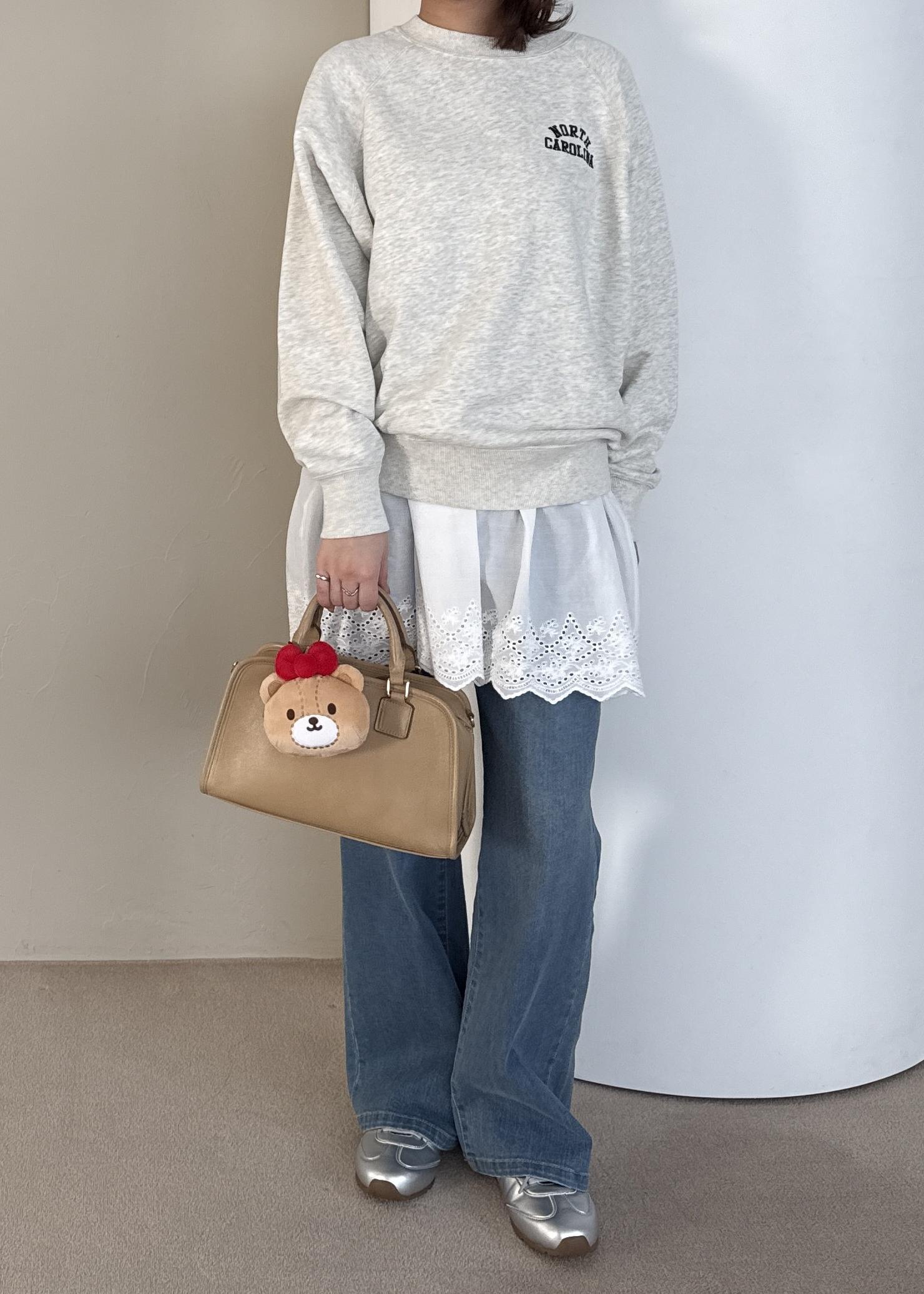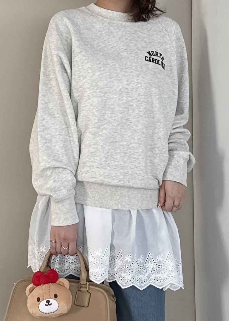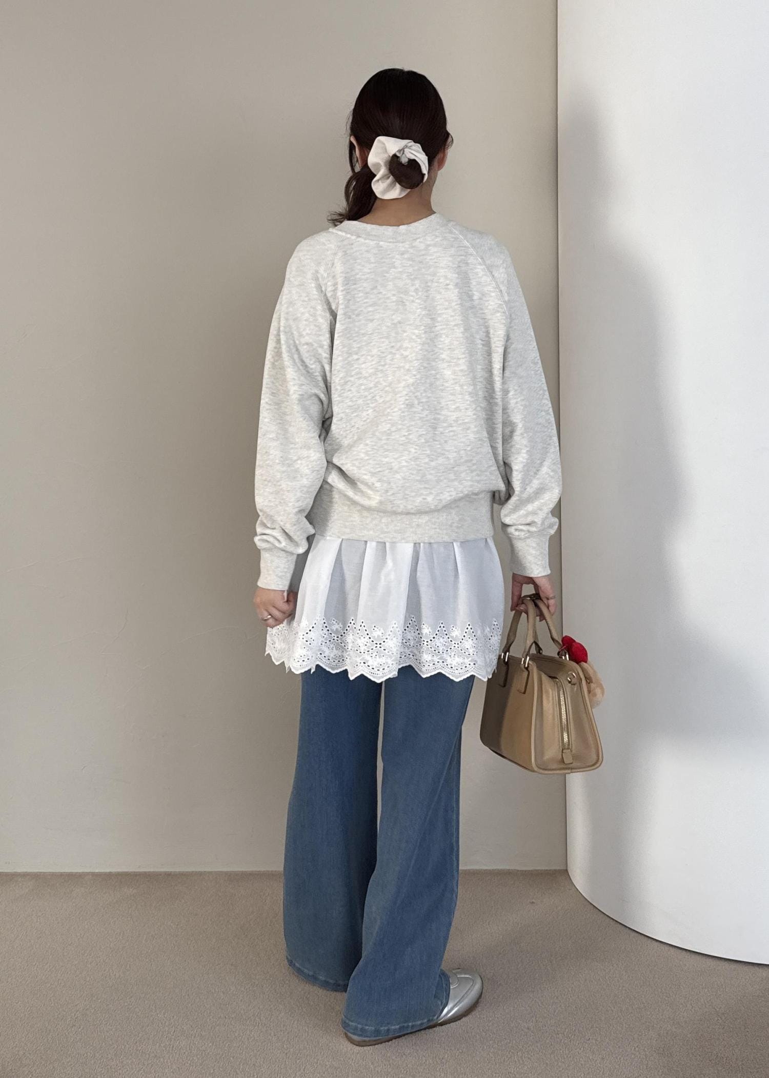 スウェット×レースの組み合わせにデニムを合わせた、ラフでカジュアルだけど可愛らしさのあるコーディネートです。