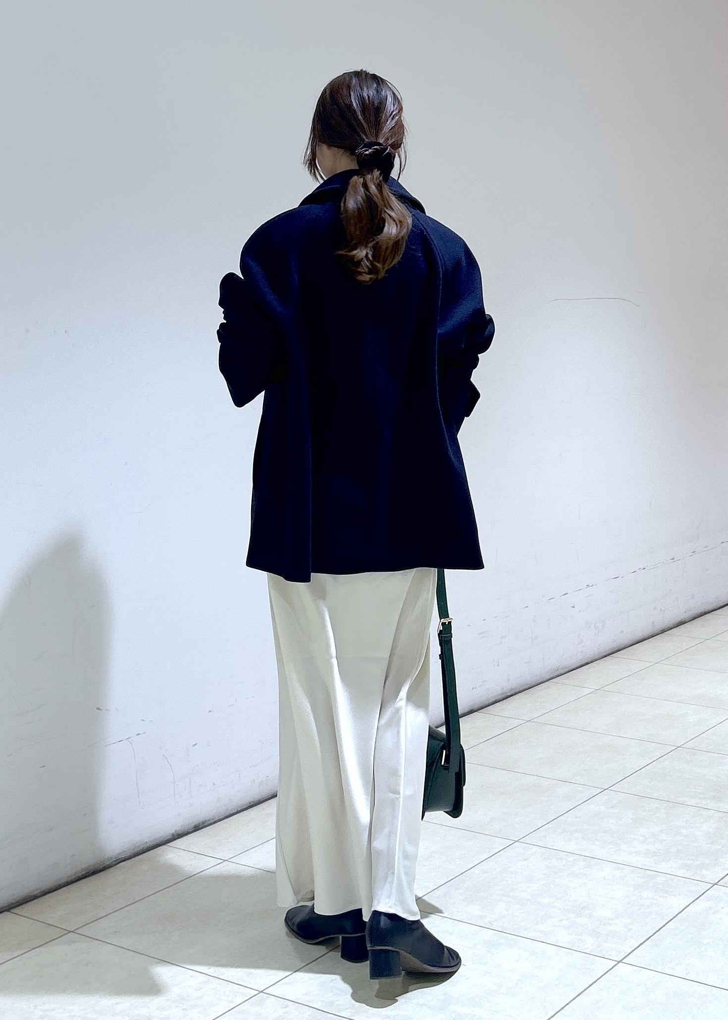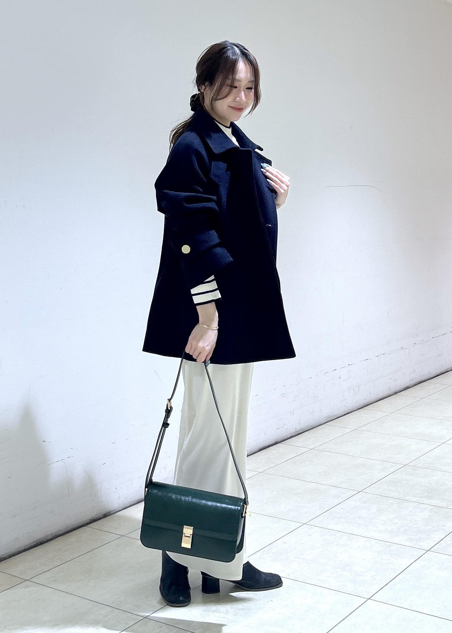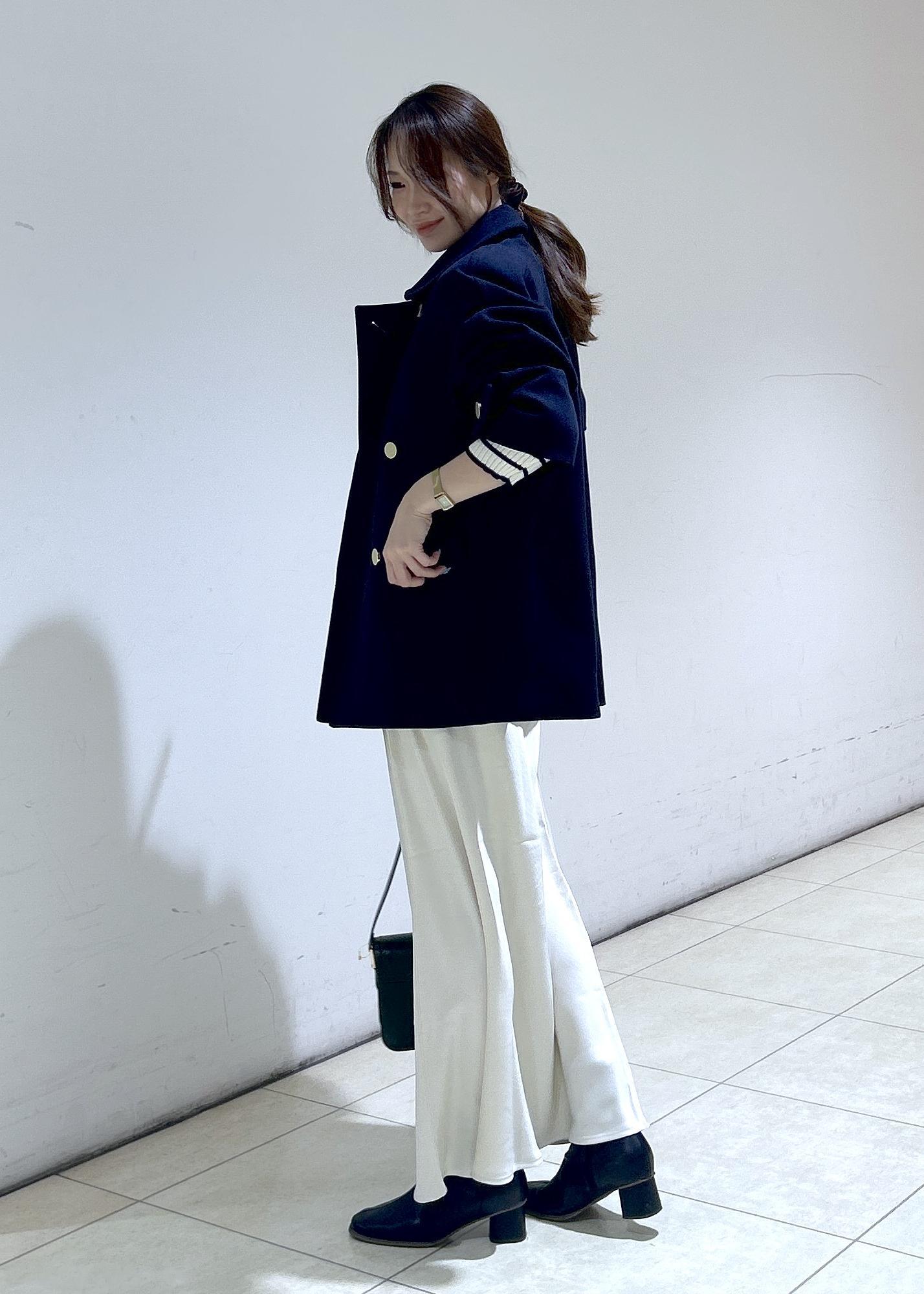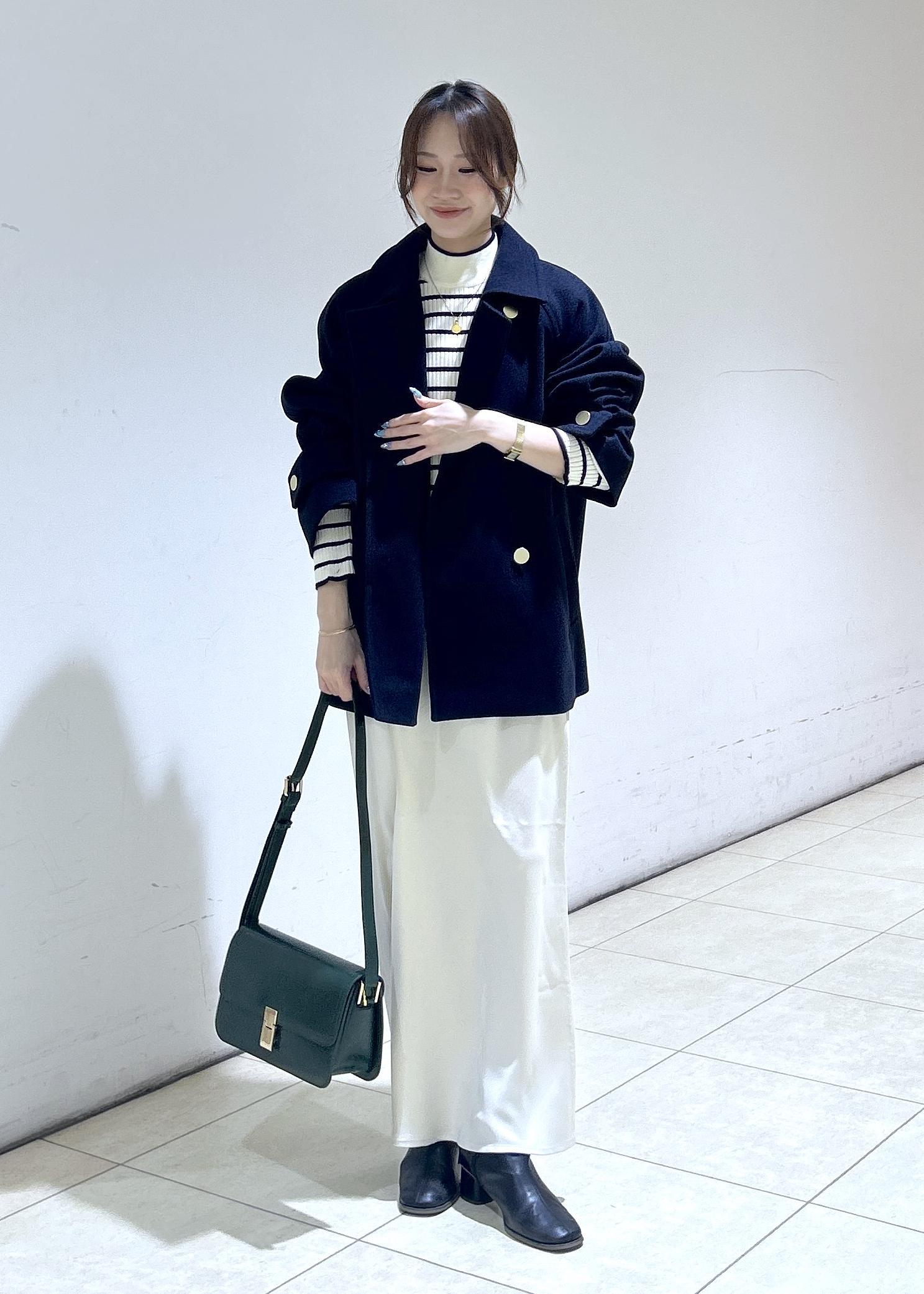 ネイビーのアウターにホワイトのスカートでキレイめな大人スタイリングにしました。