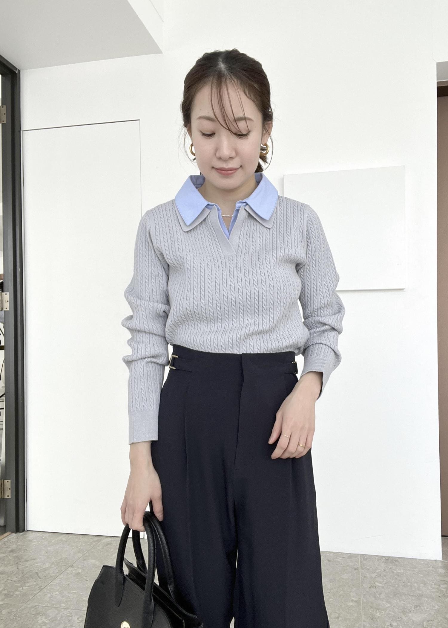レイヤードになった襟元がポイントのニットに、ネイビーのワイドパンツを合わせました!