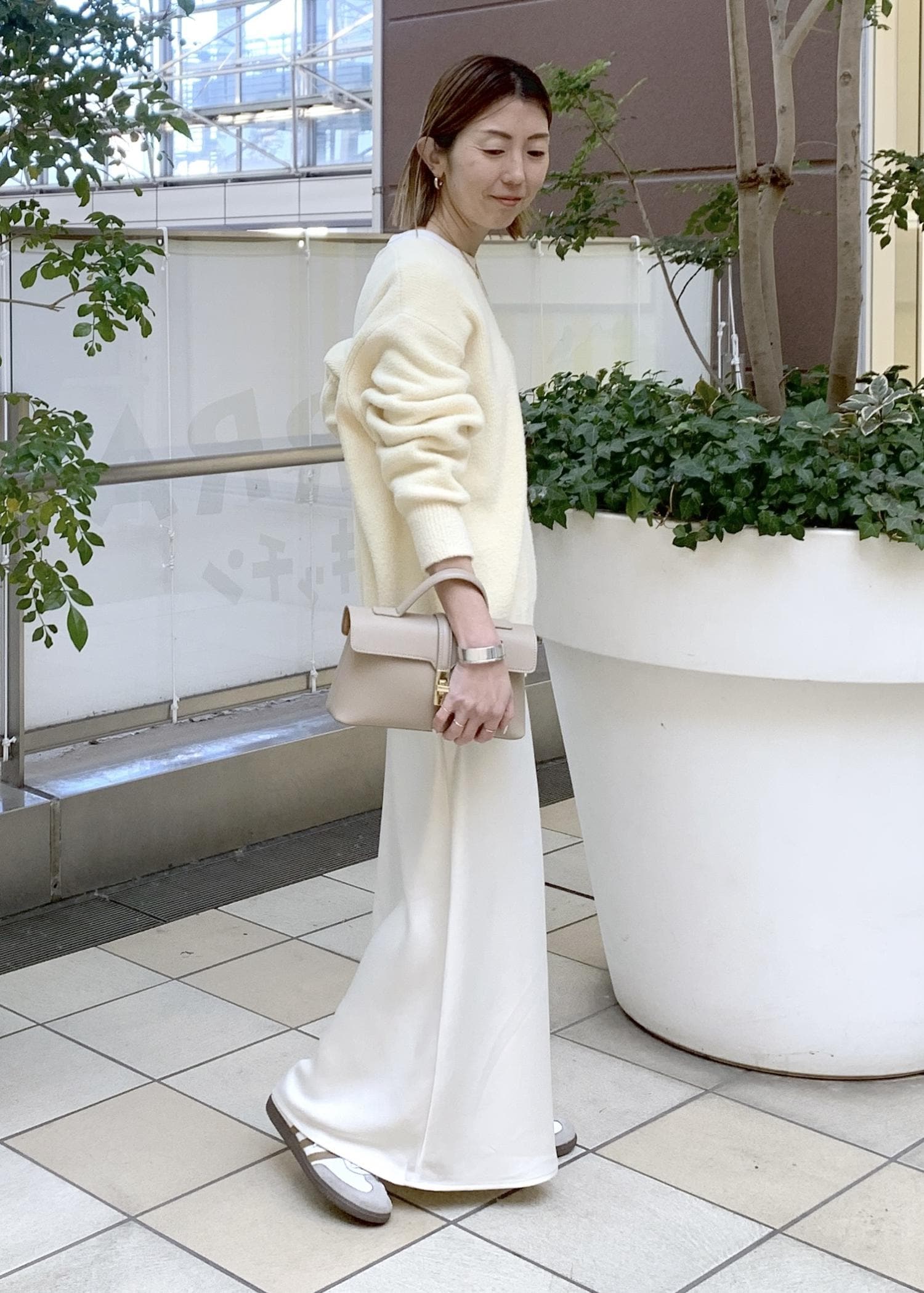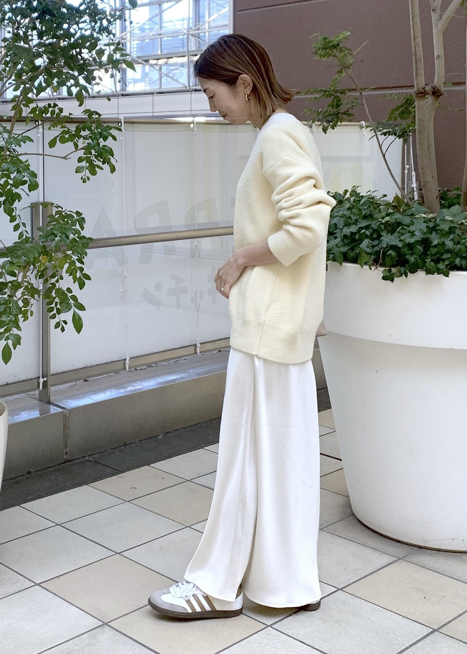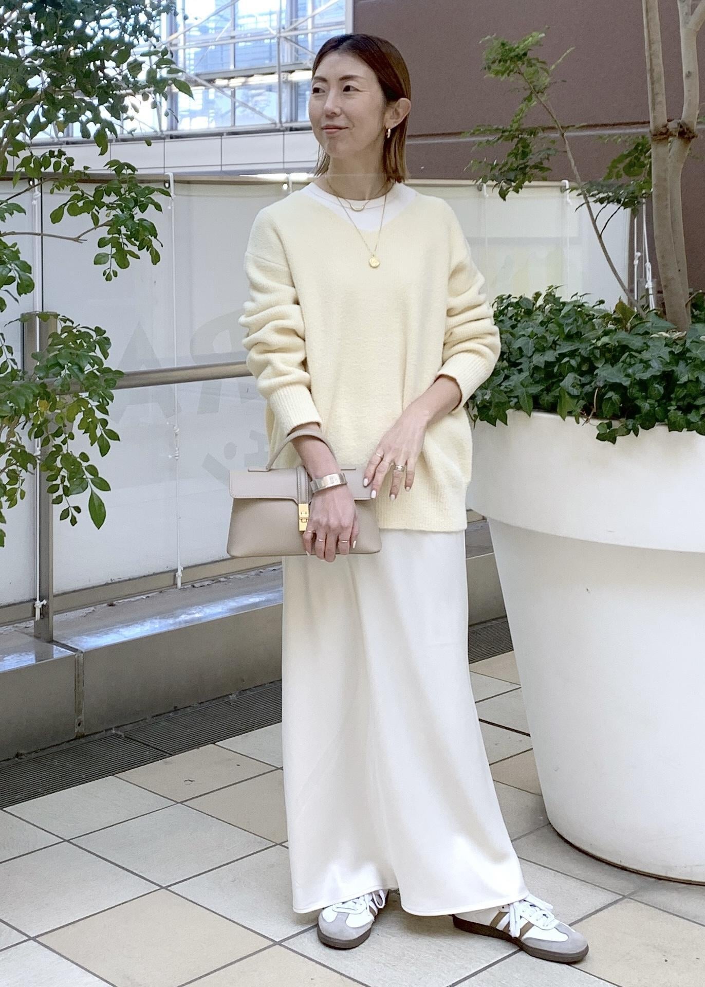 上品な光沢感のあるサテンスカートを合わせた大人スタイリングです