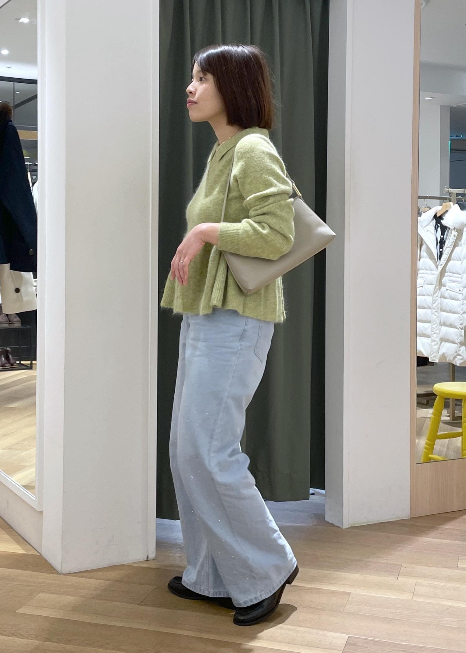 グリーン×サックスブルーの合わせで、爽やかさもあり春コーデにもぴったりです◎