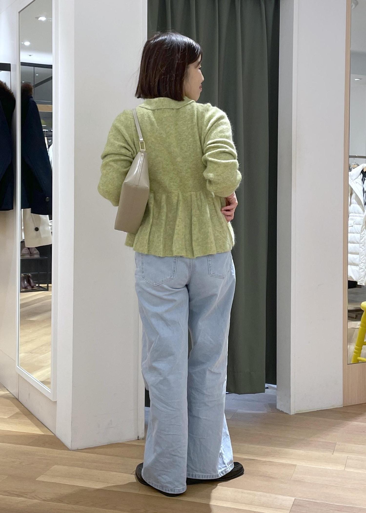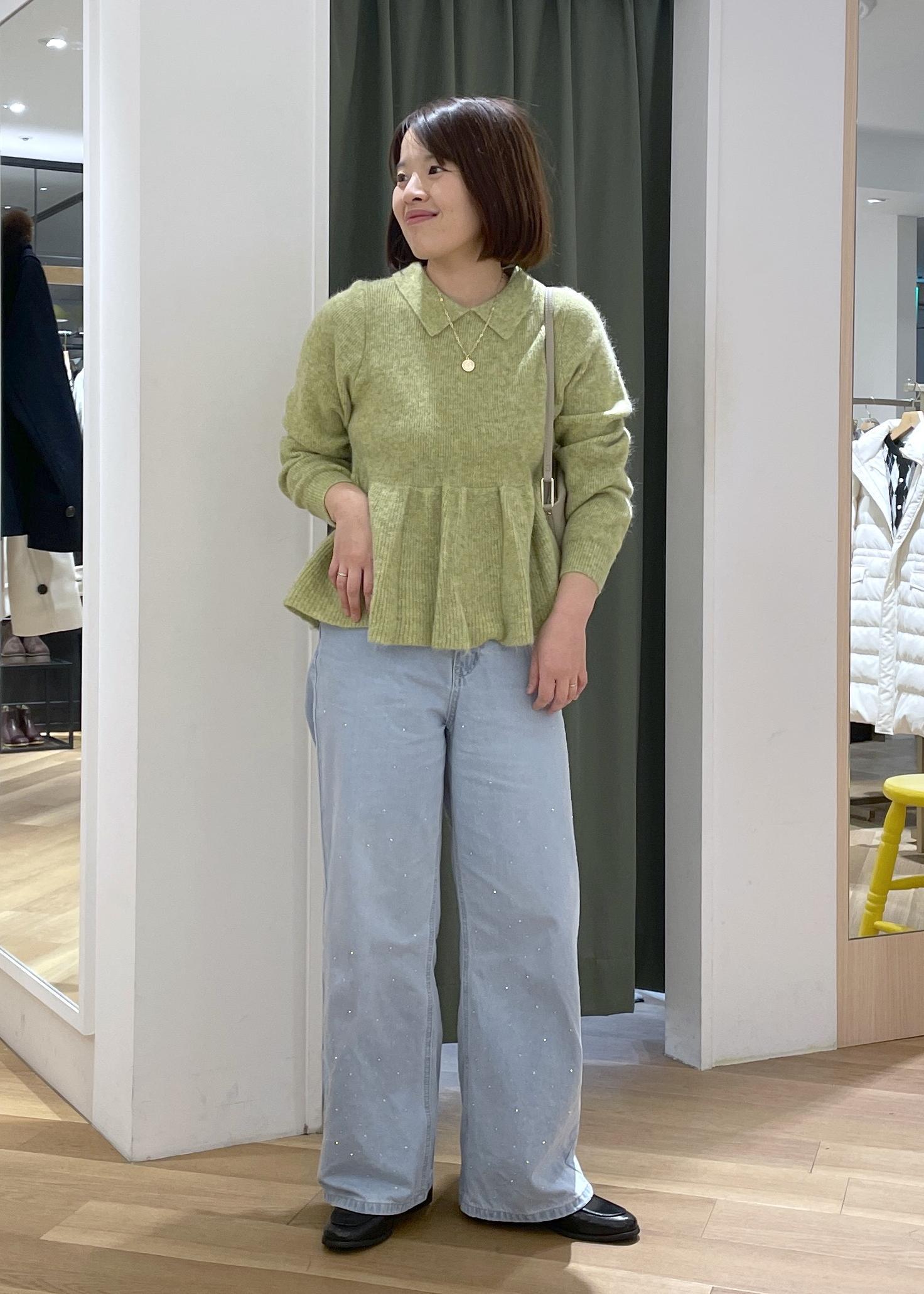 ふんわり広がるペプラムが可愛いグリーンのニットに、ビジューデニムを合わせた、可愛らしさのある大人カジュアルコーデです!