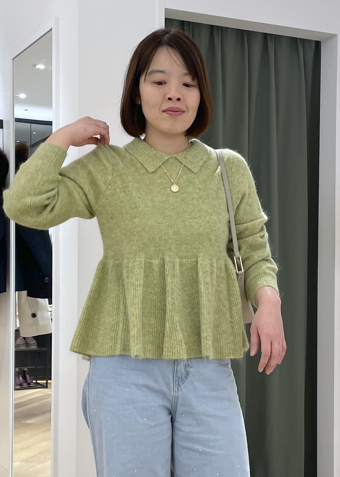 ROPÉ PICNICアンゴラ混ペプラムニットキミドリ / F¥5,995レビューアンゴラ混のニットでふんわりと軽く温かなニットです。素肌に着てもそこまでチクチクせずに着用できました。身頃はゆったりとしたサイズ感で、ボディラインを拾わずに着用できます。着丈は腰がしっかり隠れる長さです。ペプラムデザインなので、腰回りをカバーしつつお洒落見えも叶えてくれるニットです。