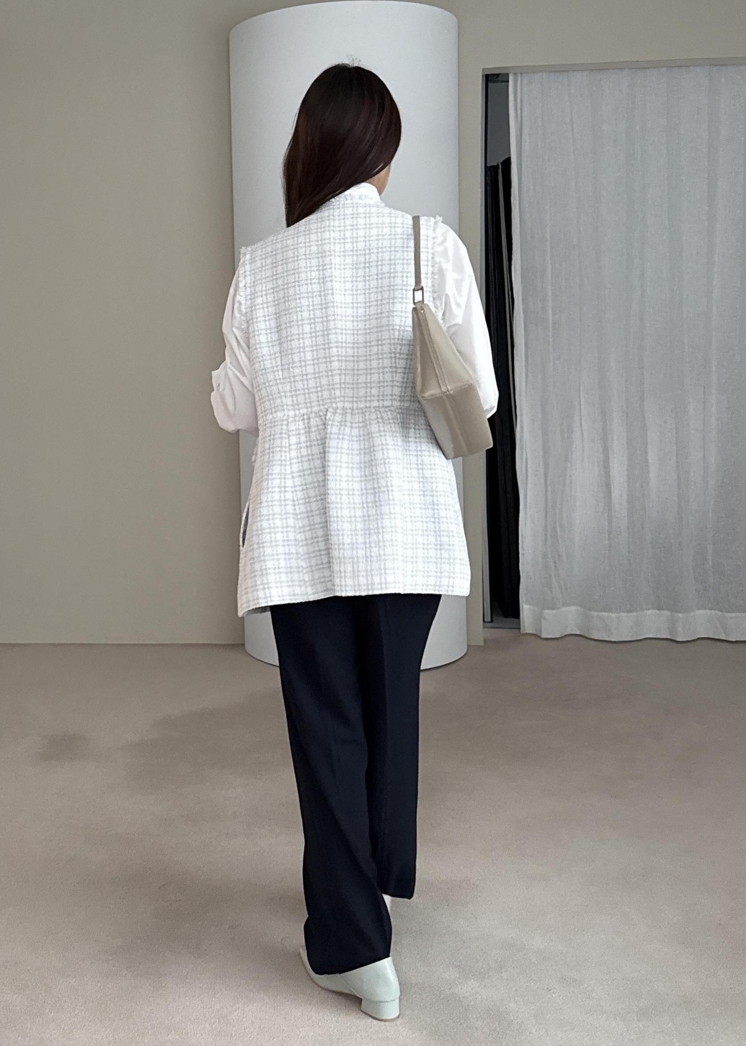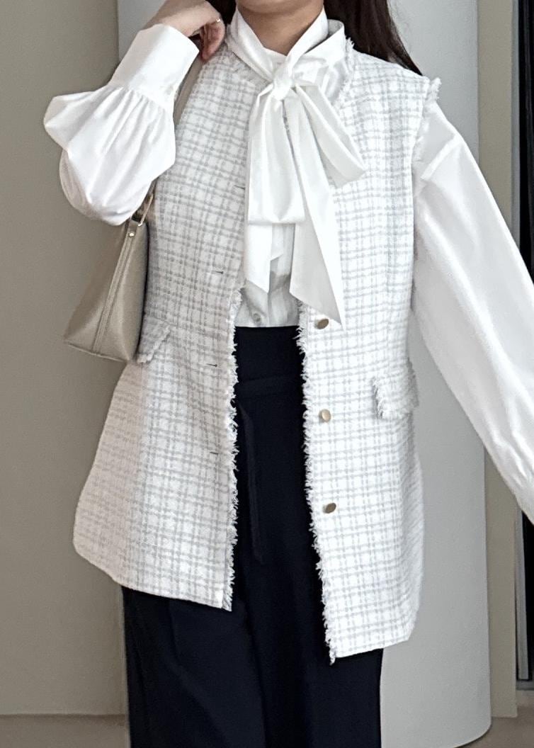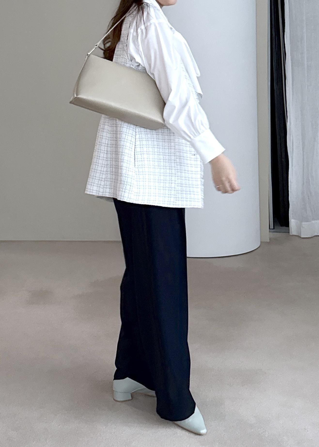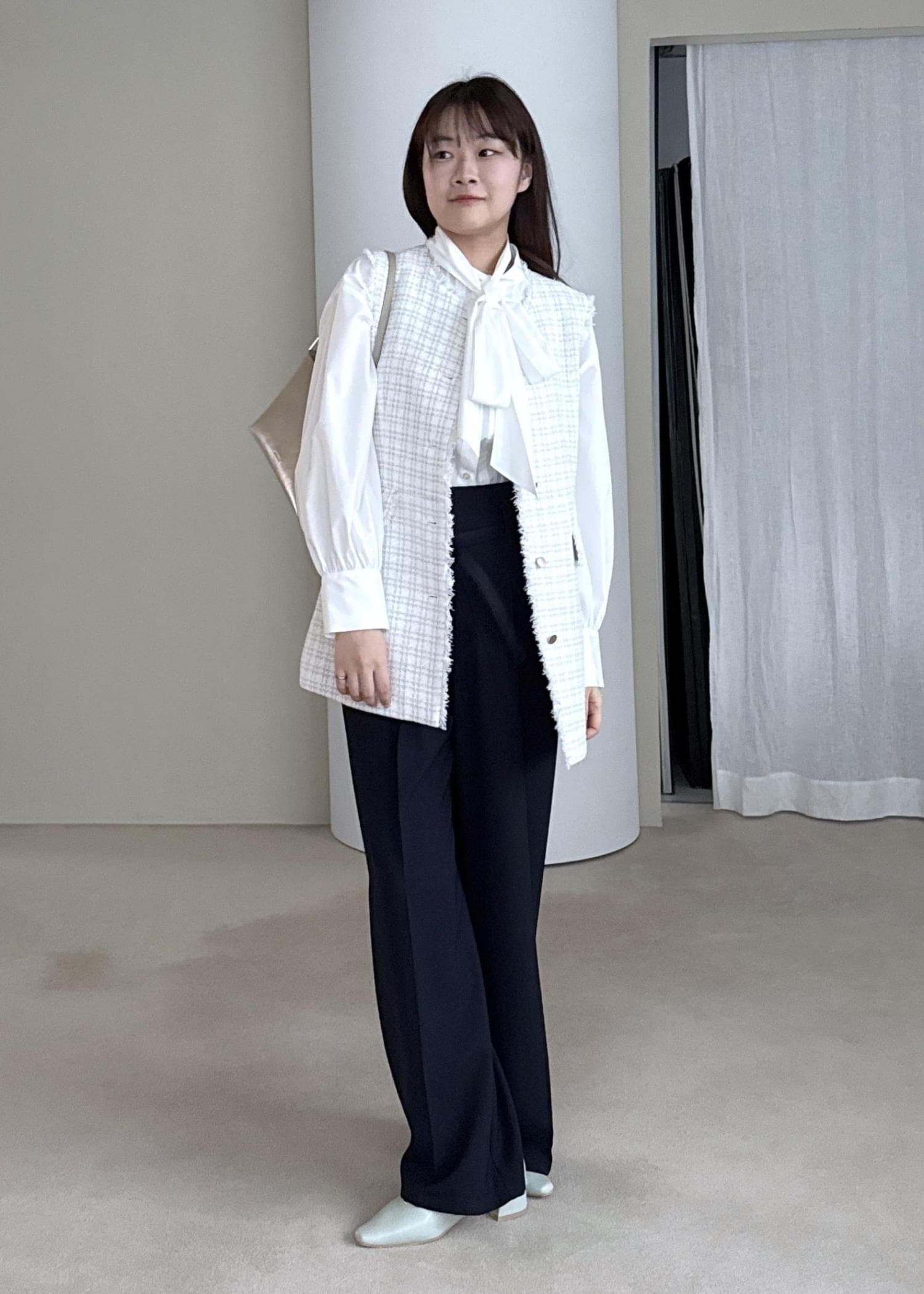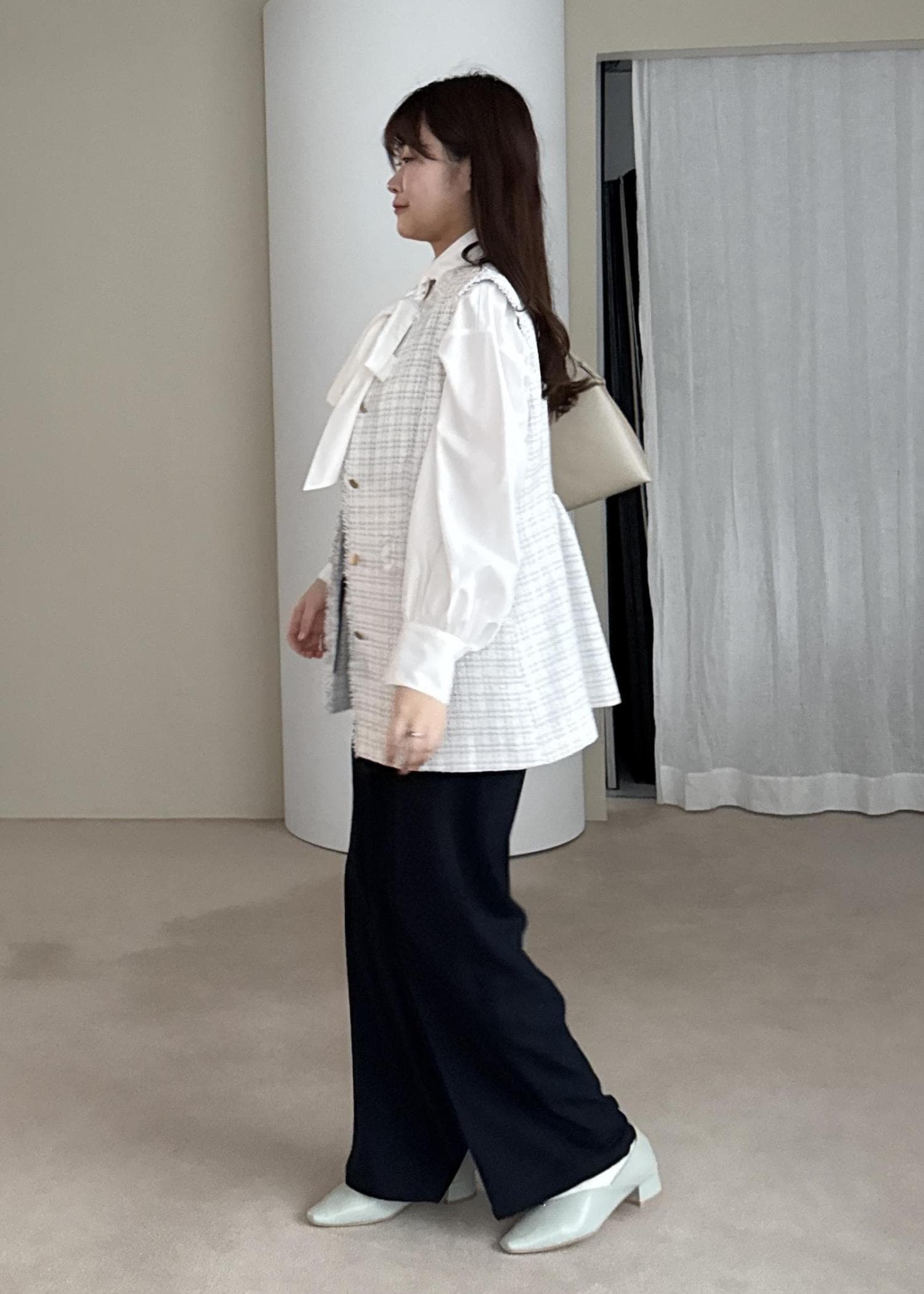 ツイードジレでかしこまりすぎず、ボウタイブラウスで華やかさをプラスしたセレモニーコーデです。