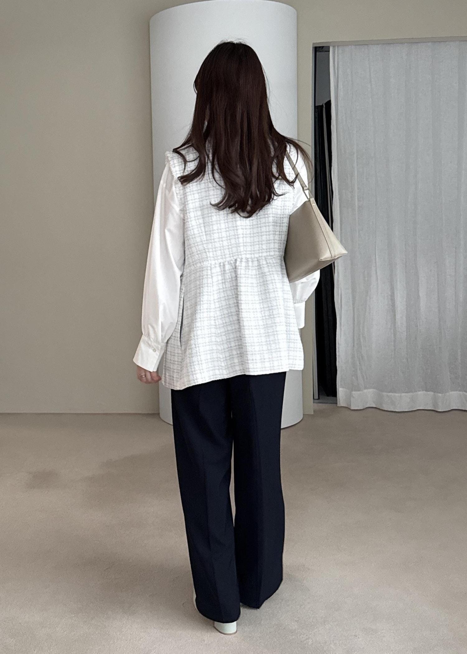 ブラウスのフロントはピンタックデザインになって、シンプルになりすぎないのも嬉しいポイント。 -
