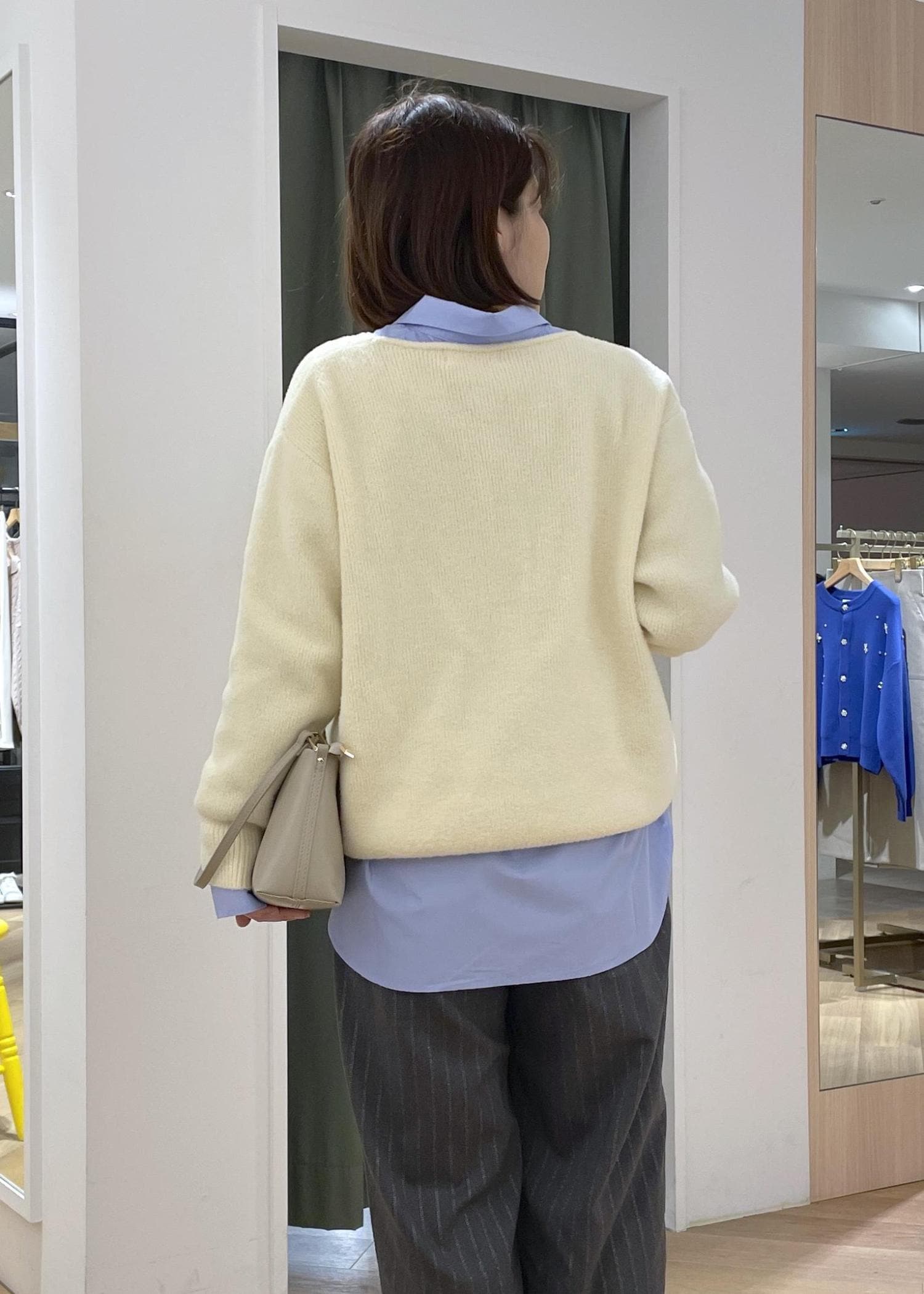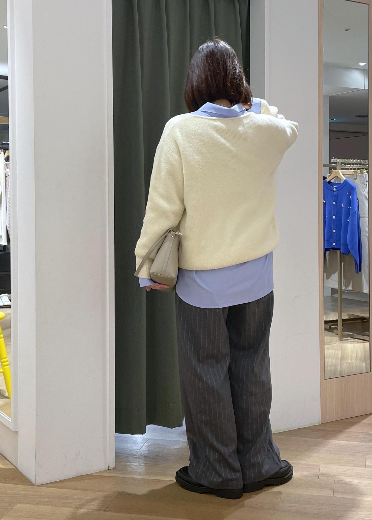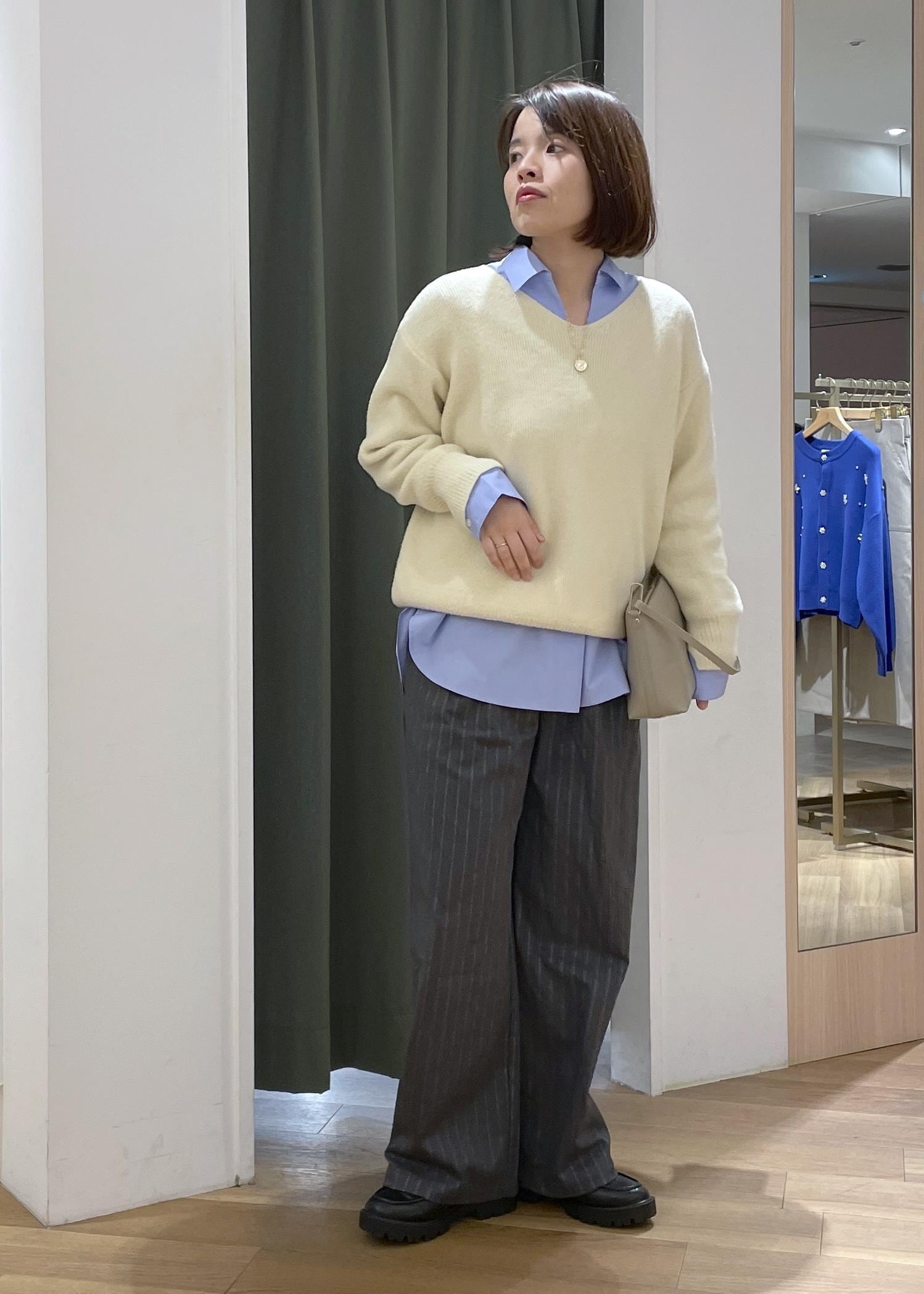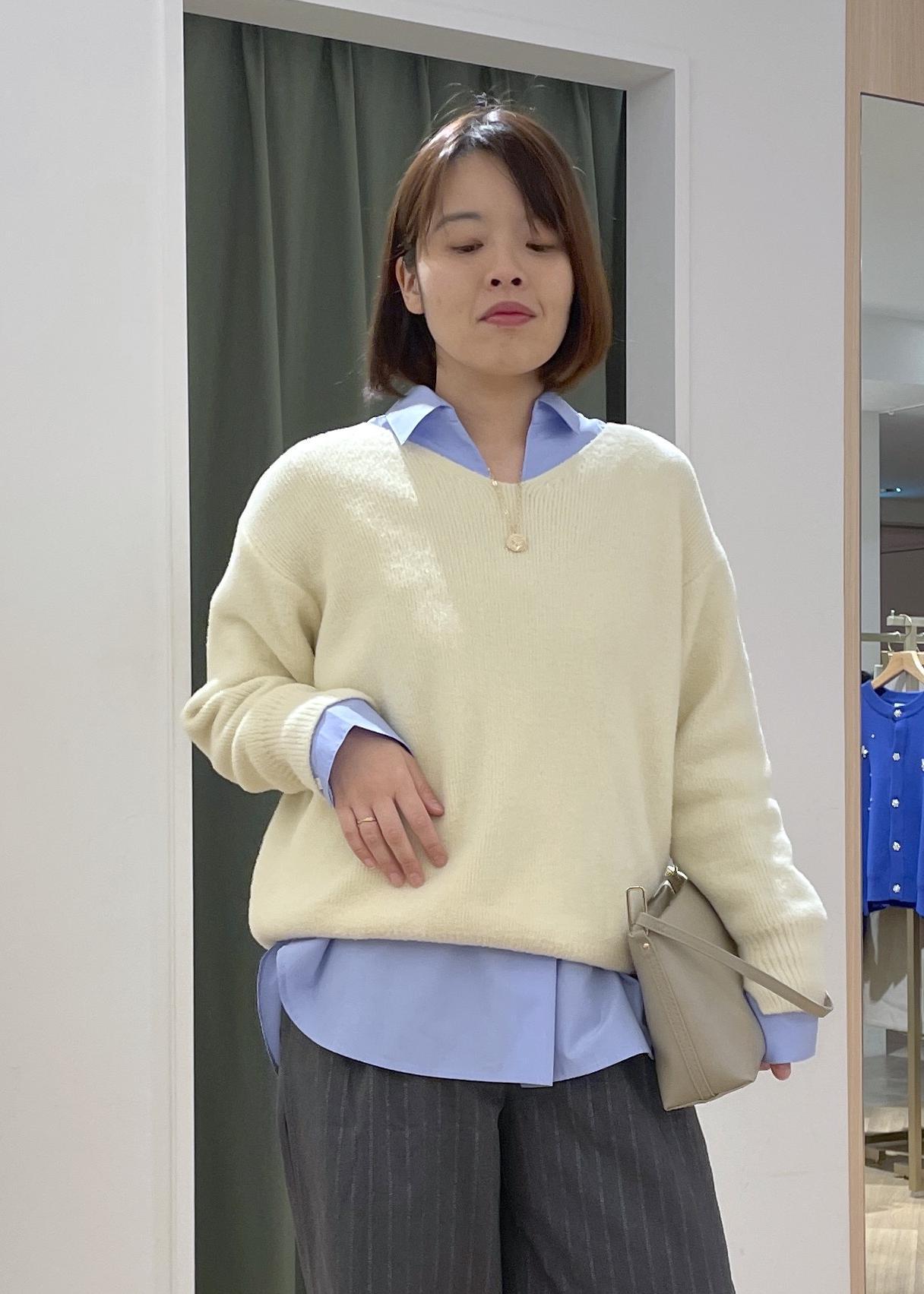 クリームイエローが可愛いもちふわニットに、ブルーシャツレイヤードして、少し知的なカジュアルコーデに◎