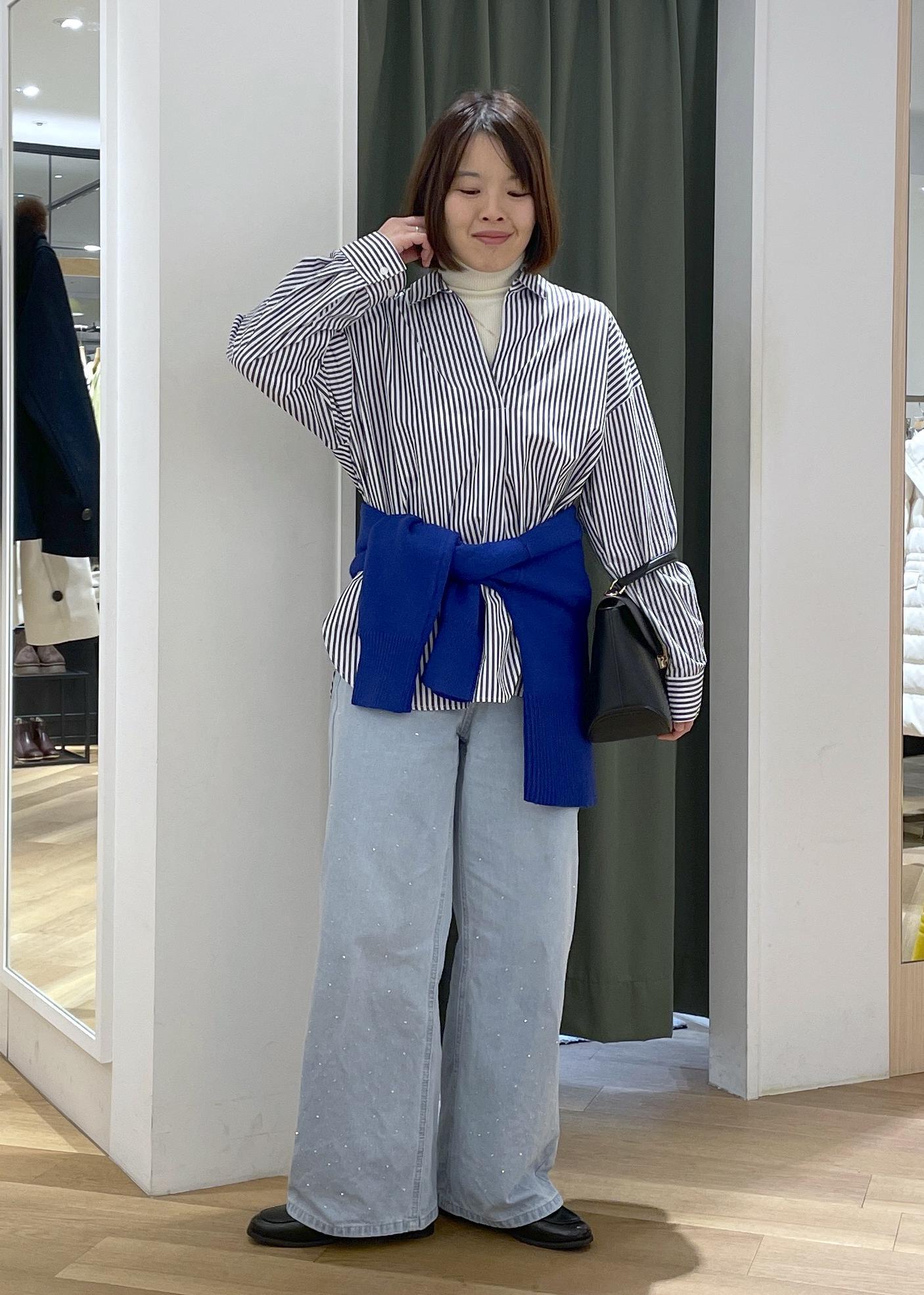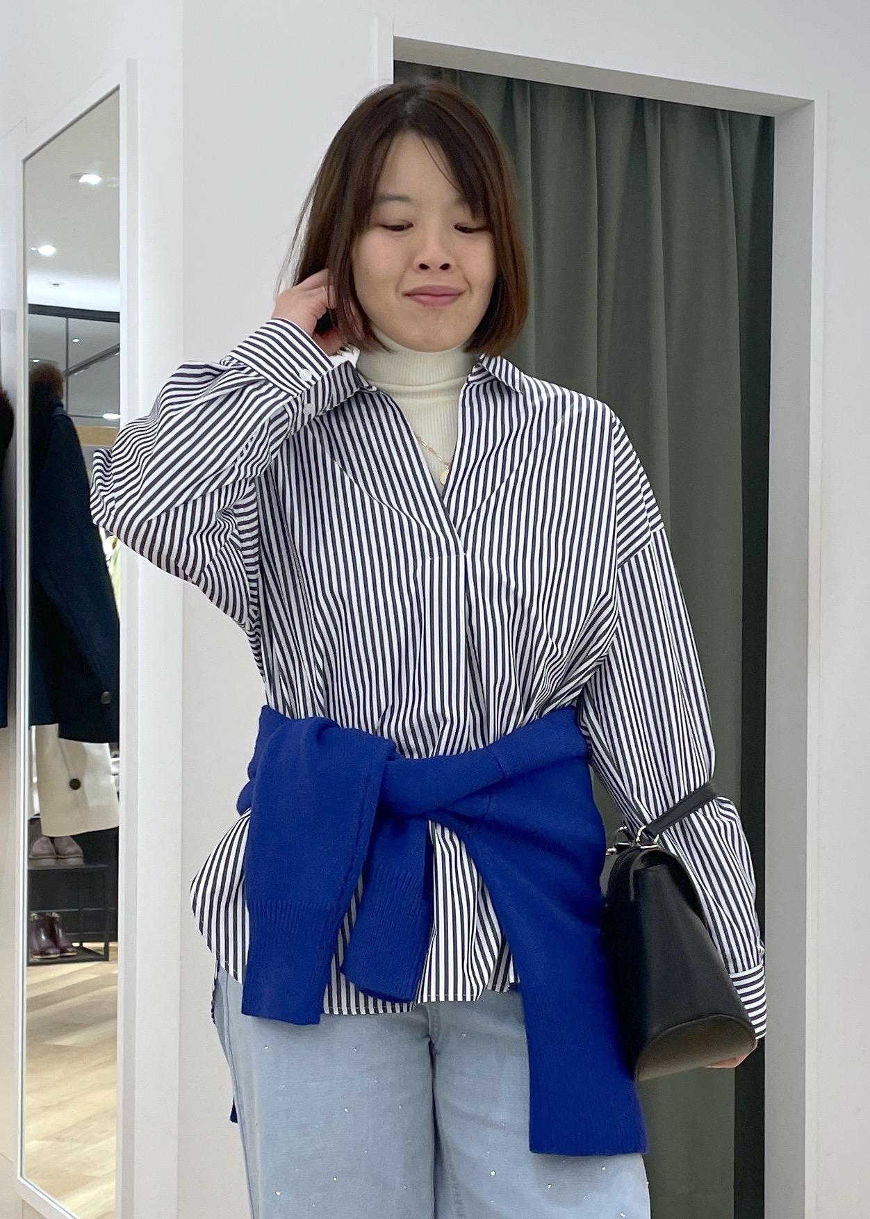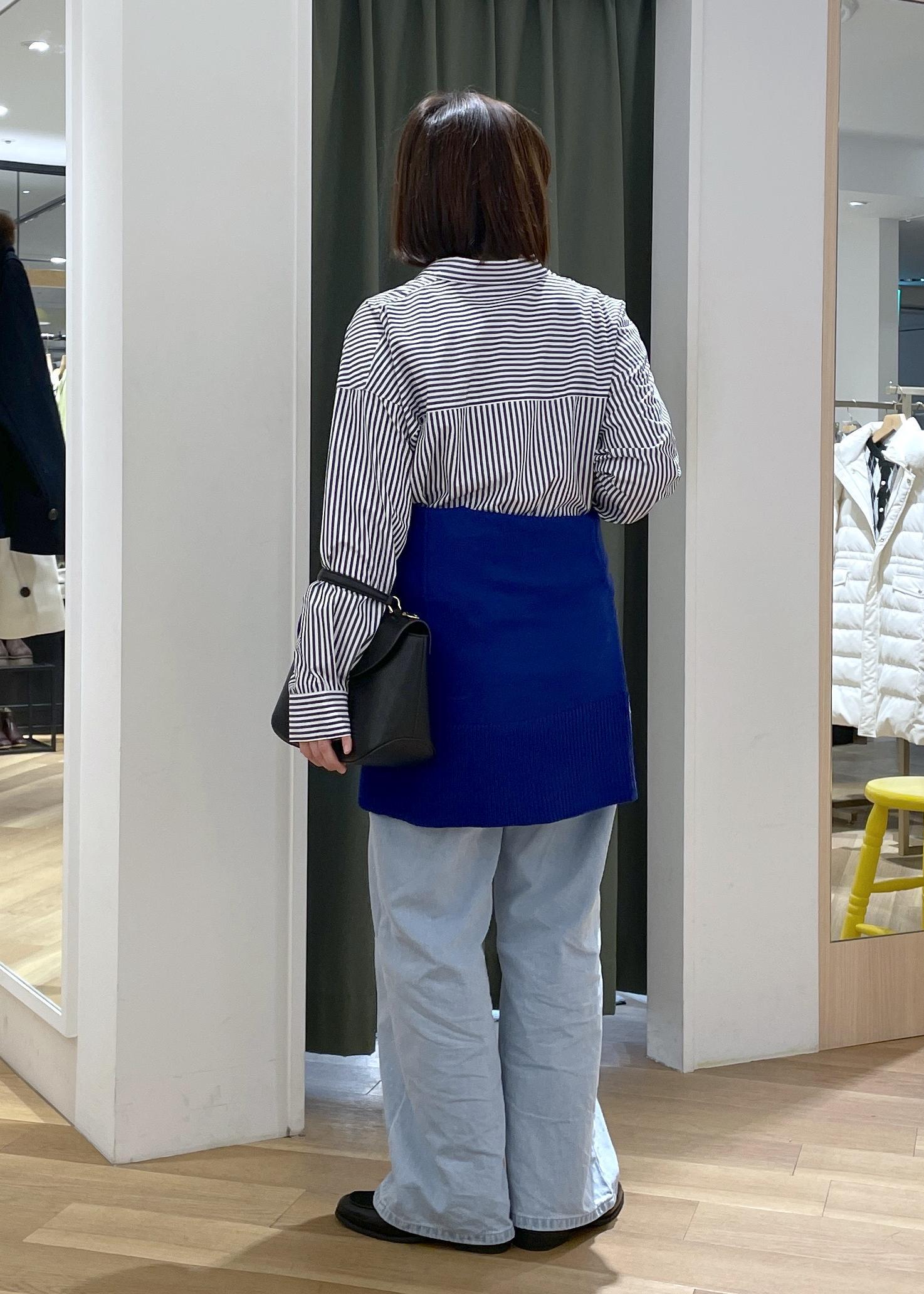 ゆるっとしたスキッパーシャツにブルーのニットを腰巻きした、メリハリのあるシャツコーデです!