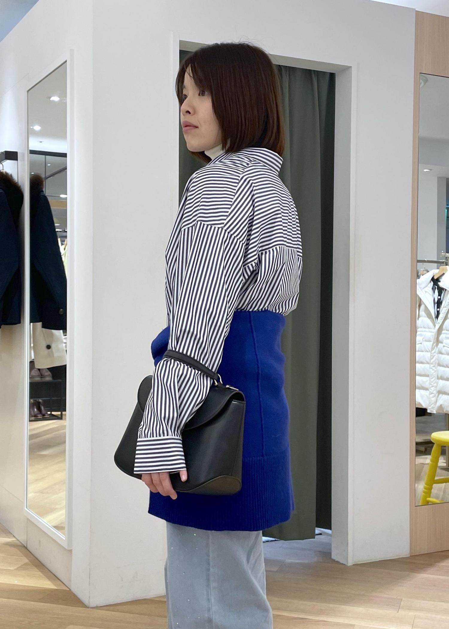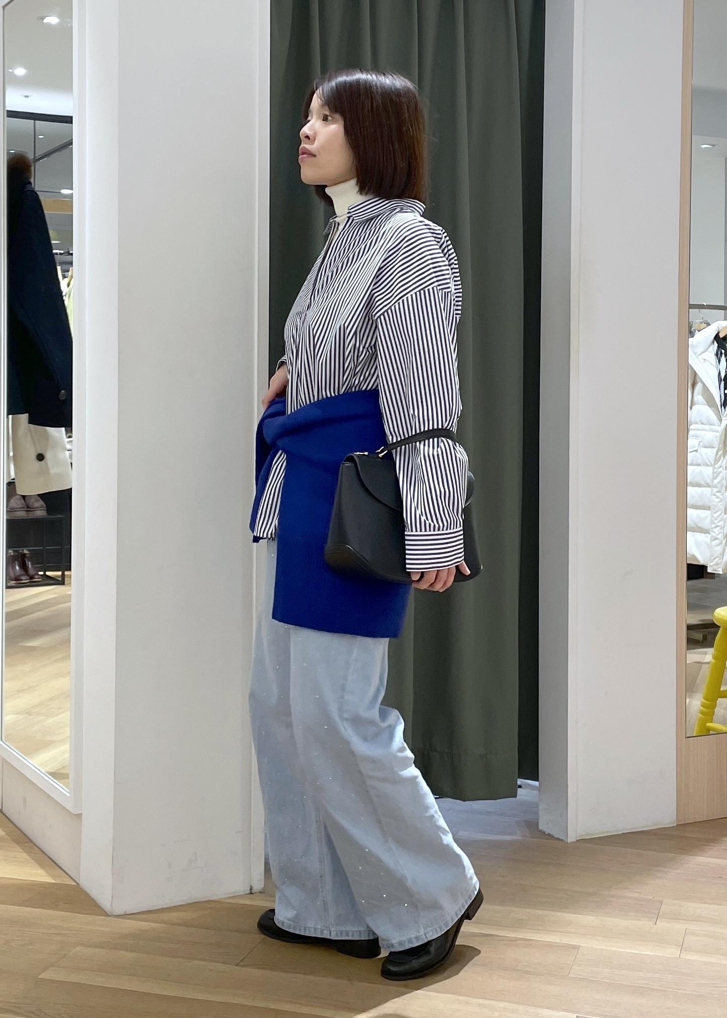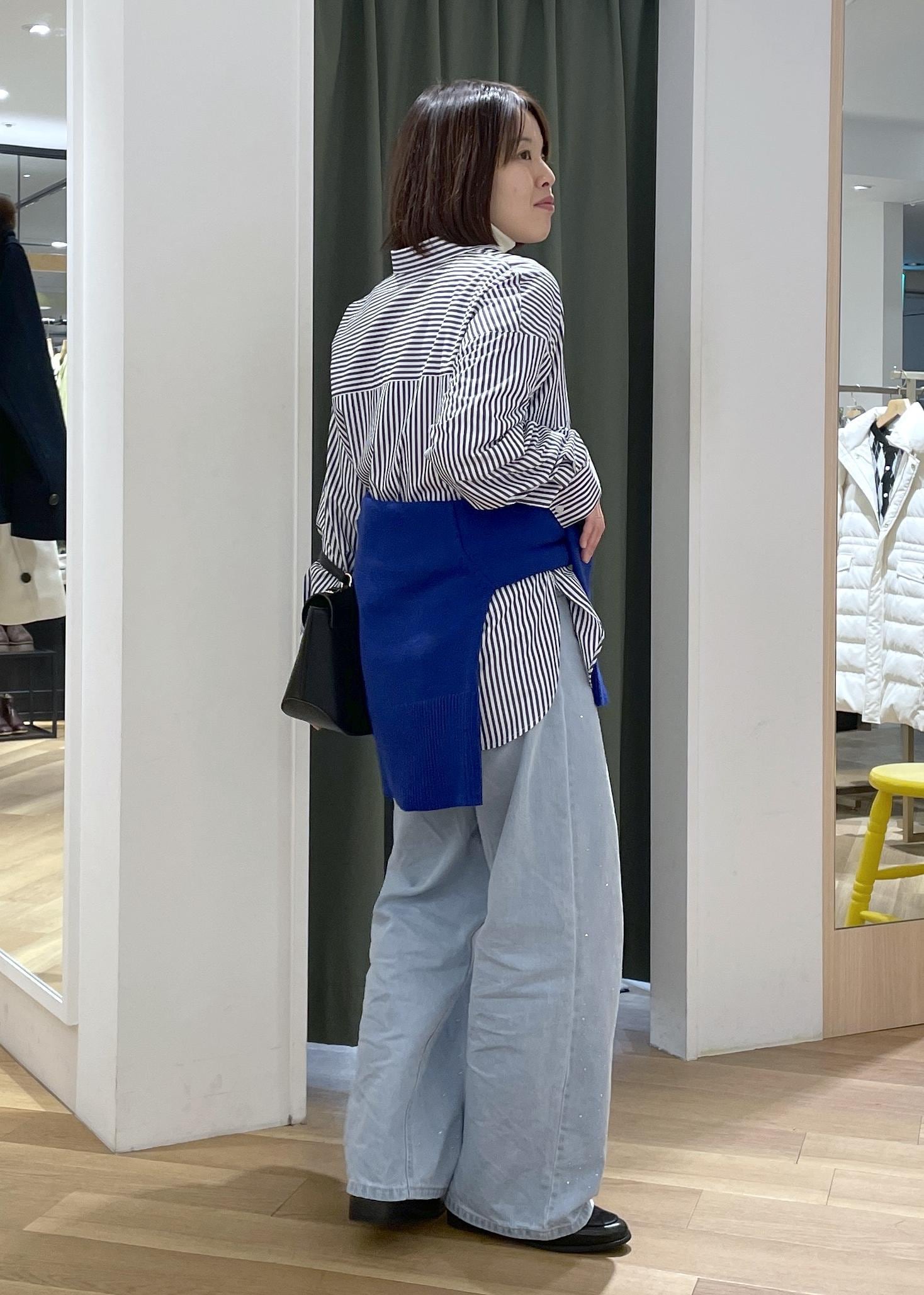ゆるっとしたスキッパーシャツにブルーのニットを腰巻きした、メリハリのあるシャツコーデです!