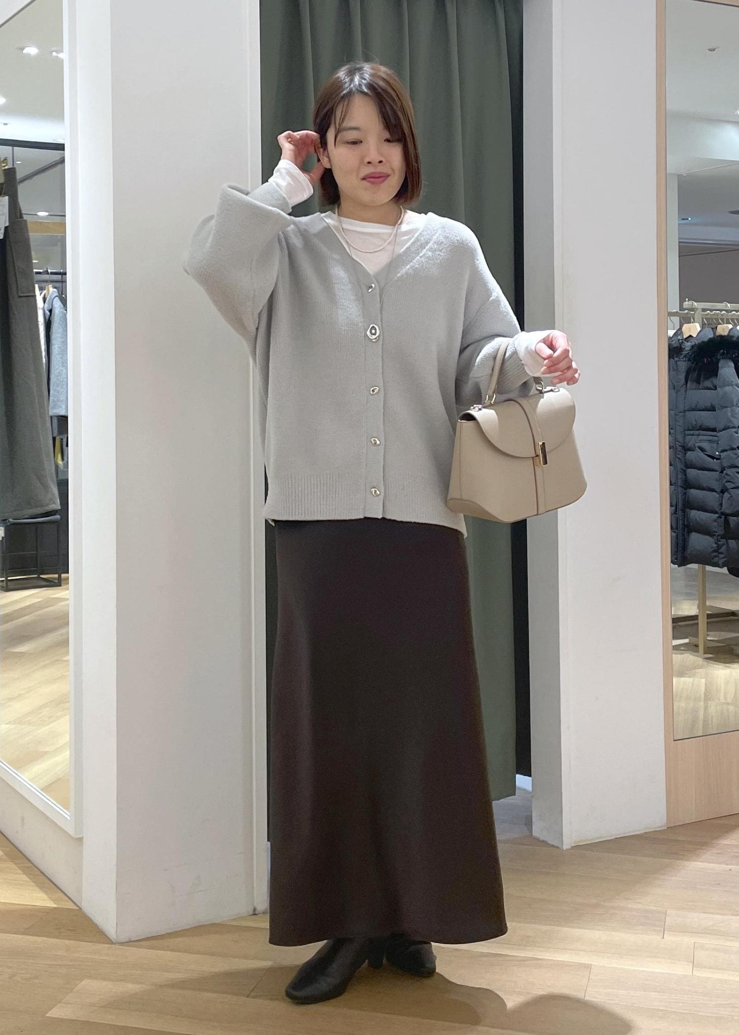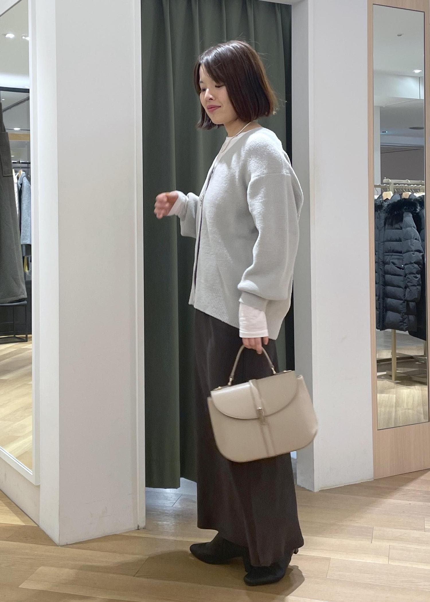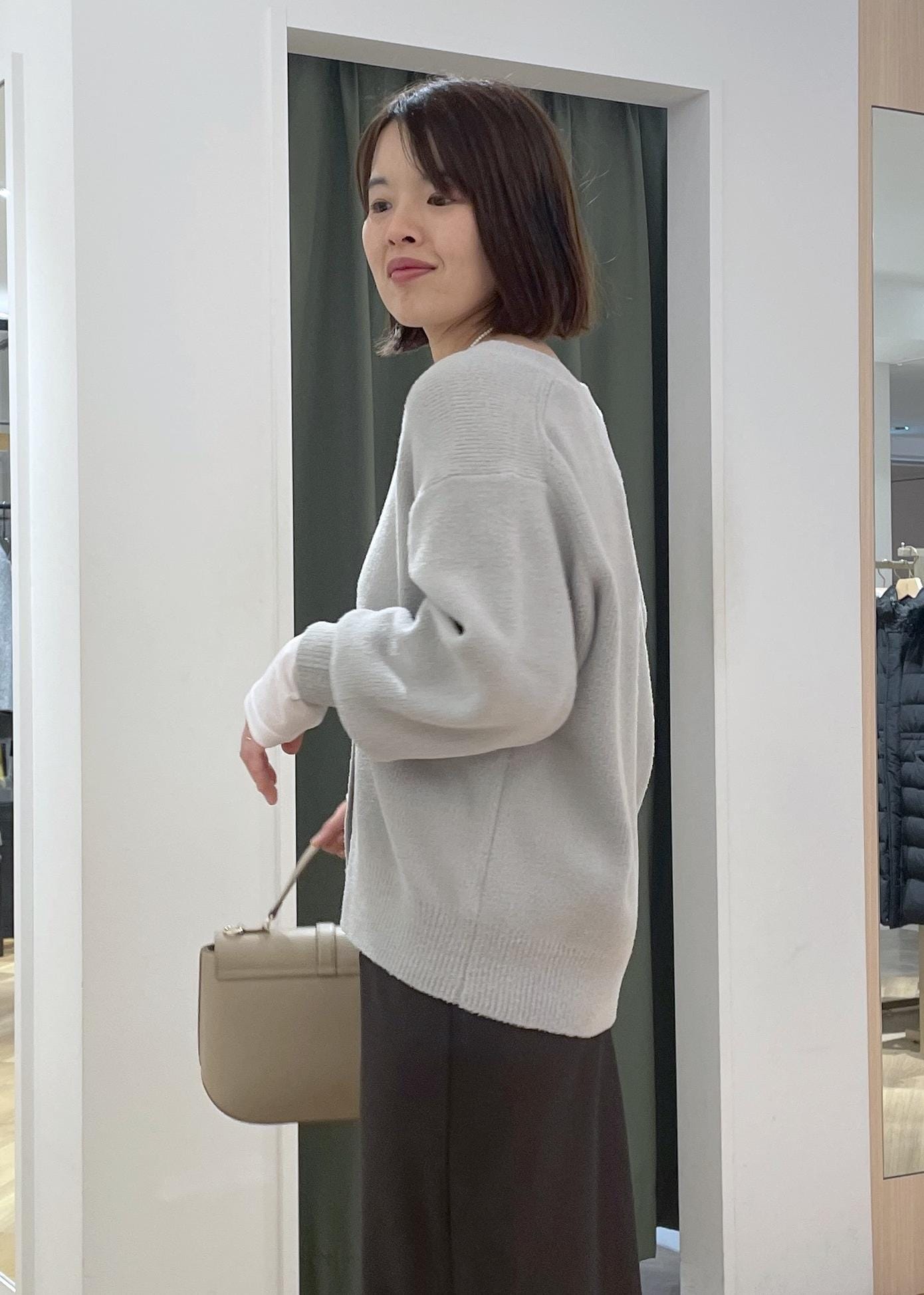 ふわふわした質感が可愛いグレーニットカーディガンに、落ち感のあるサテンスカートを合わせた大人なお出かけコーデです!