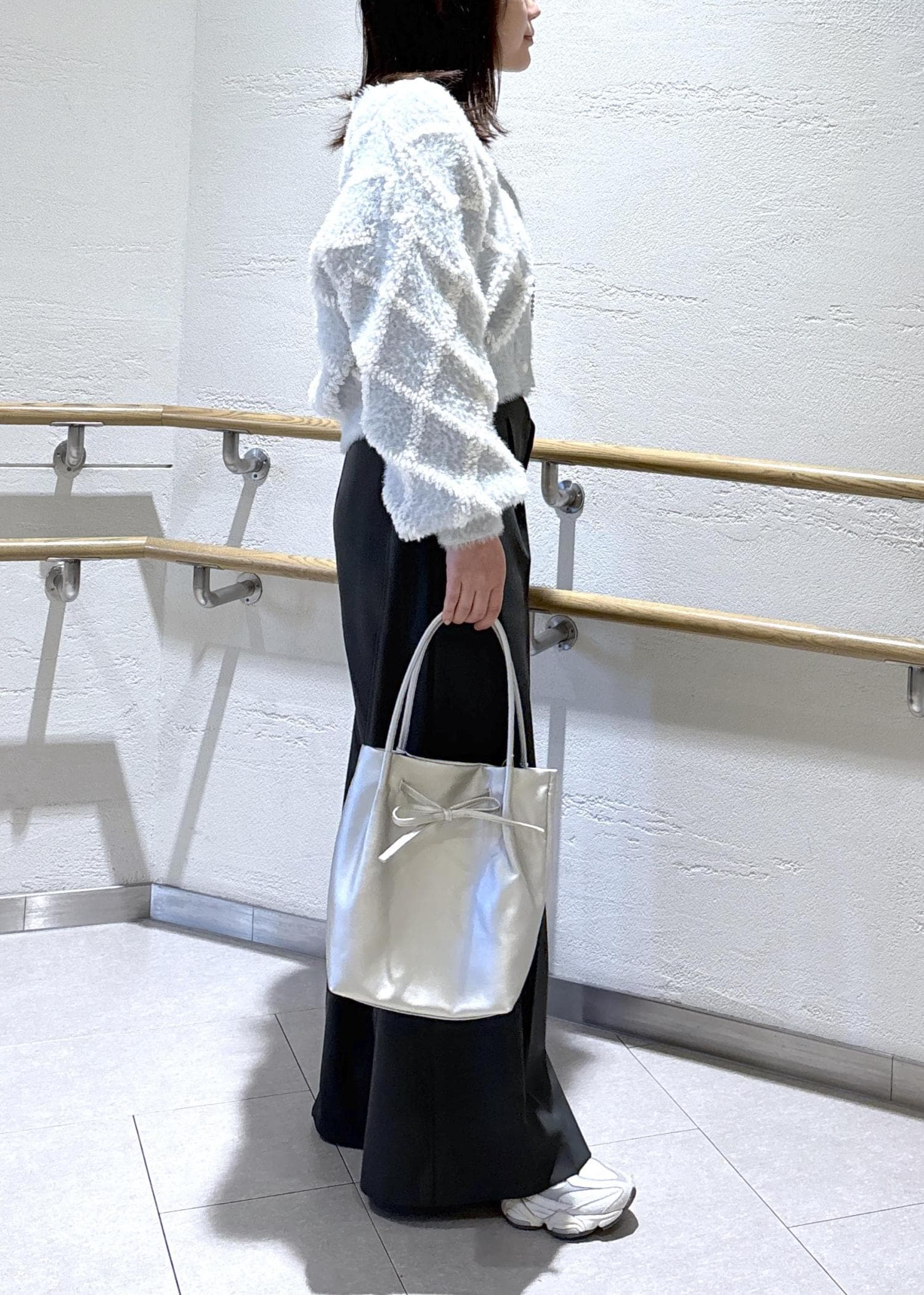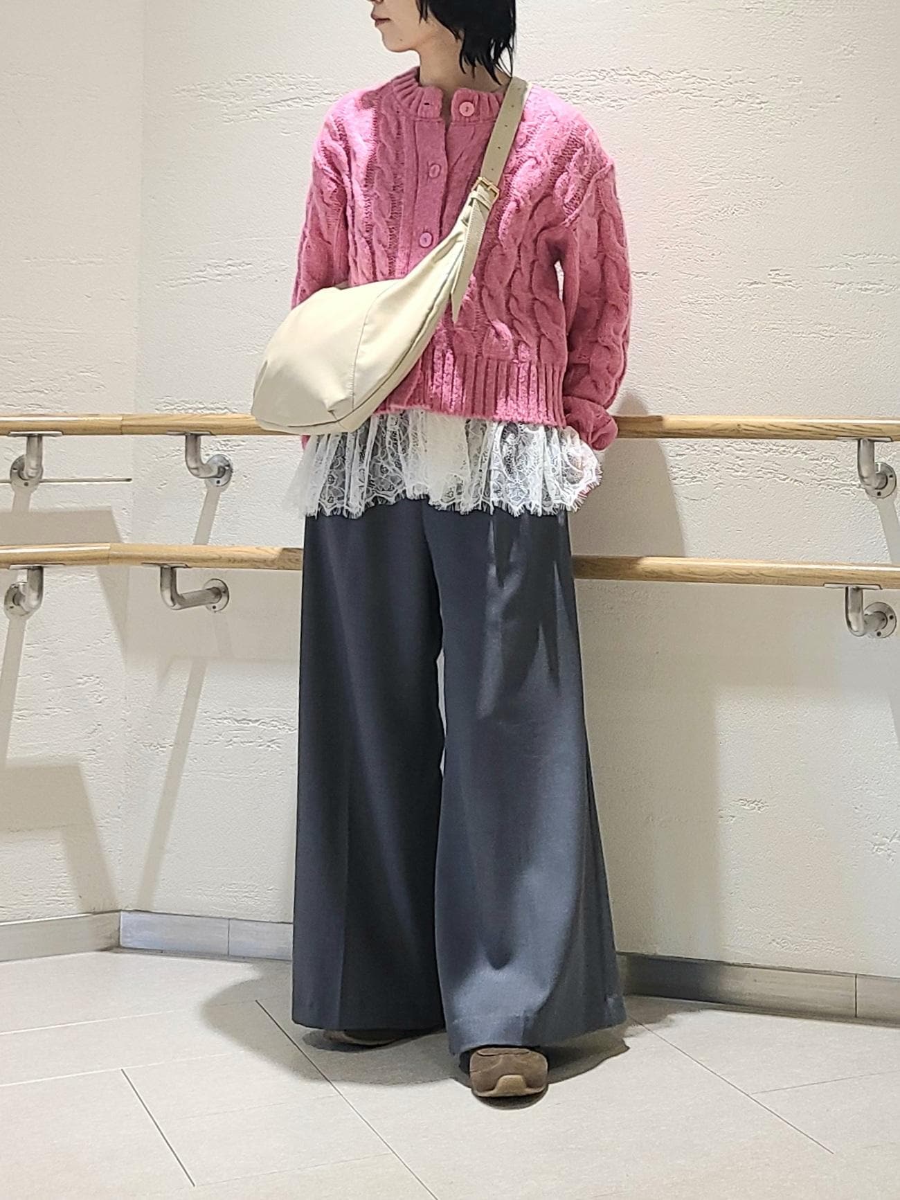 ボトムがパンツとスニーカーなので、カーディガンは一枚で着て、抜け感のあるコーデにしました。