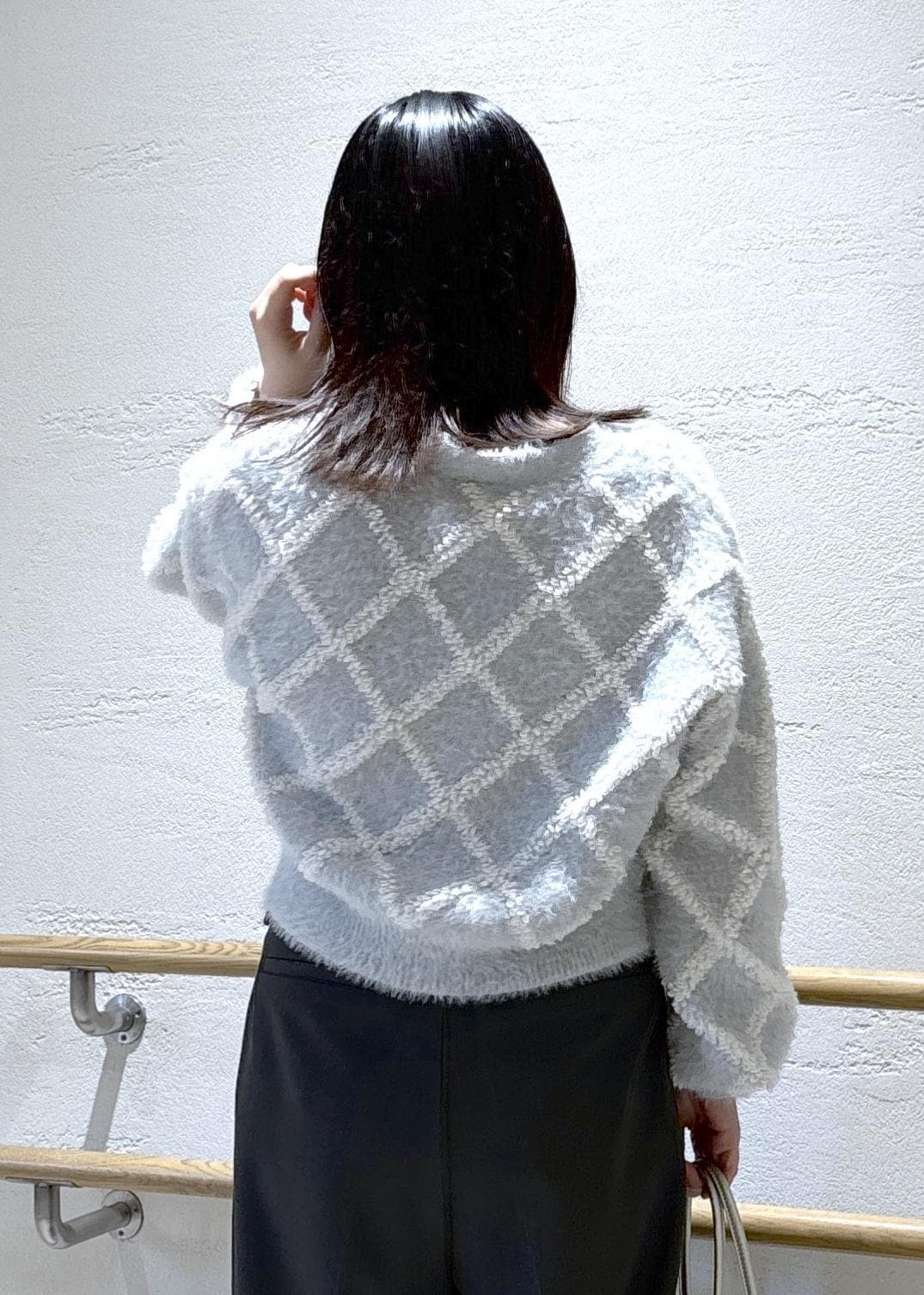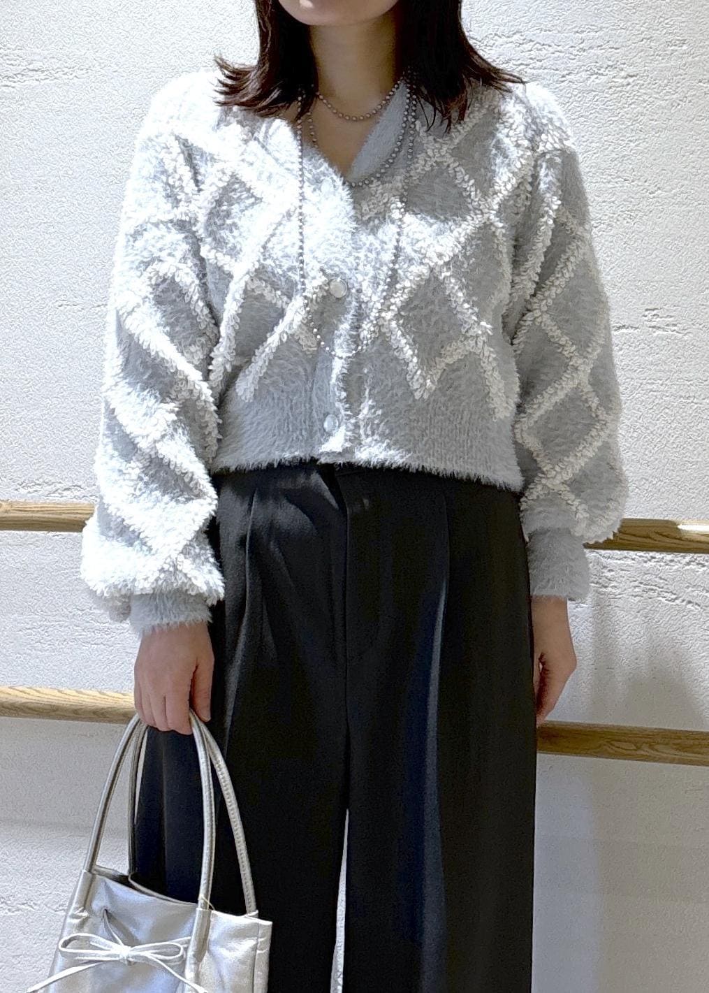 ダイヤチェック柄ループフェザーカーディガンを使ったコーデ。