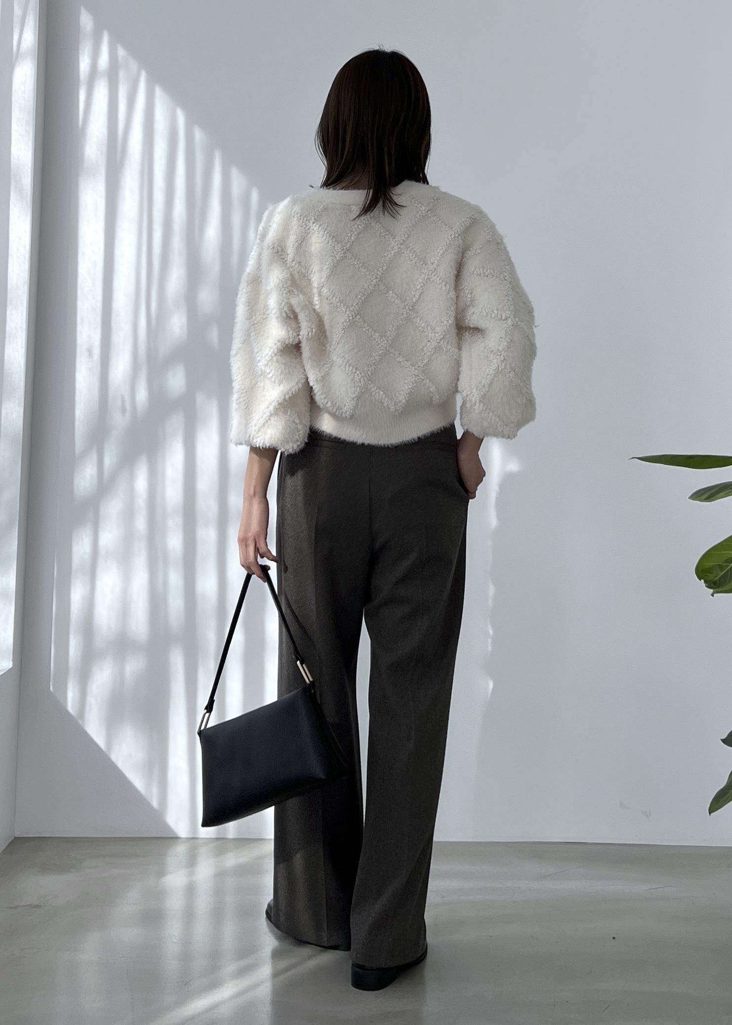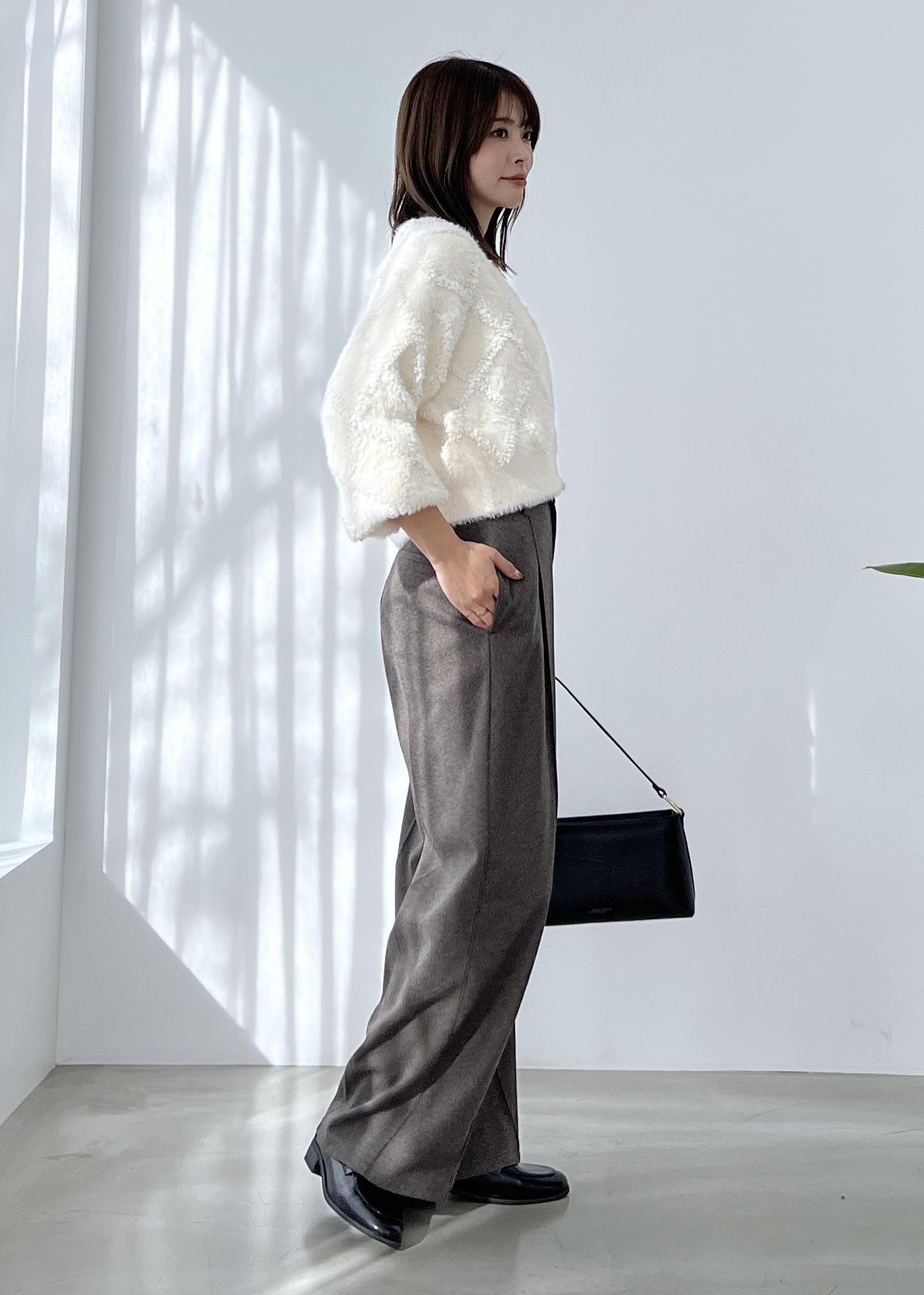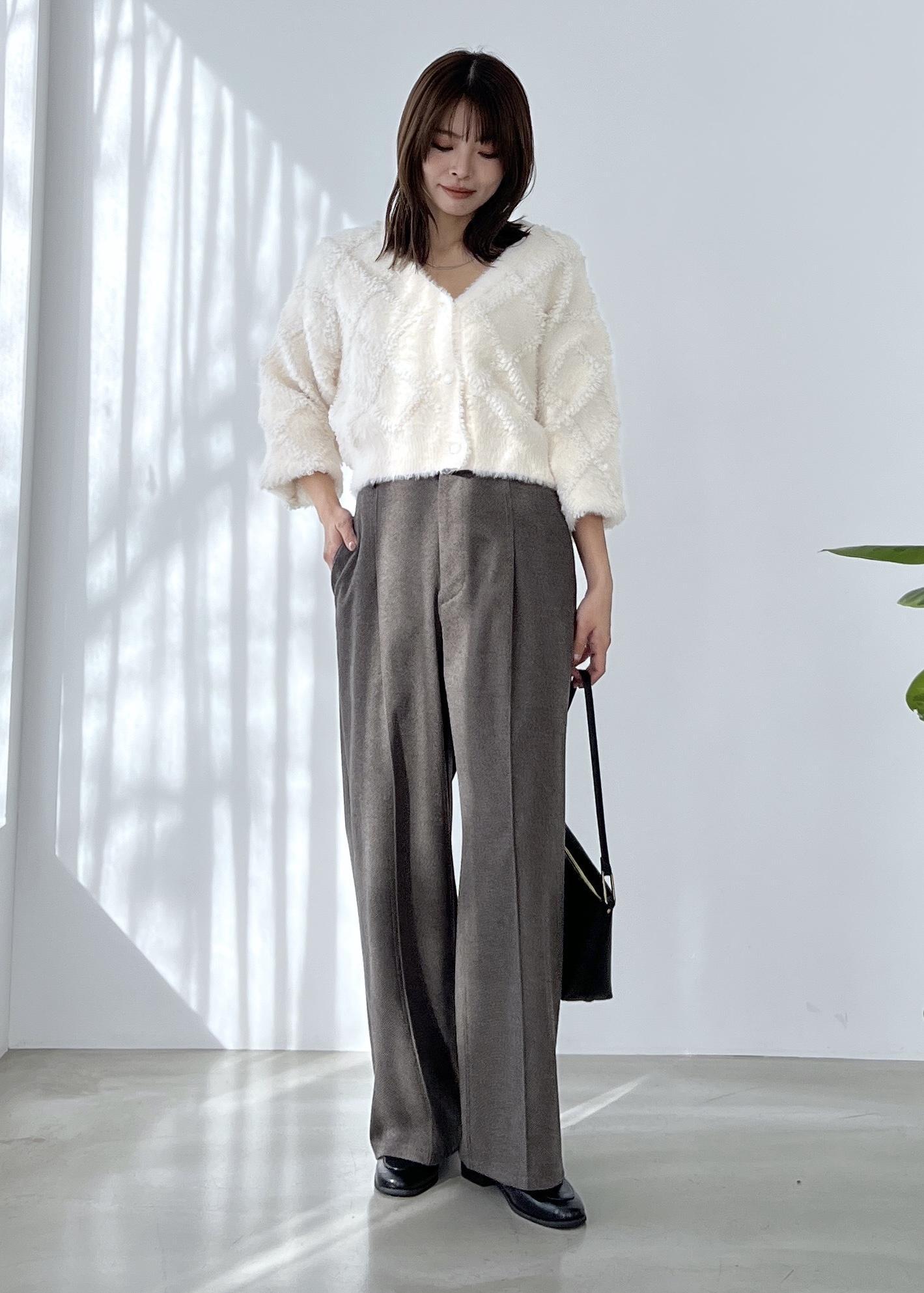 ショート丈で合わせやすいカーディガンは、ワイドパンツを合わせてシンプルカジュアルに。