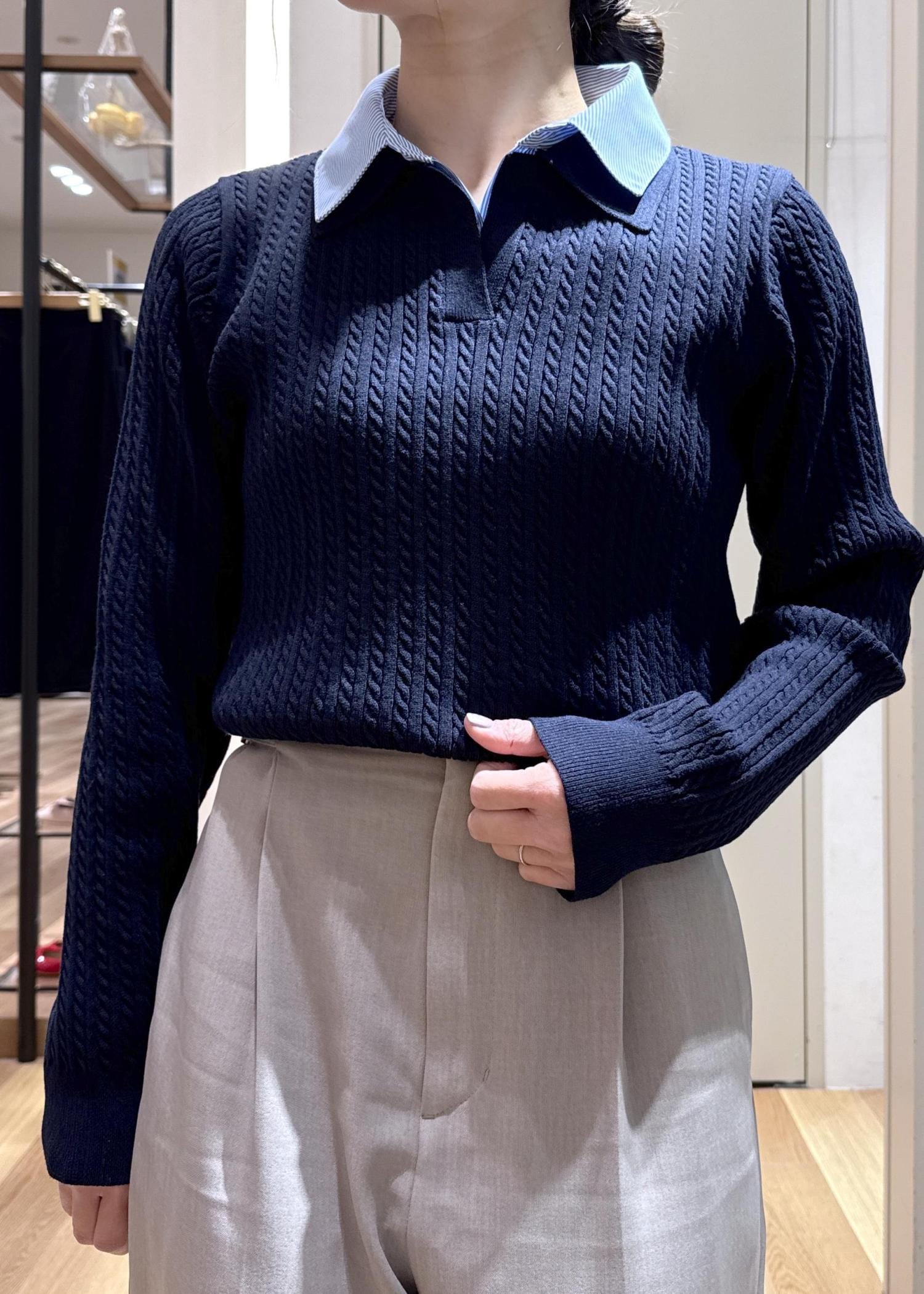 ROPÉ PICNICダブルカラーミニケーブルニットネイビー / F¥5,995レビューニット部分は柔らかくとても着心地が良いです。