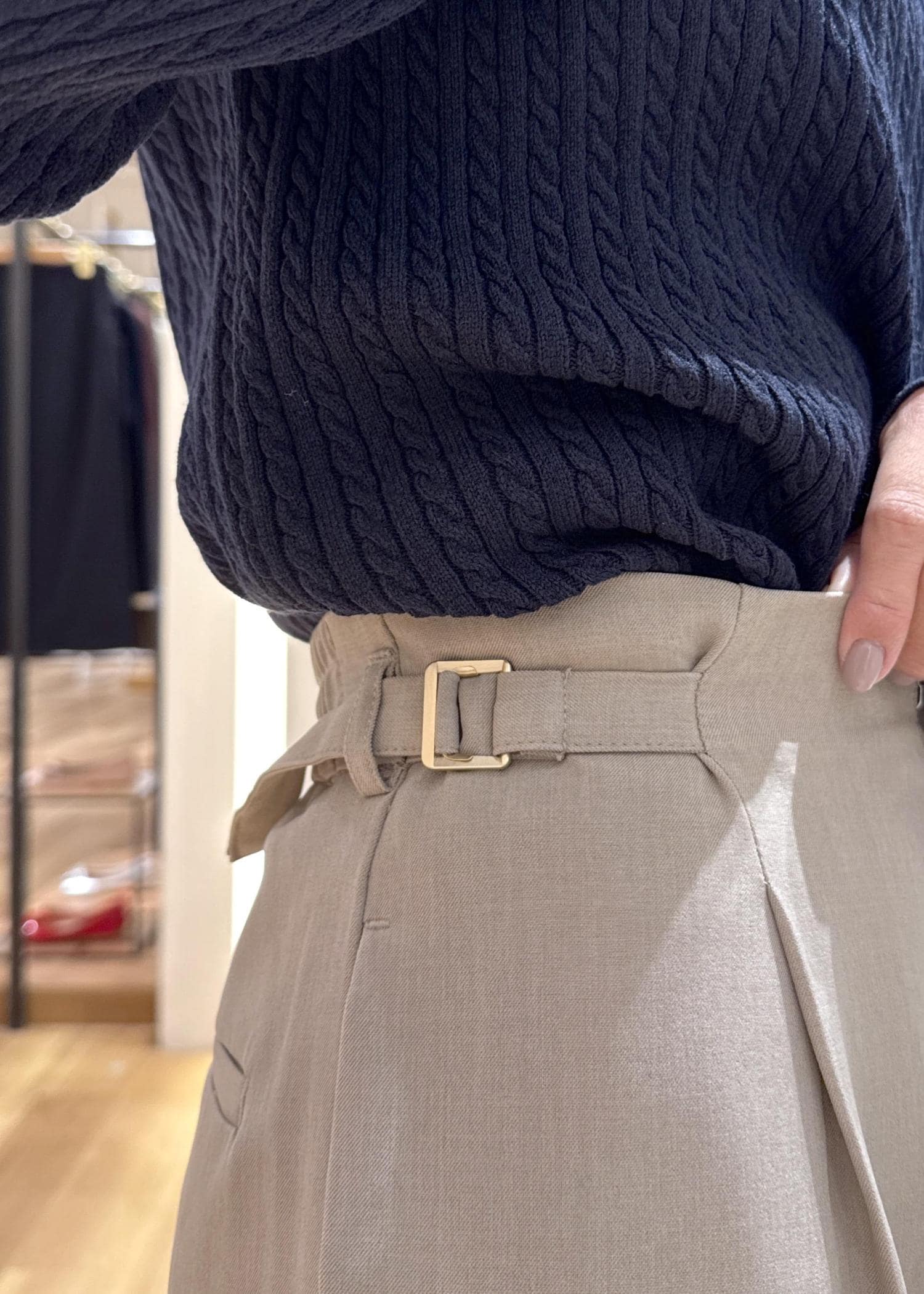 明るいベージュのカラーは綺麗め合わせはもちろん、デニムやカジュアルトップスを合わせたカジュアルスタイルにも着回しできるのでおすすめです♪