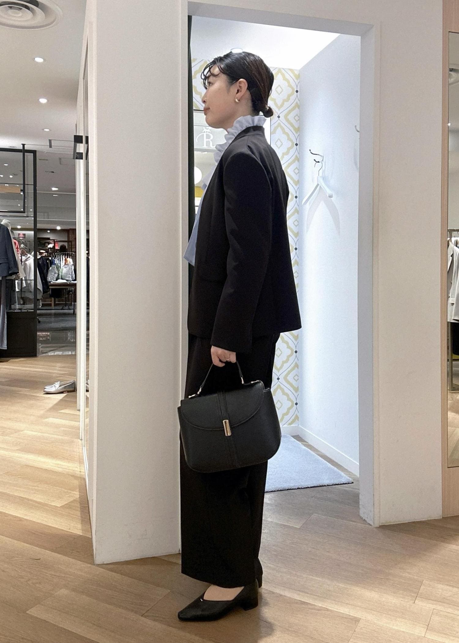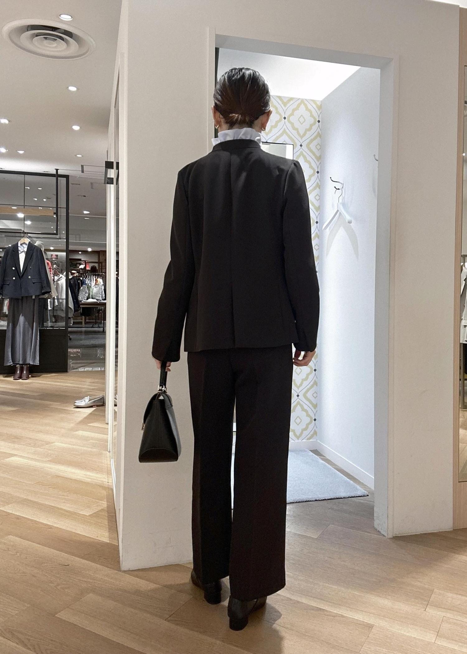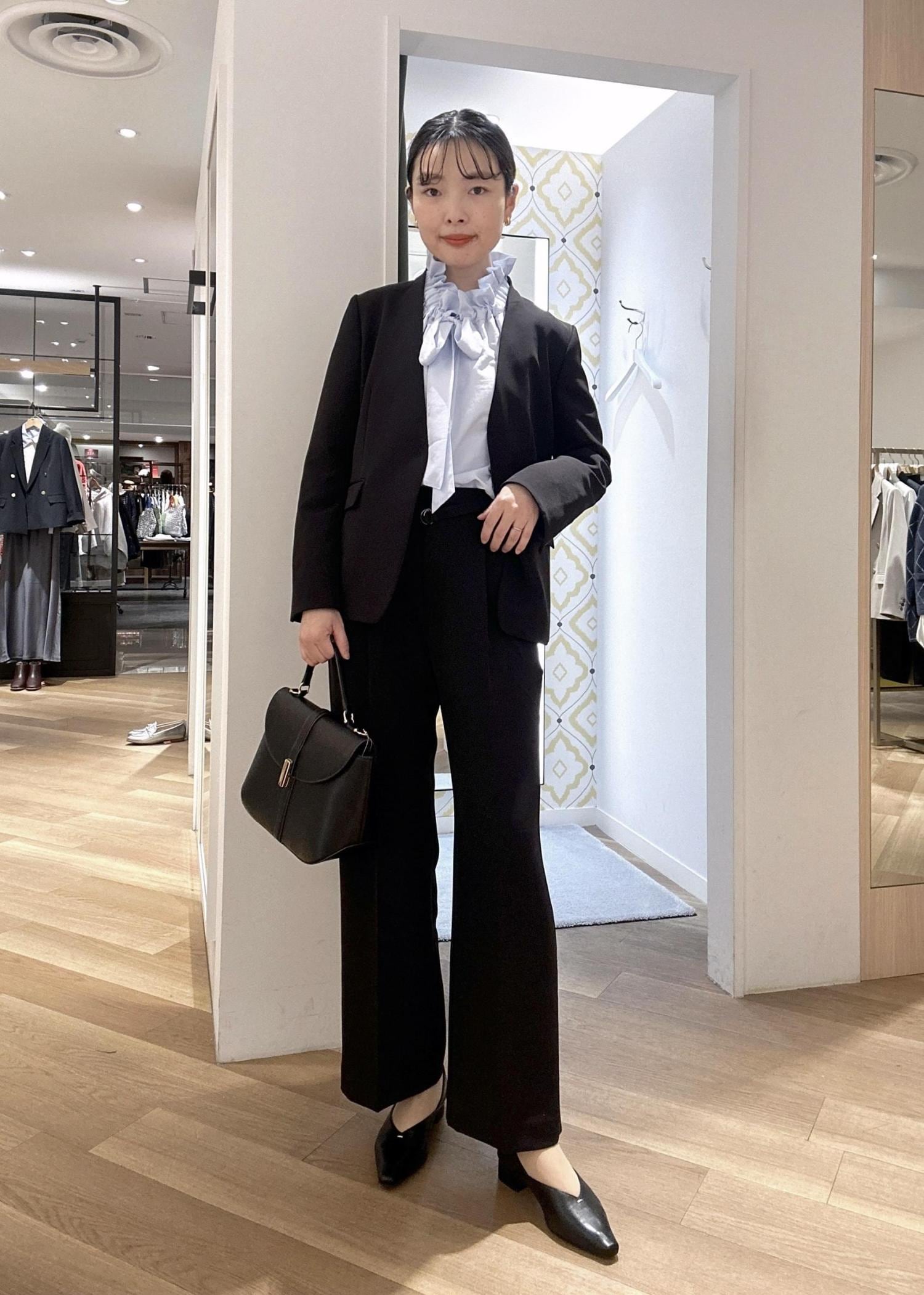 華やかなフリルデザインのブラウスがひき立つようブラックのセットアップを合わせました♪ ストレッチ性抜群でそれぞれ着回し力も◎ お仕事にもハレノヒにもおすすめです♪