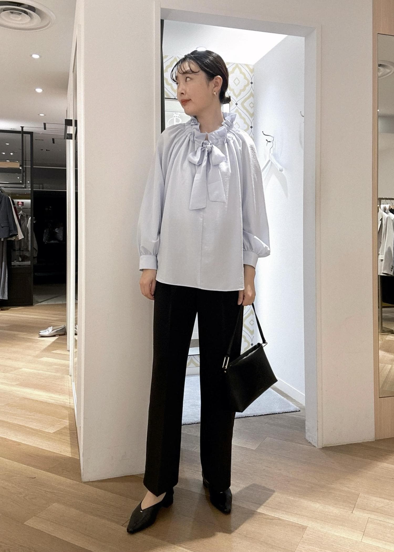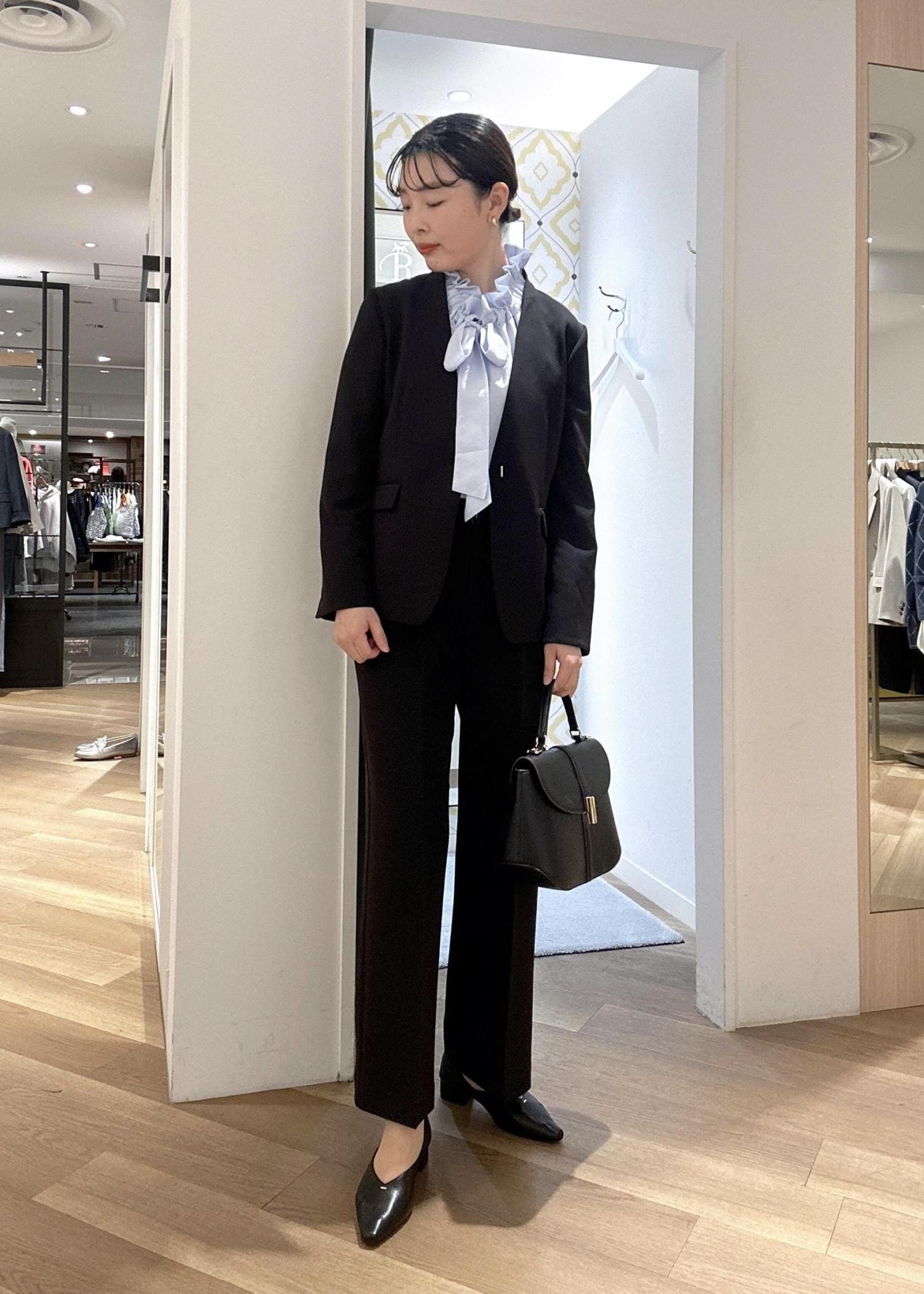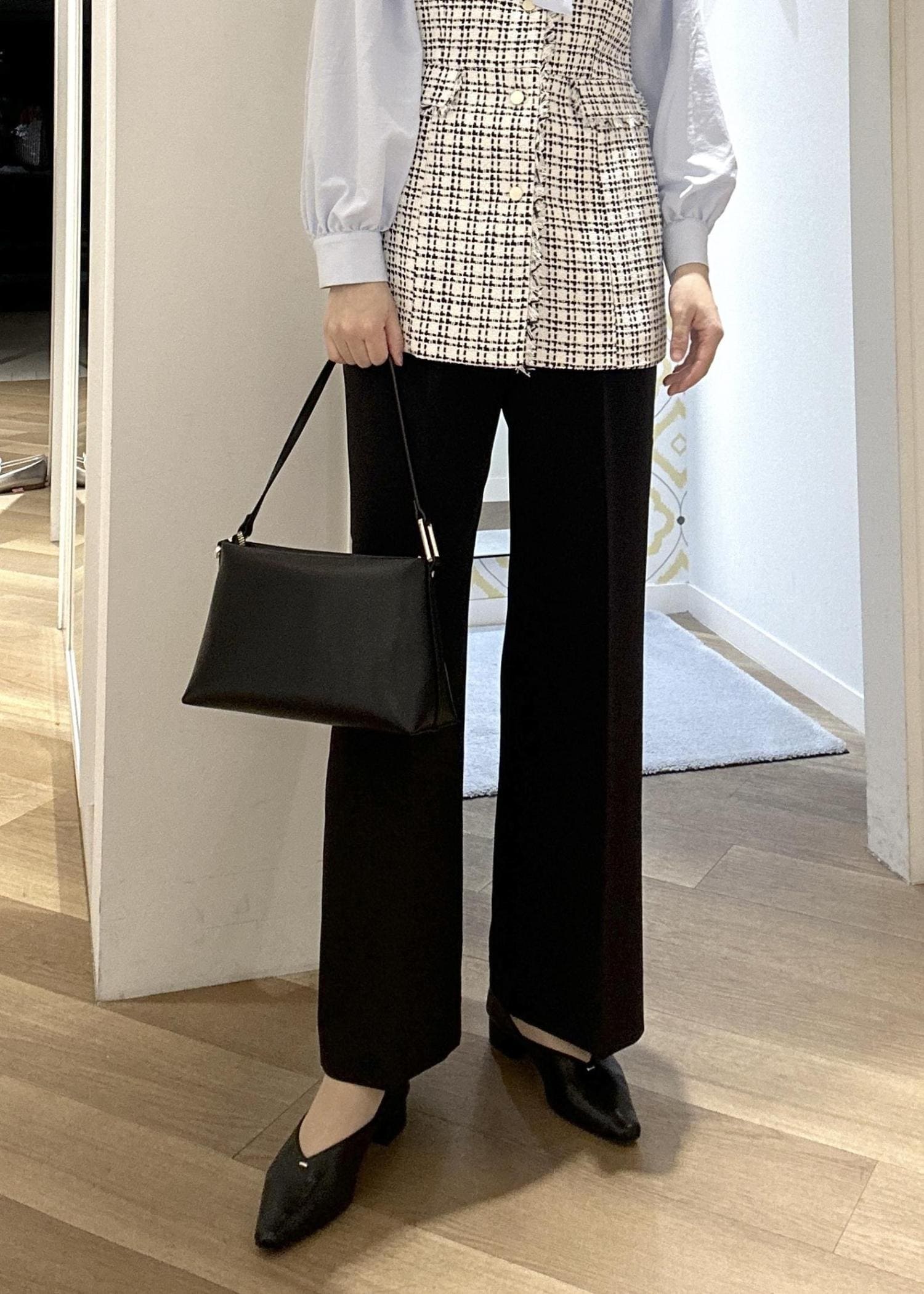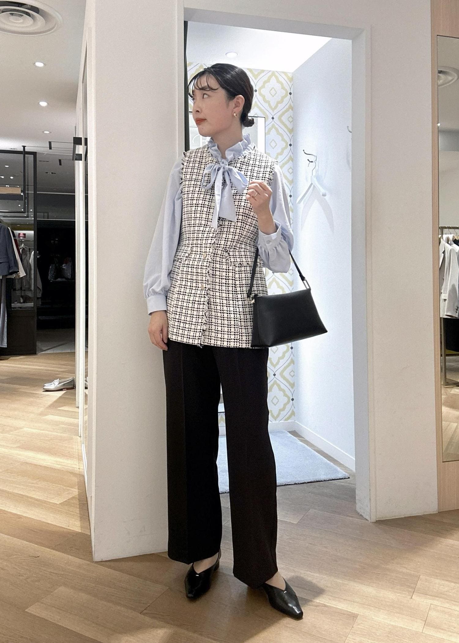 白黒のジレにはブラックのパンツでスタイリッシュに。差し色は品のあるライトブルーで春らしさを意識しました♪