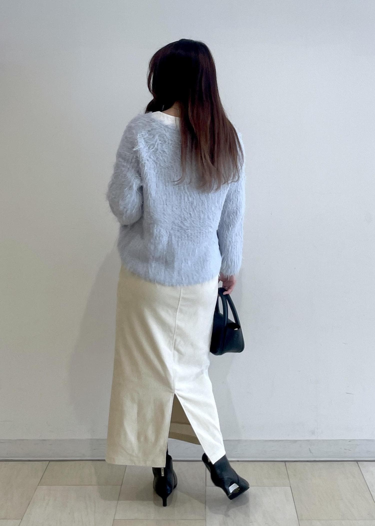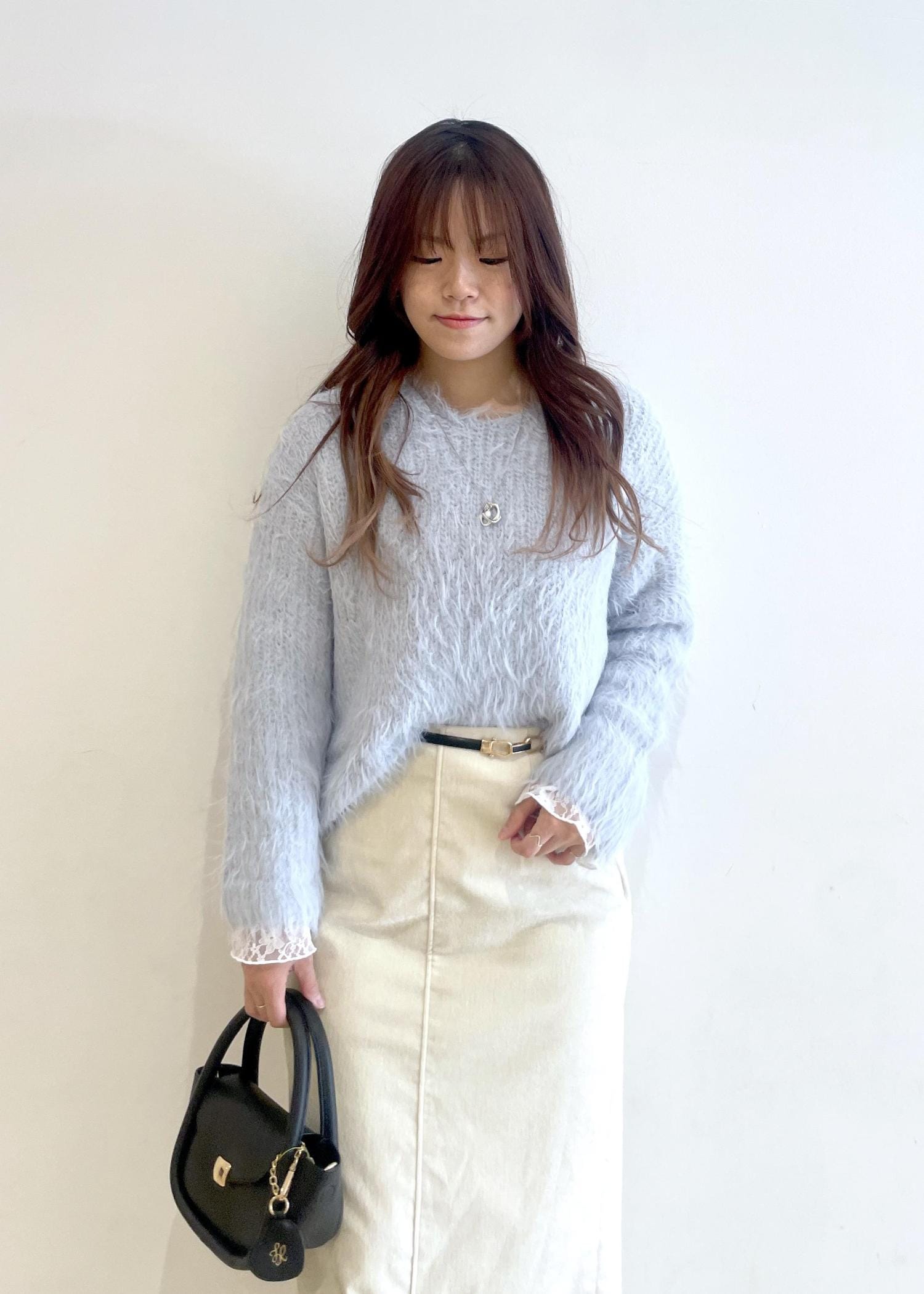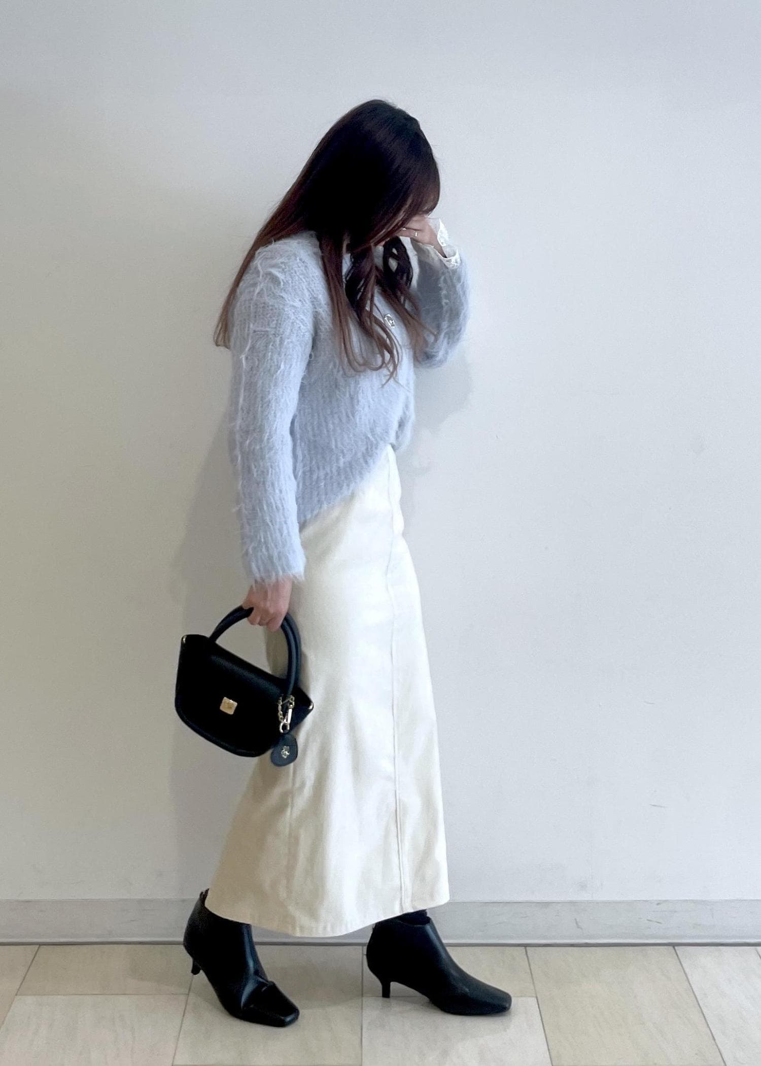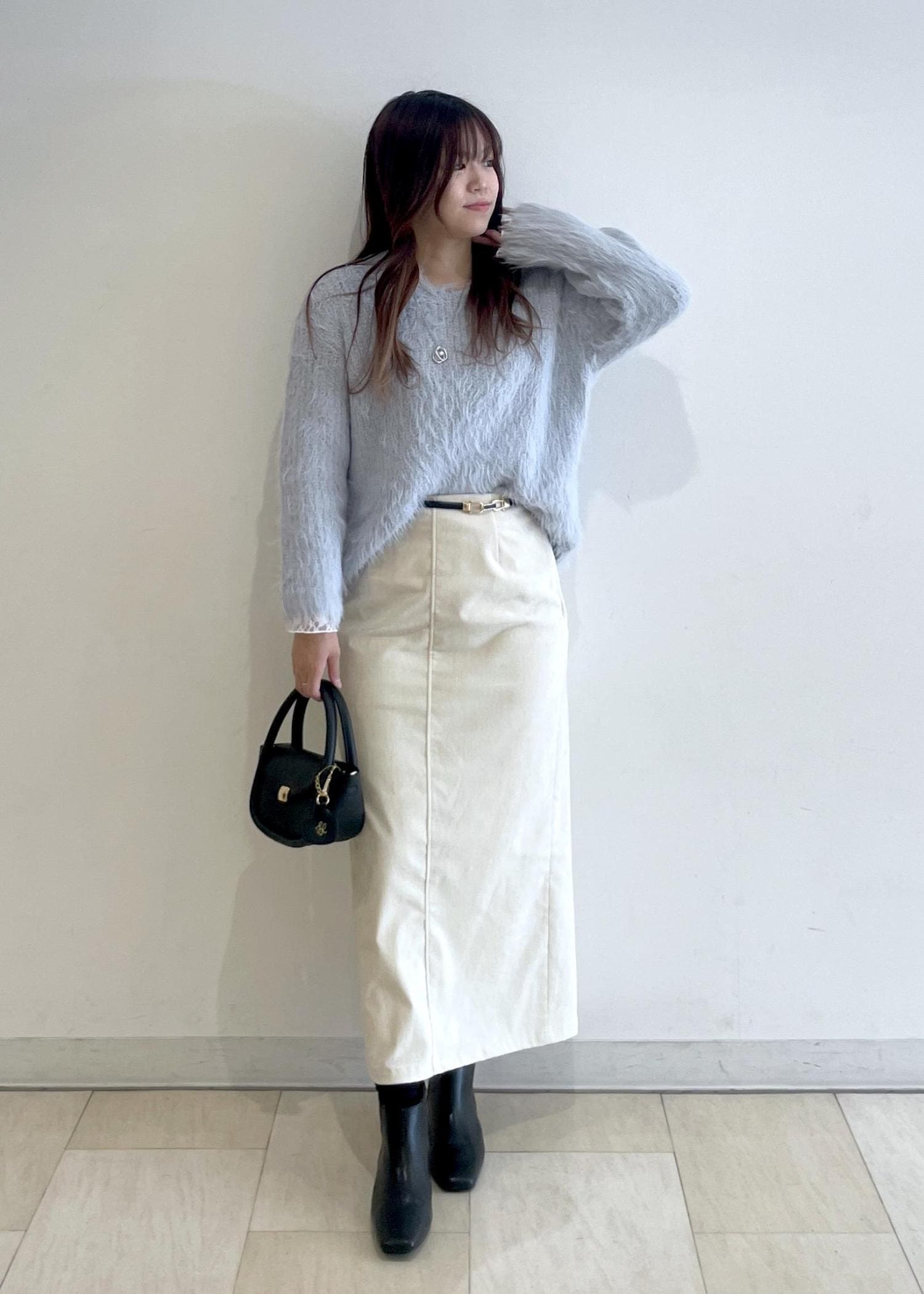 水色のニットに白のスカートを合わせて、今の時期から春まで着れるコーディネートです!