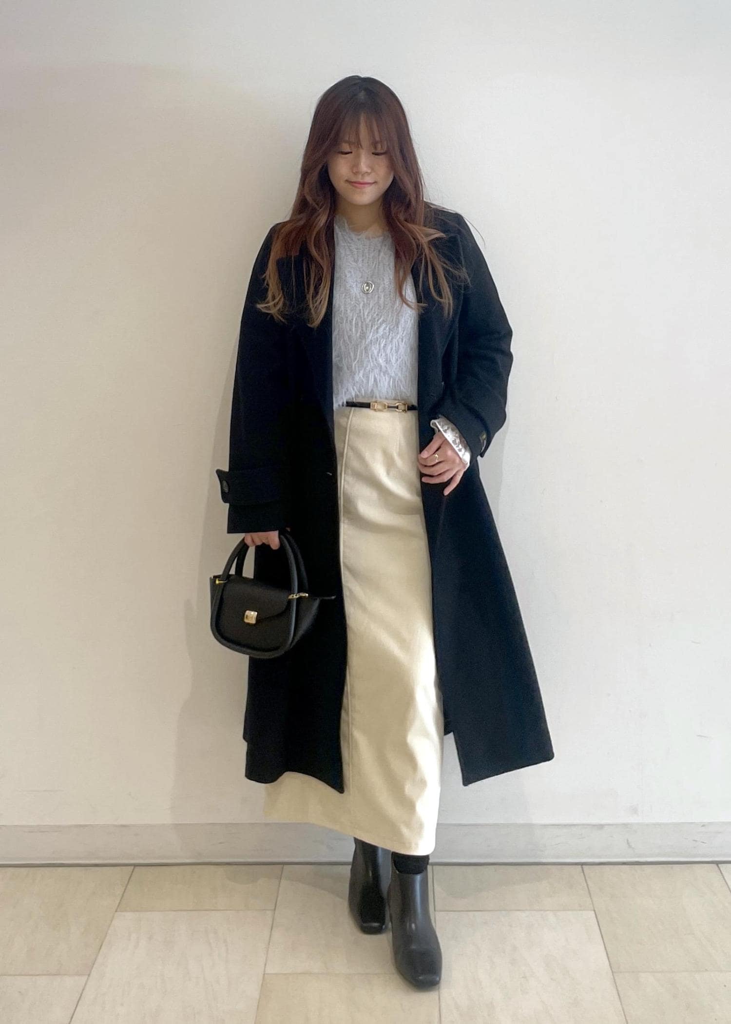 小物は全て黒を合わせ、甘くなりすぎないようにしました!