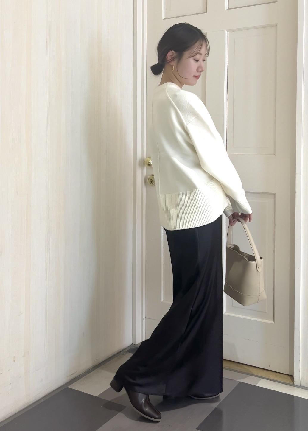 シンプルなニットにサテンスカートを合わせて、シンプルながら高見えするコーディネートに。