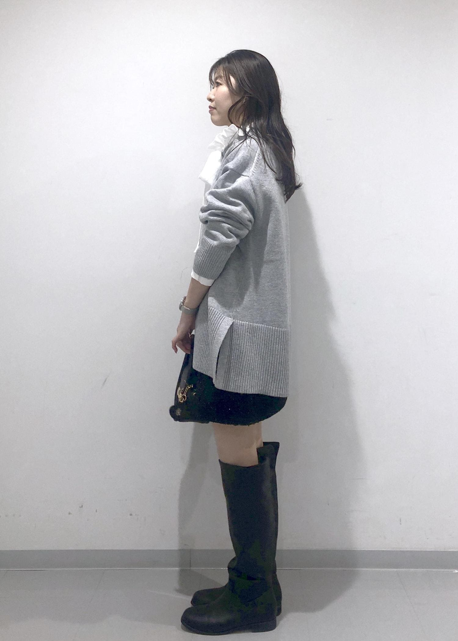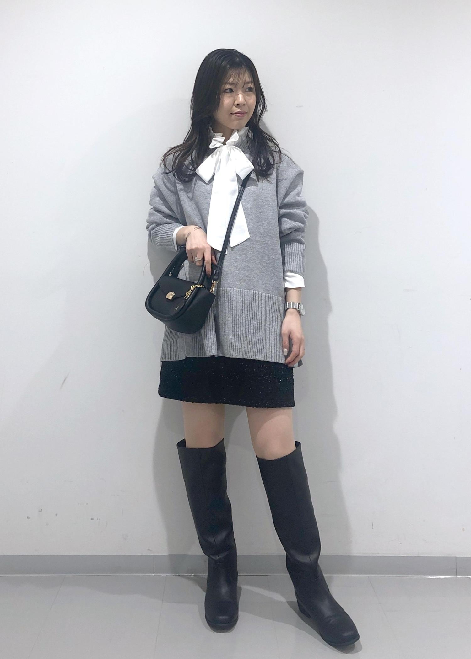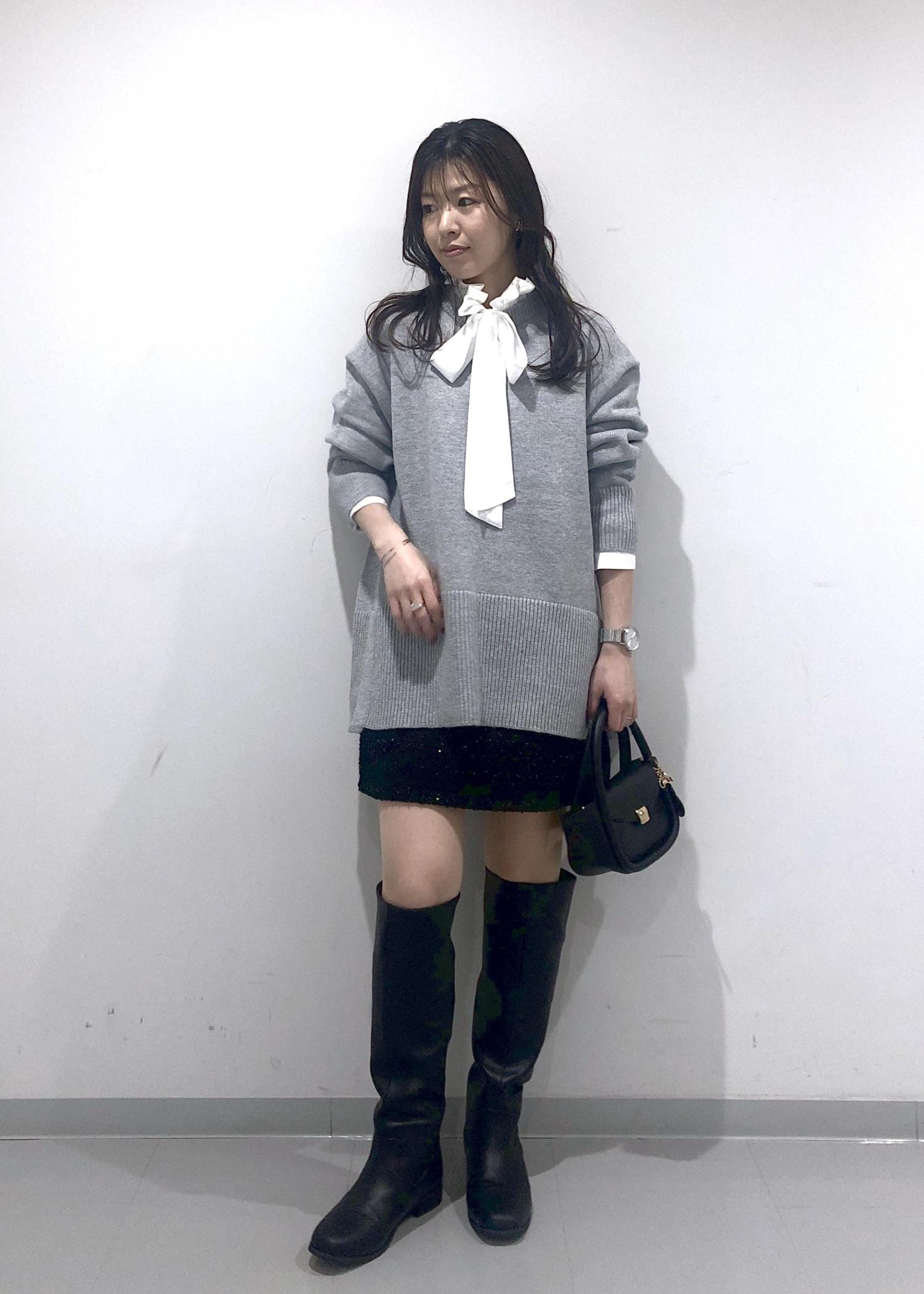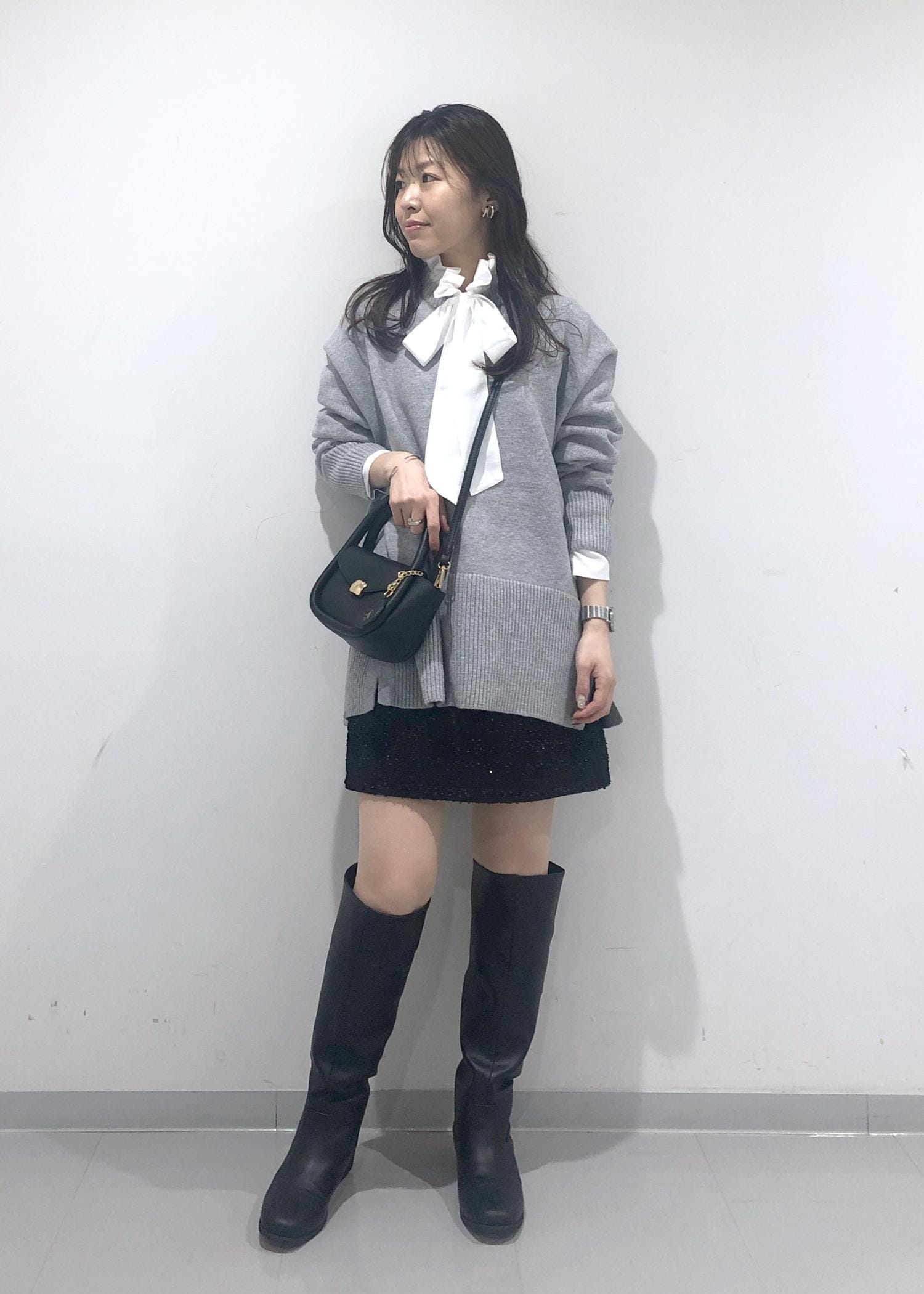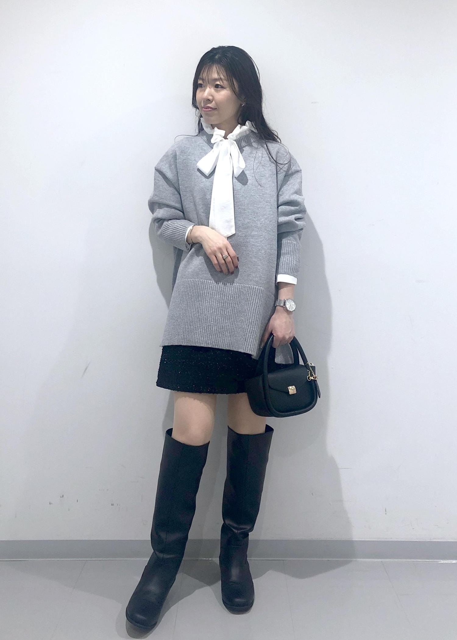 華やかなフリル&リボンのブラウスに、オーバーサイズのグレーニット、キラキラミニスカート、ロングブーツを合わせた大人可愛いカジュアルコーデです!