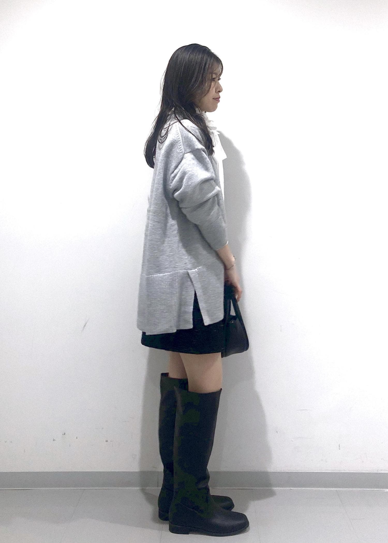 ミニスカートが子どもっぽくならないよう、シンプルに、モノトーンでまとめました。