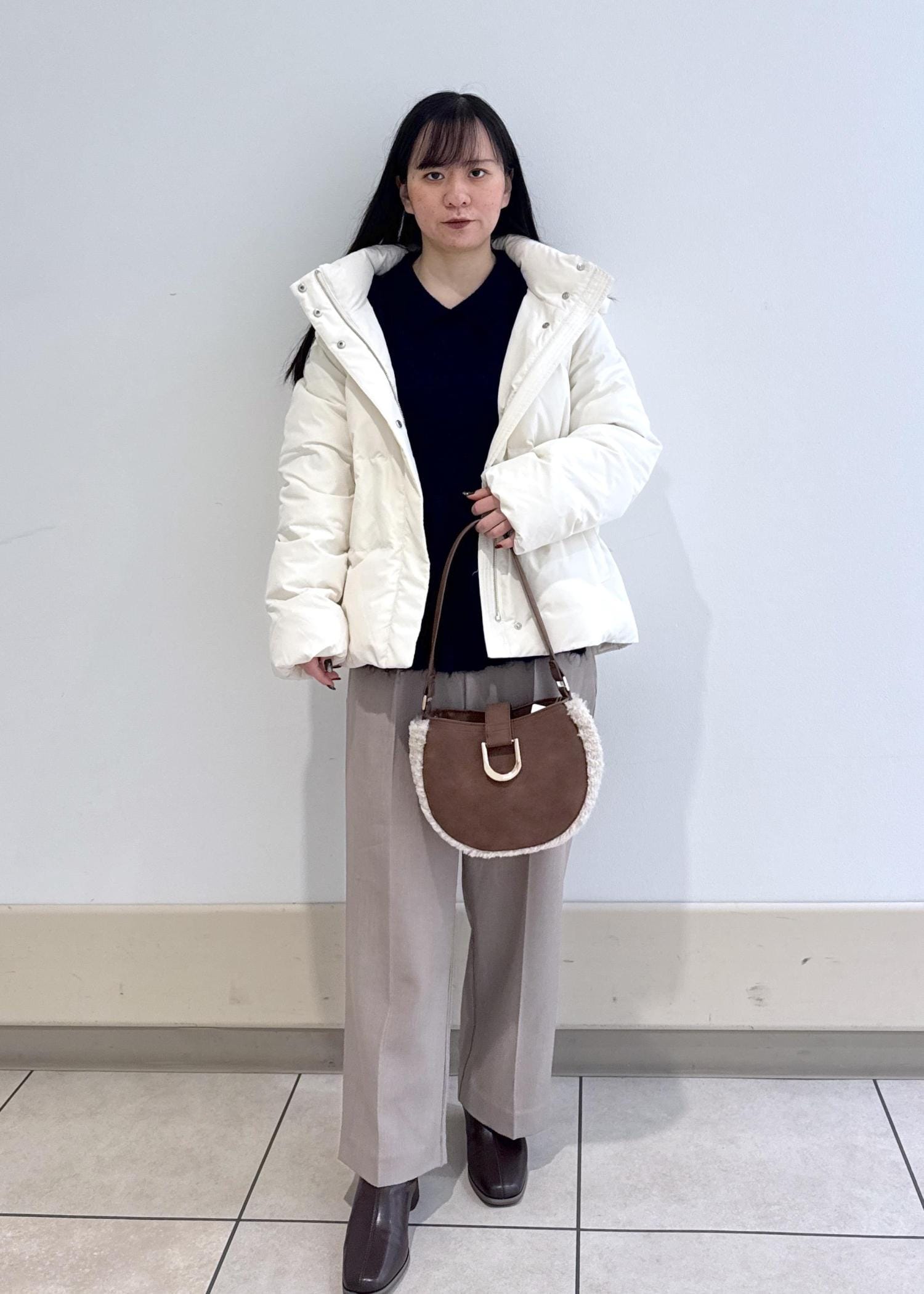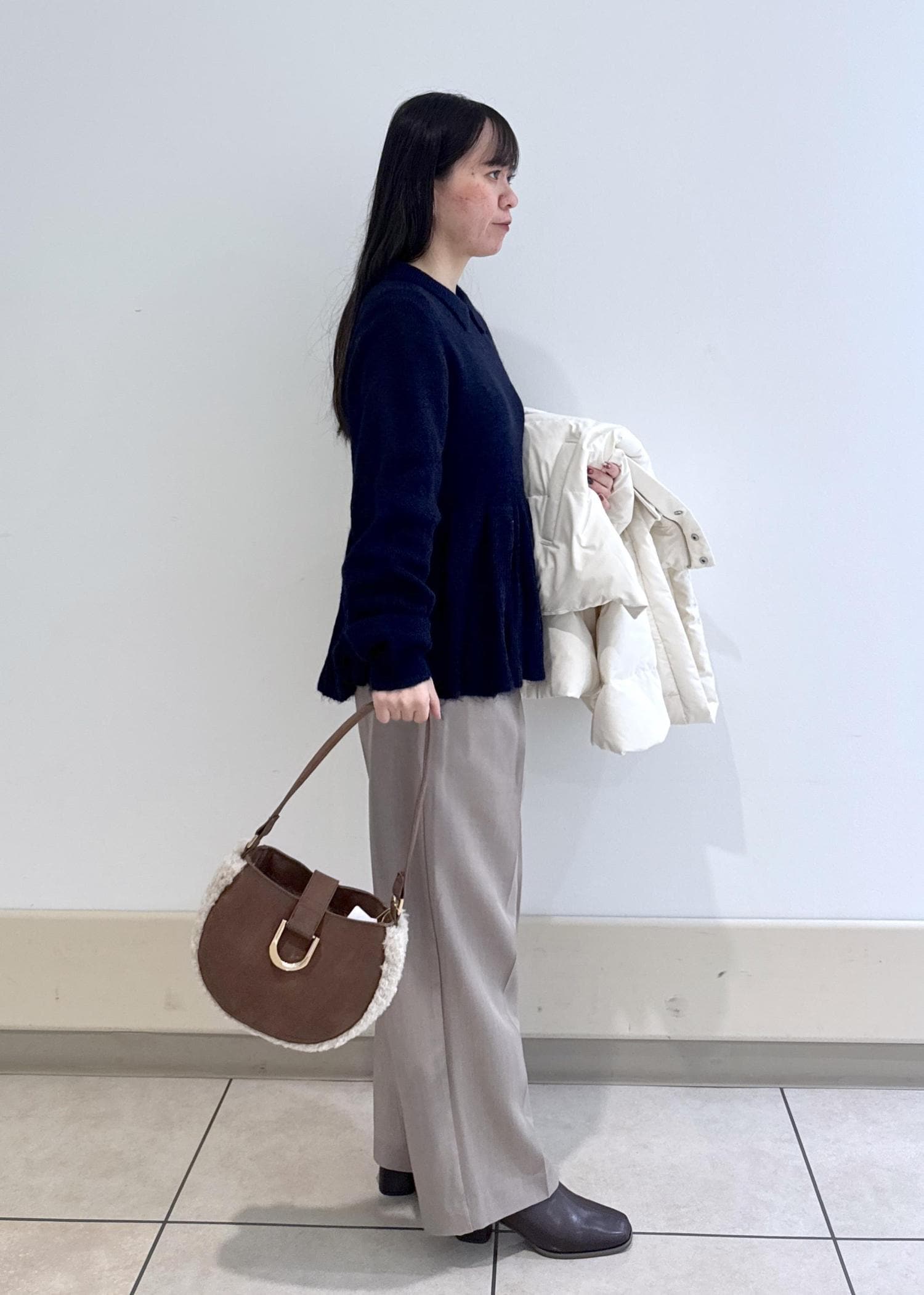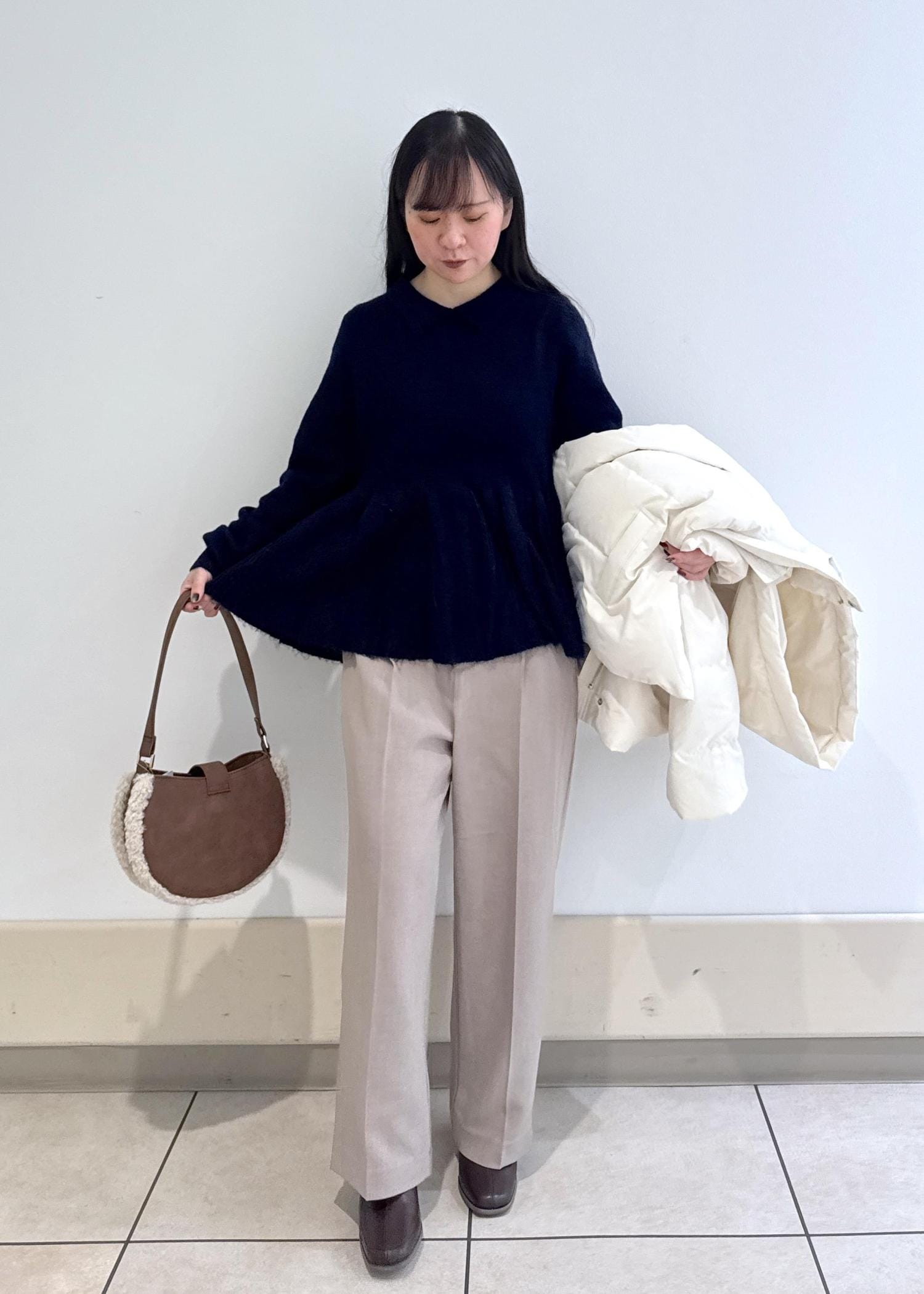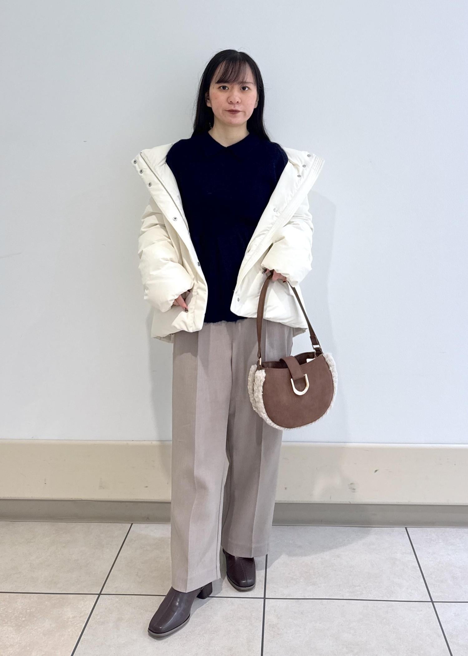 アウターはカジュアルできめて、ダウンを脱ぐとペプラムニットでフェミニンな印象でギャップのあるコーデを組んで見ました!
