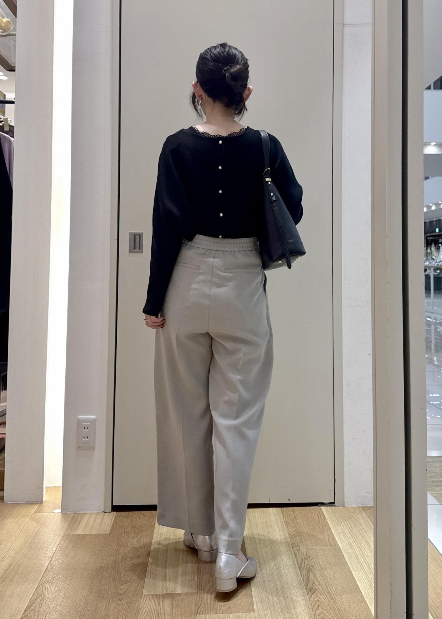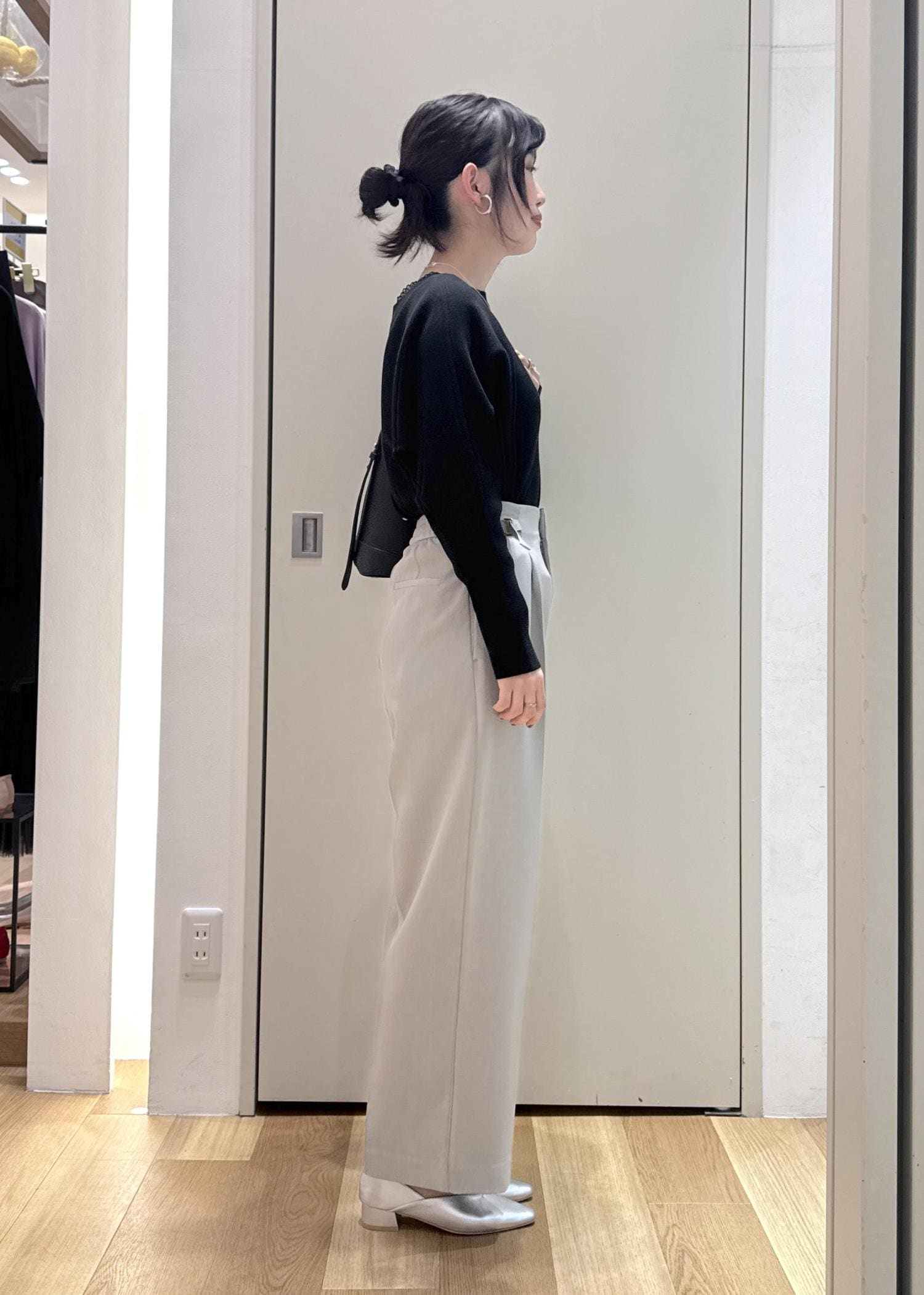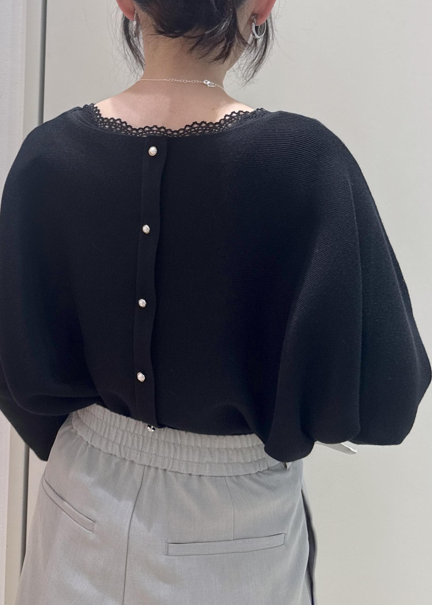 ニットは前後2wayで着れますが、パールを後ろにして、華奢なネックレスで上品に仕上げました◎