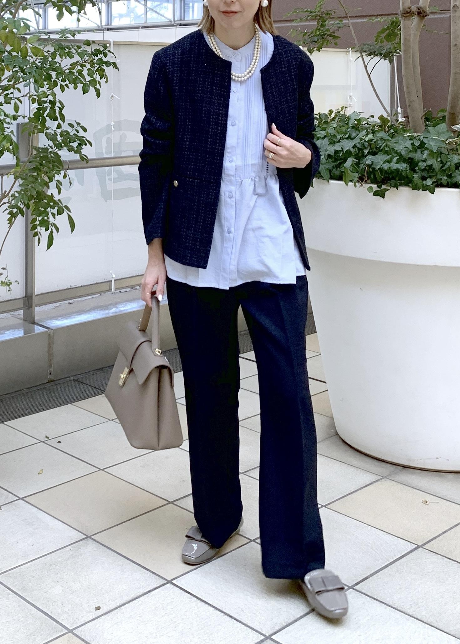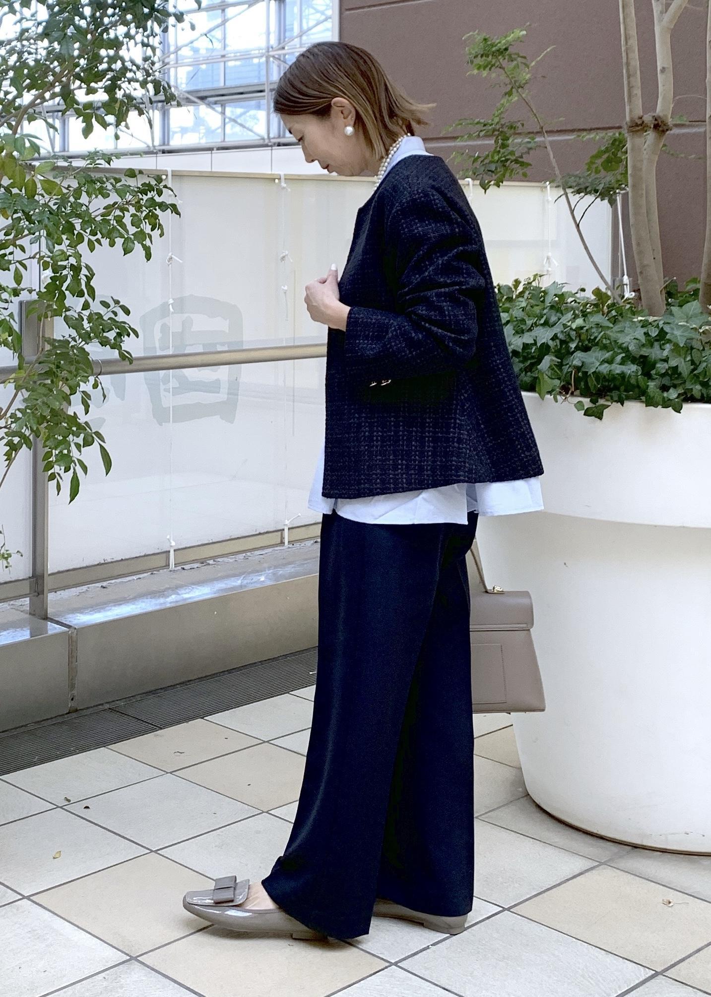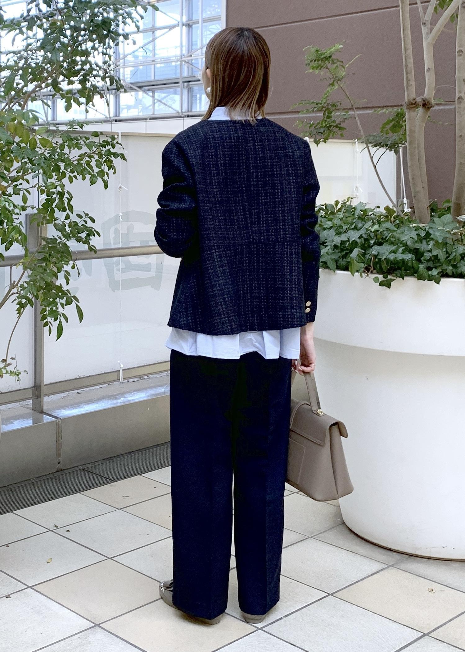 セレモニー感の強いツイードジャケットですが、お仕事スタイリングにもおすすめです。