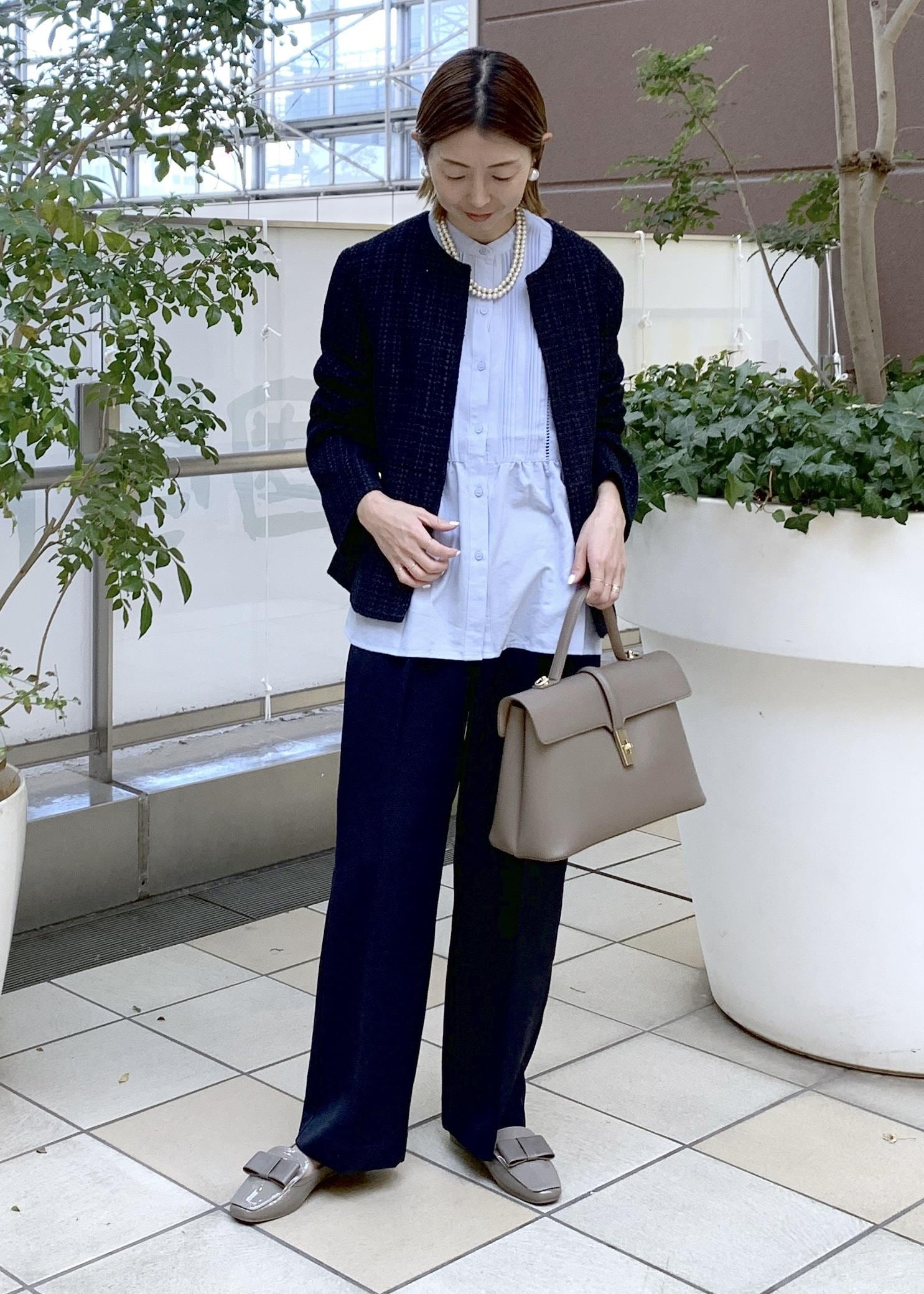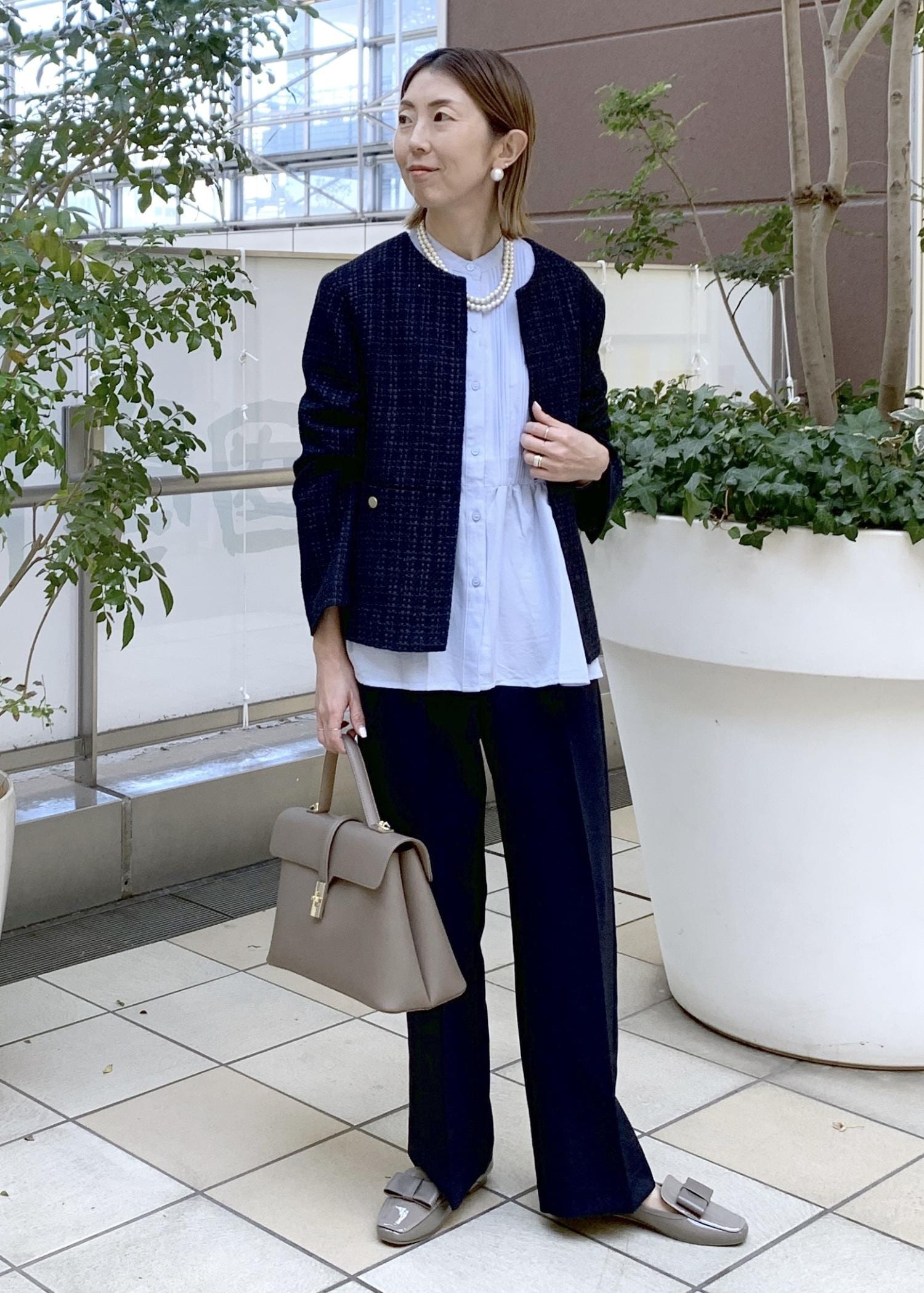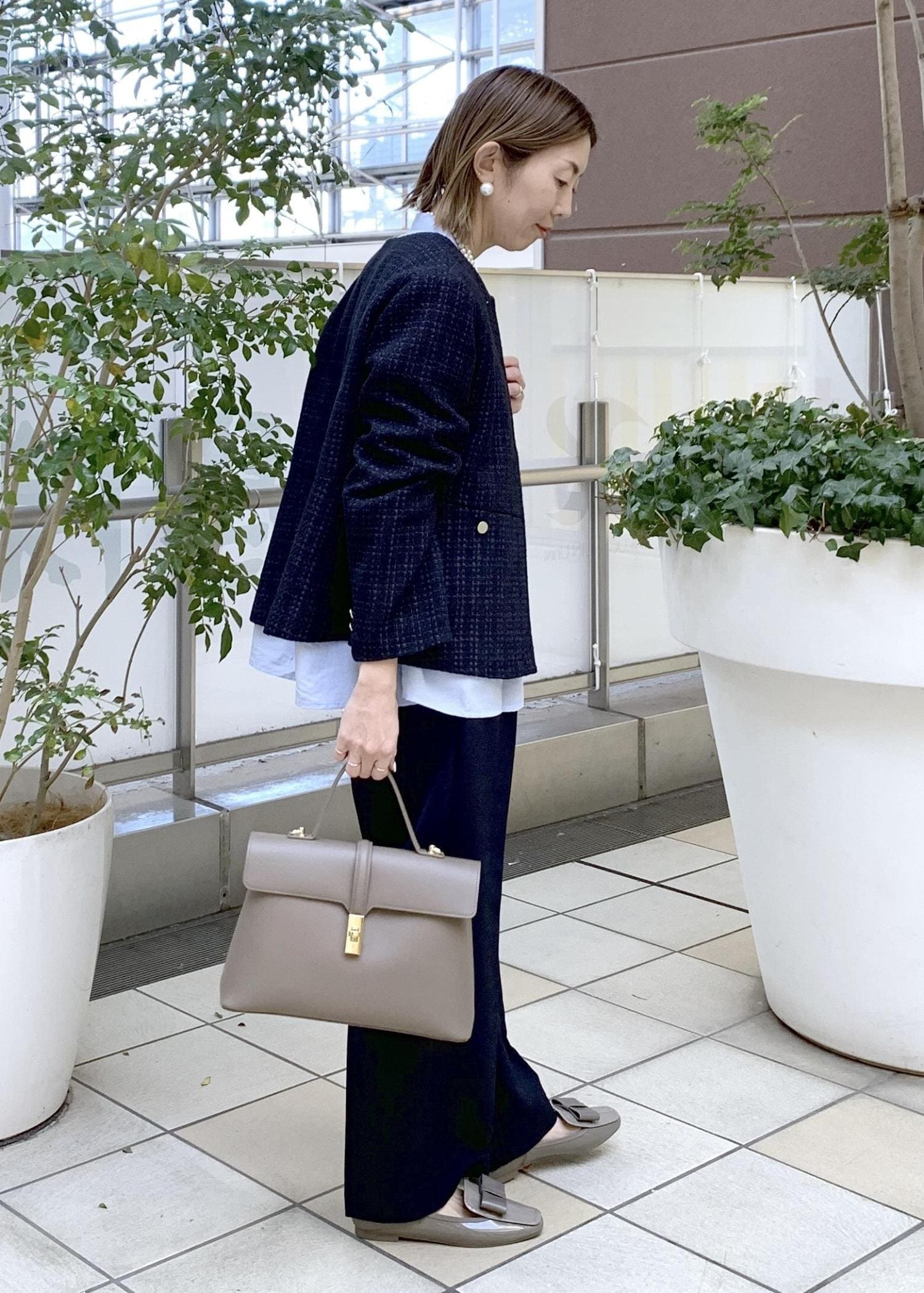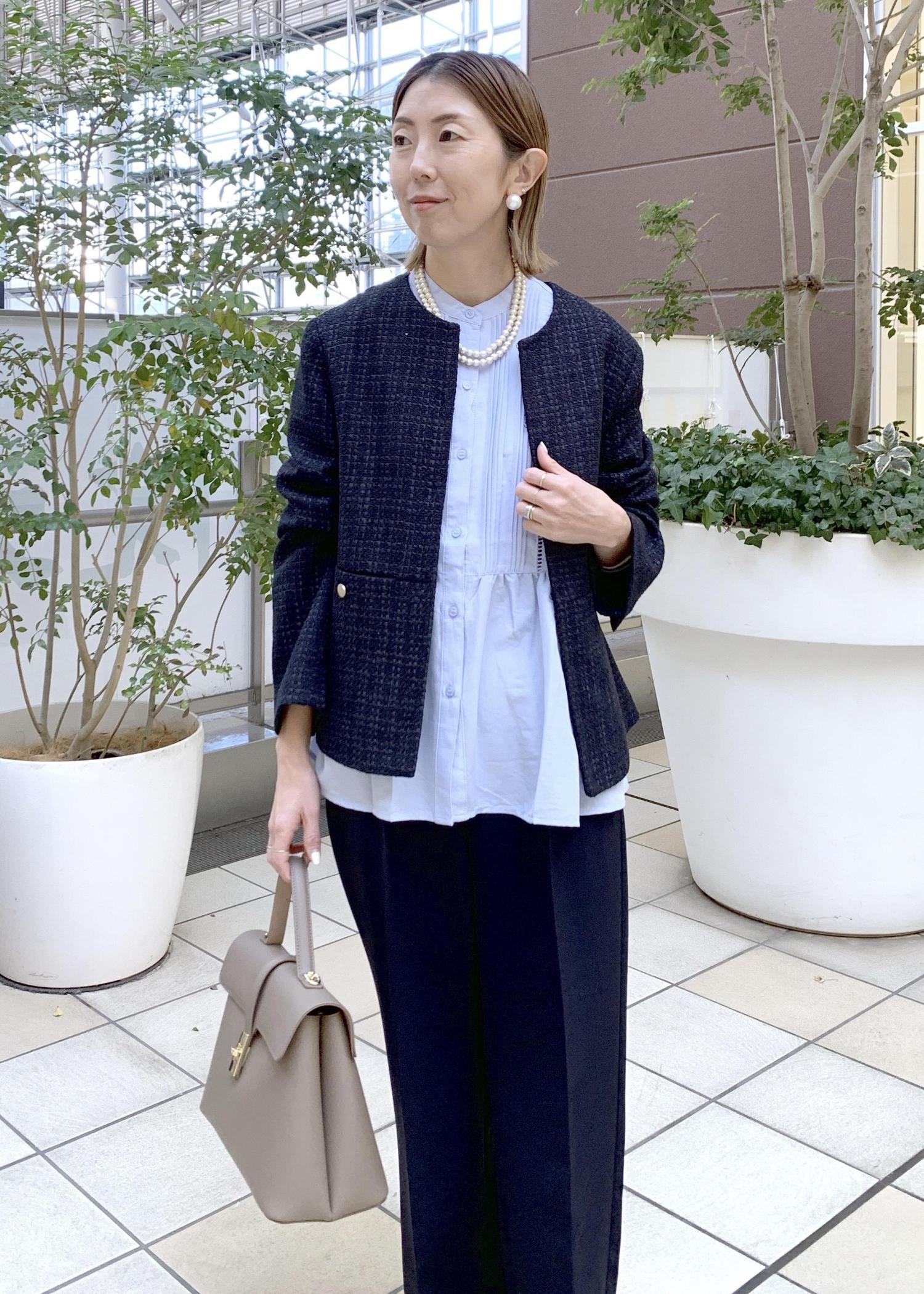 セレモニー感の強いツイードジャケットですが、お仕事スタイリングにもおすすめです。