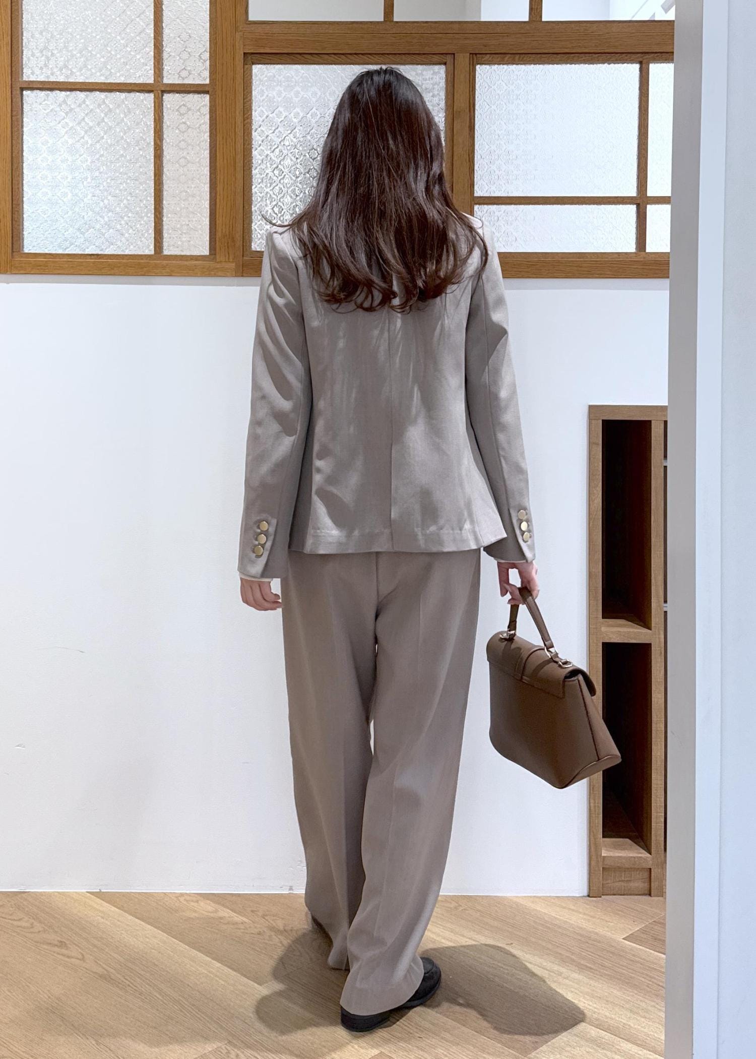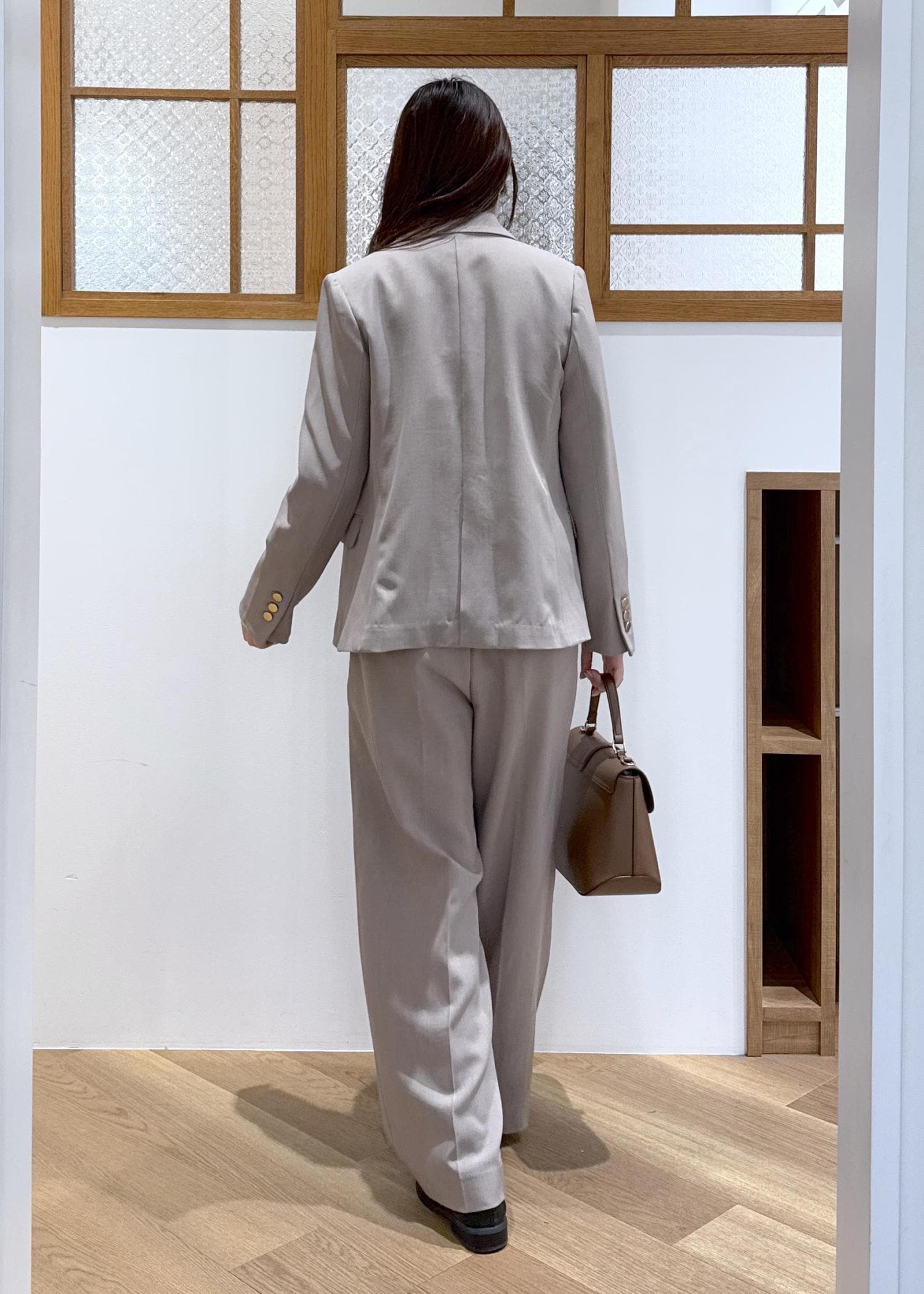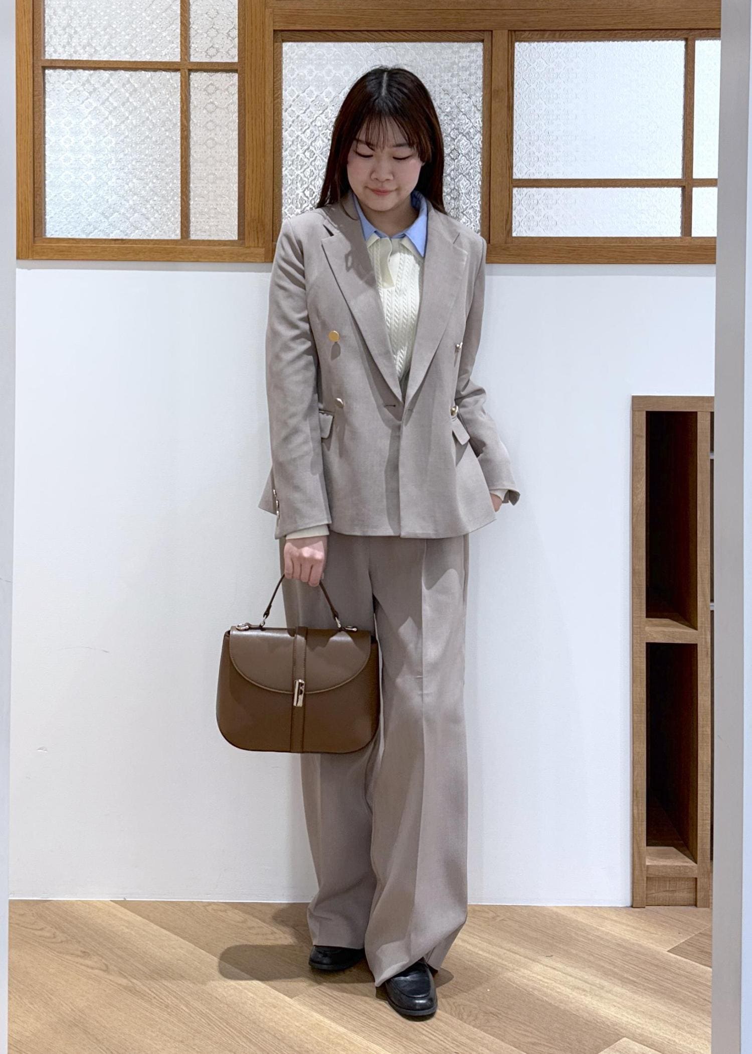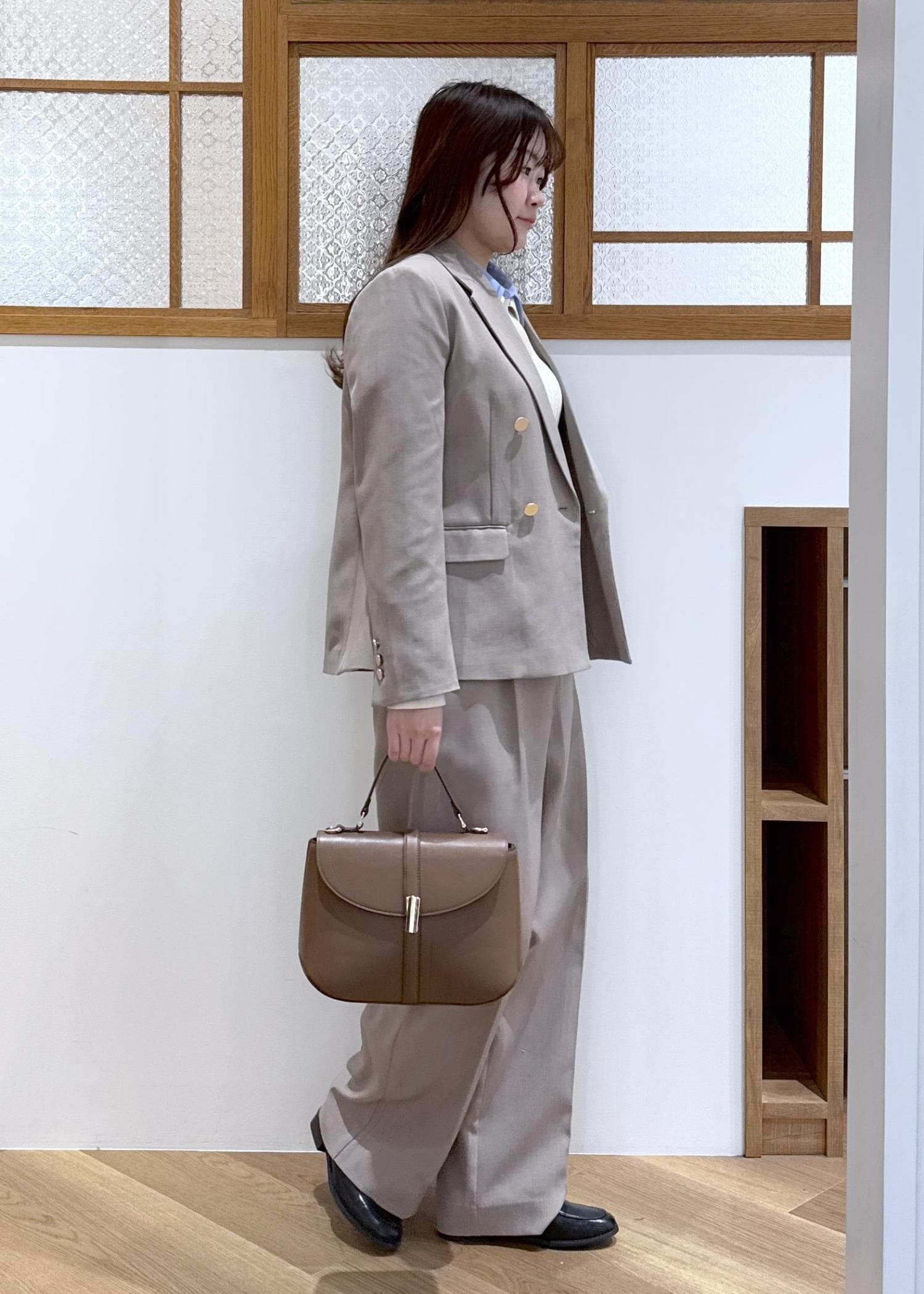 きれい見えするベージュのセットアップを着用したお仕事コーデです。