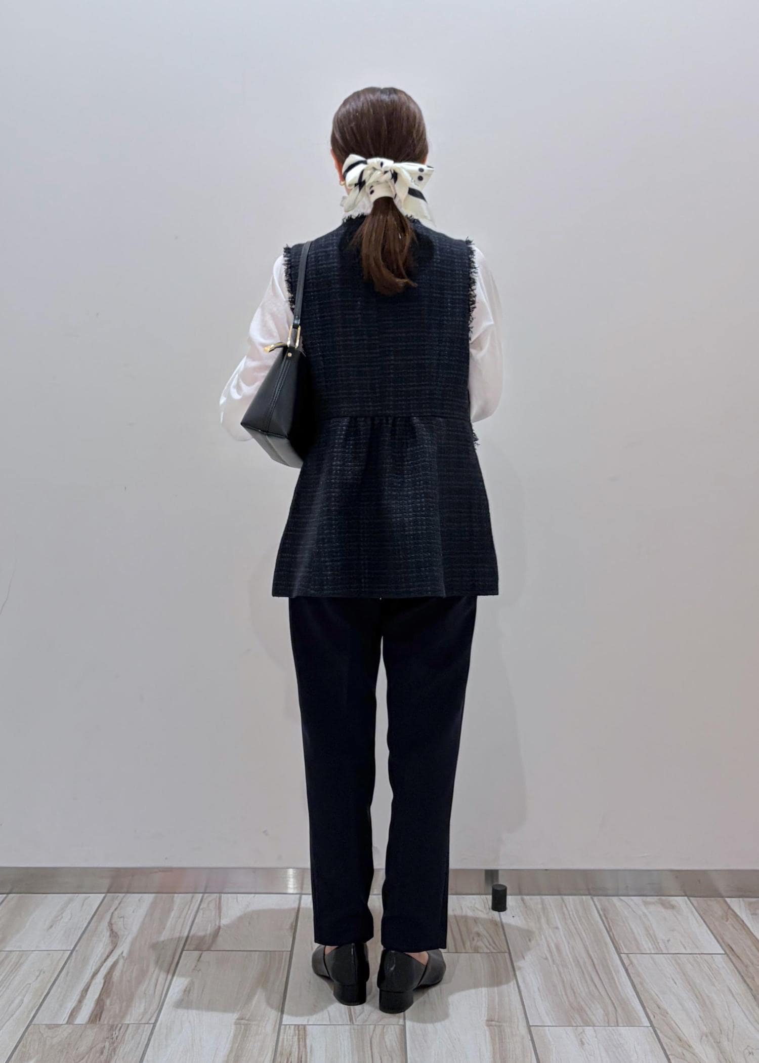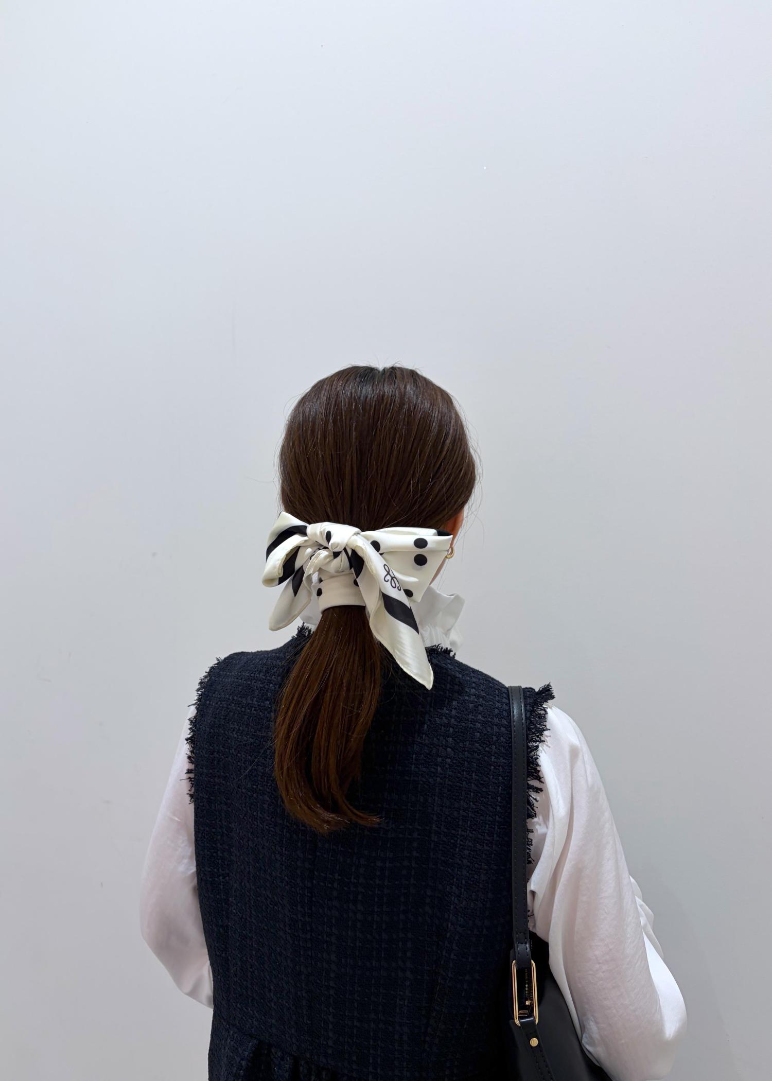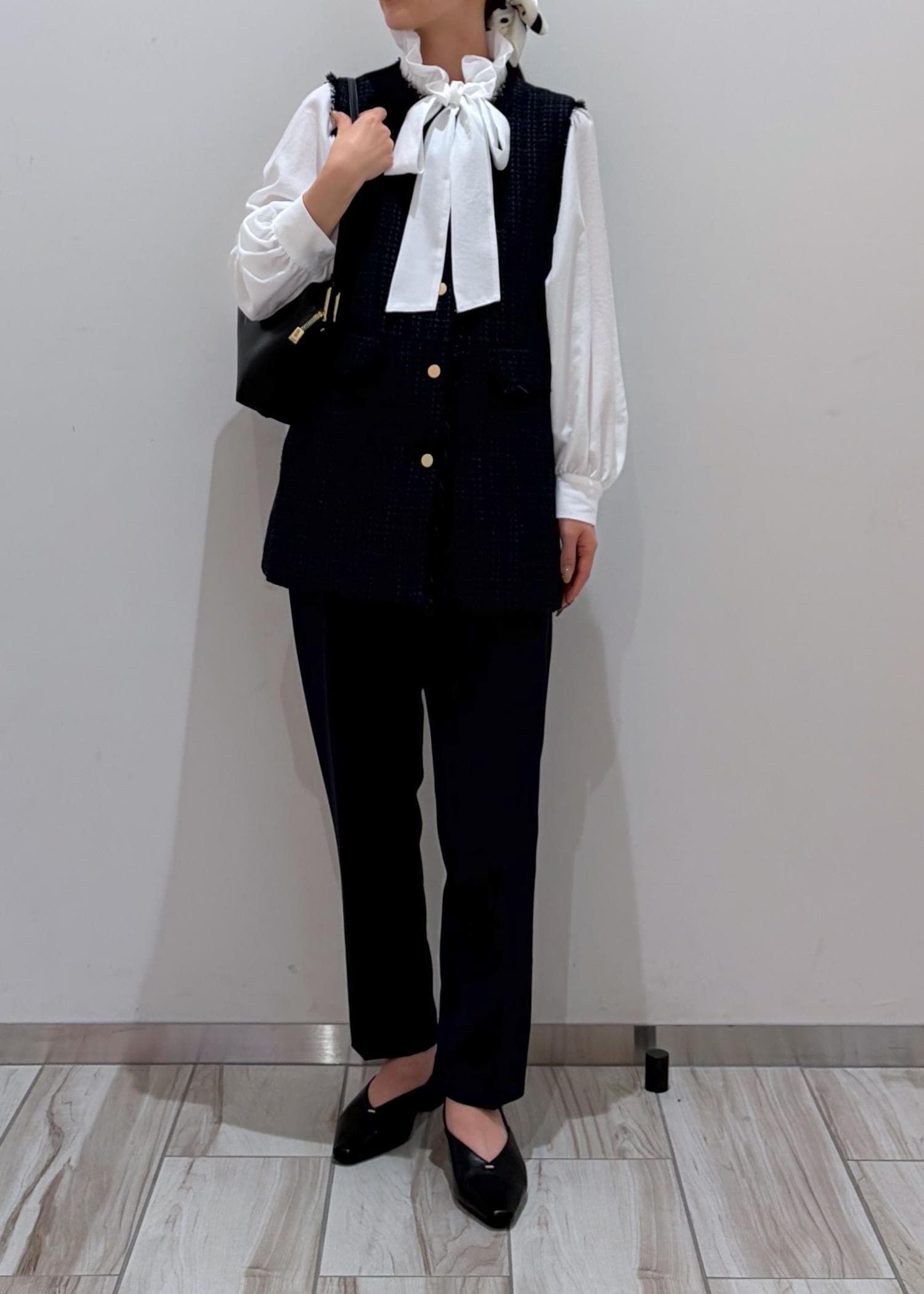 バックとパンプスは黒で締め、全体的に白、ネイビー、黒でまとめ、スカーフをヘアアクセにし華やかさをプラスしました♪