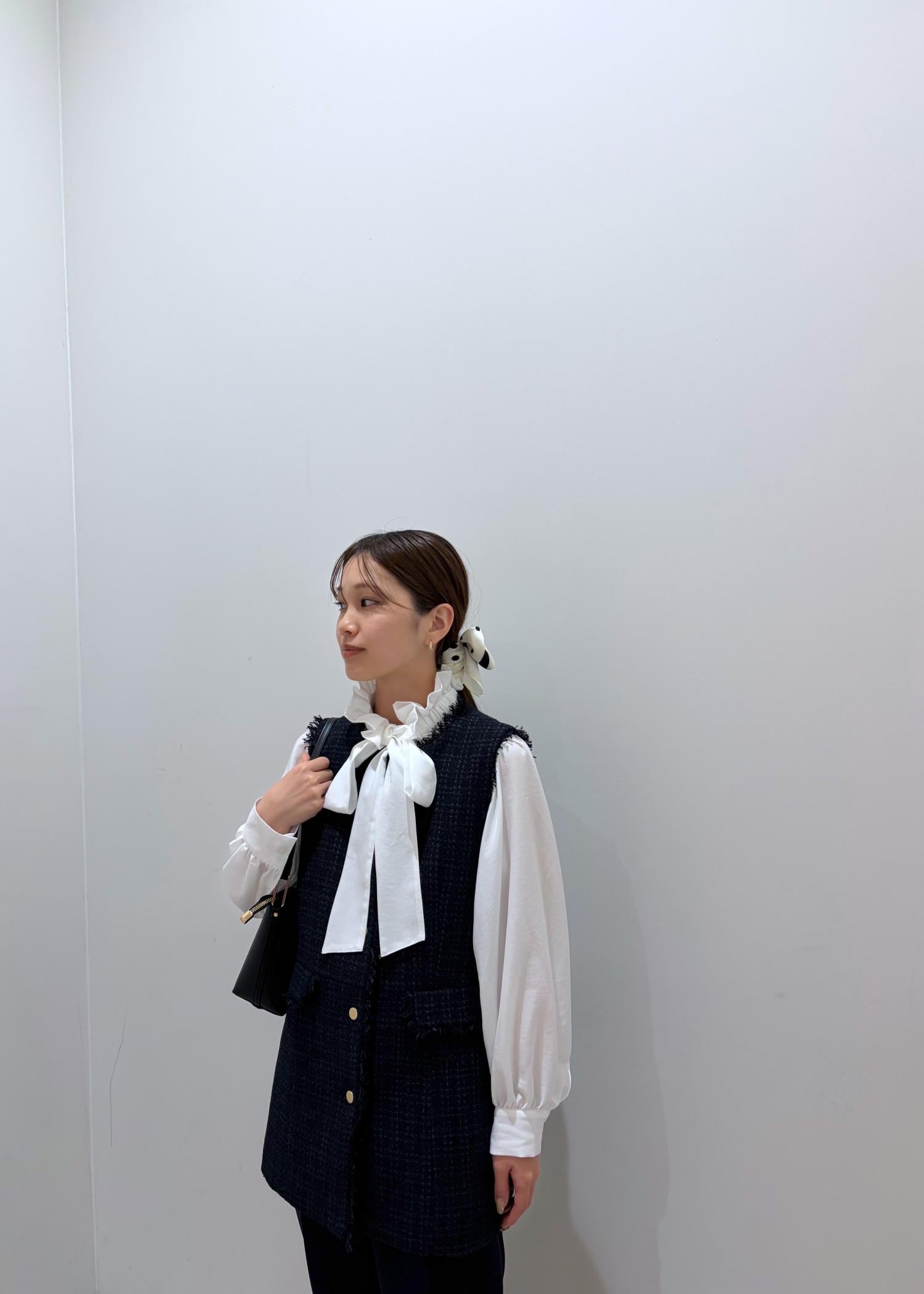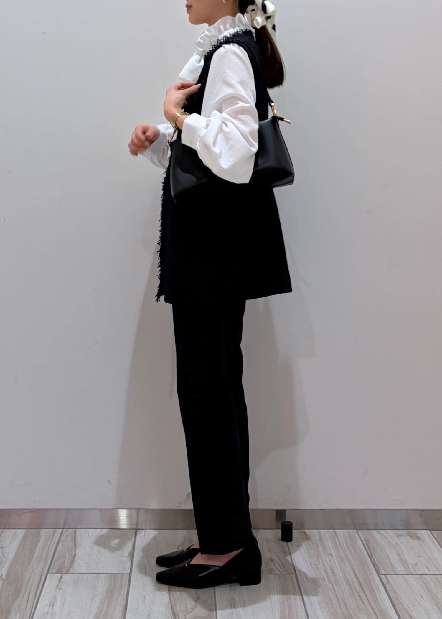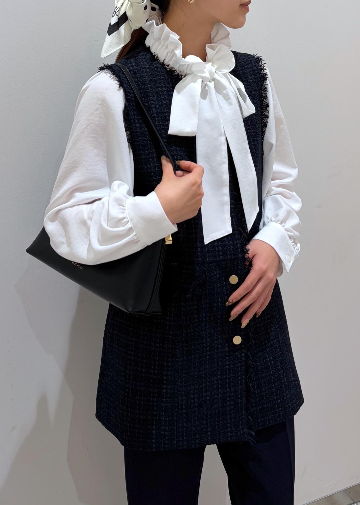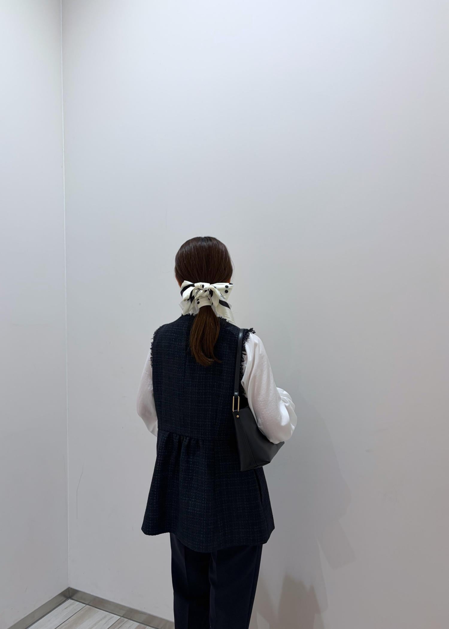 バックとパンプスは黒で締め、全体的に白、ネイビー、黒でまとめ、スカーフをヘアアクセにし華やかさをプラスしました♪