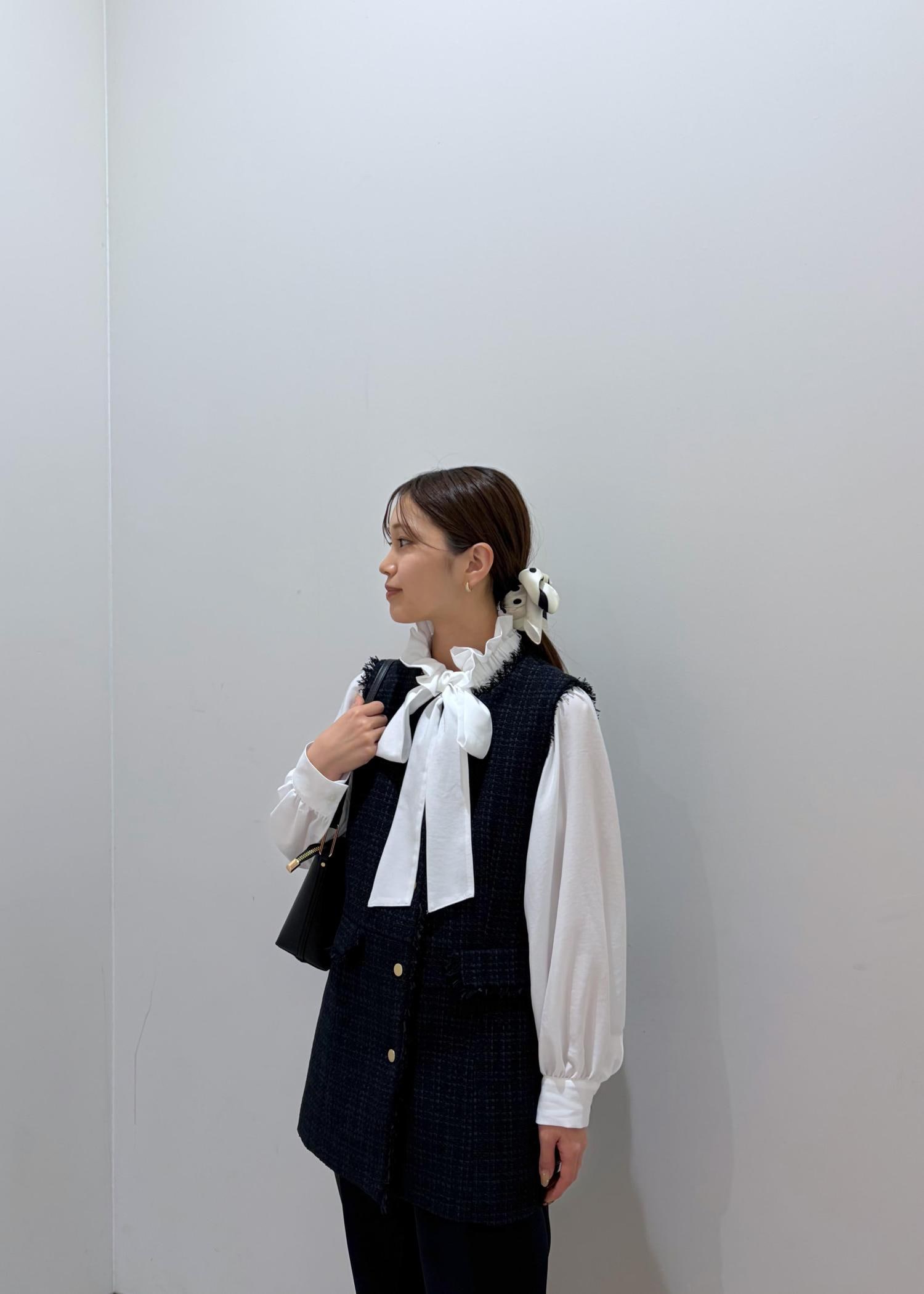 ペプラム切り替えのジレと、首元が華やかなブラウスでセレモニーコーデを組んでみました。