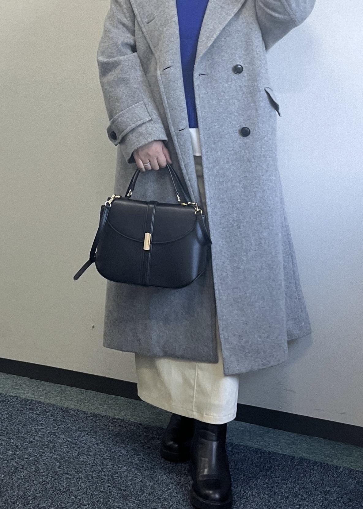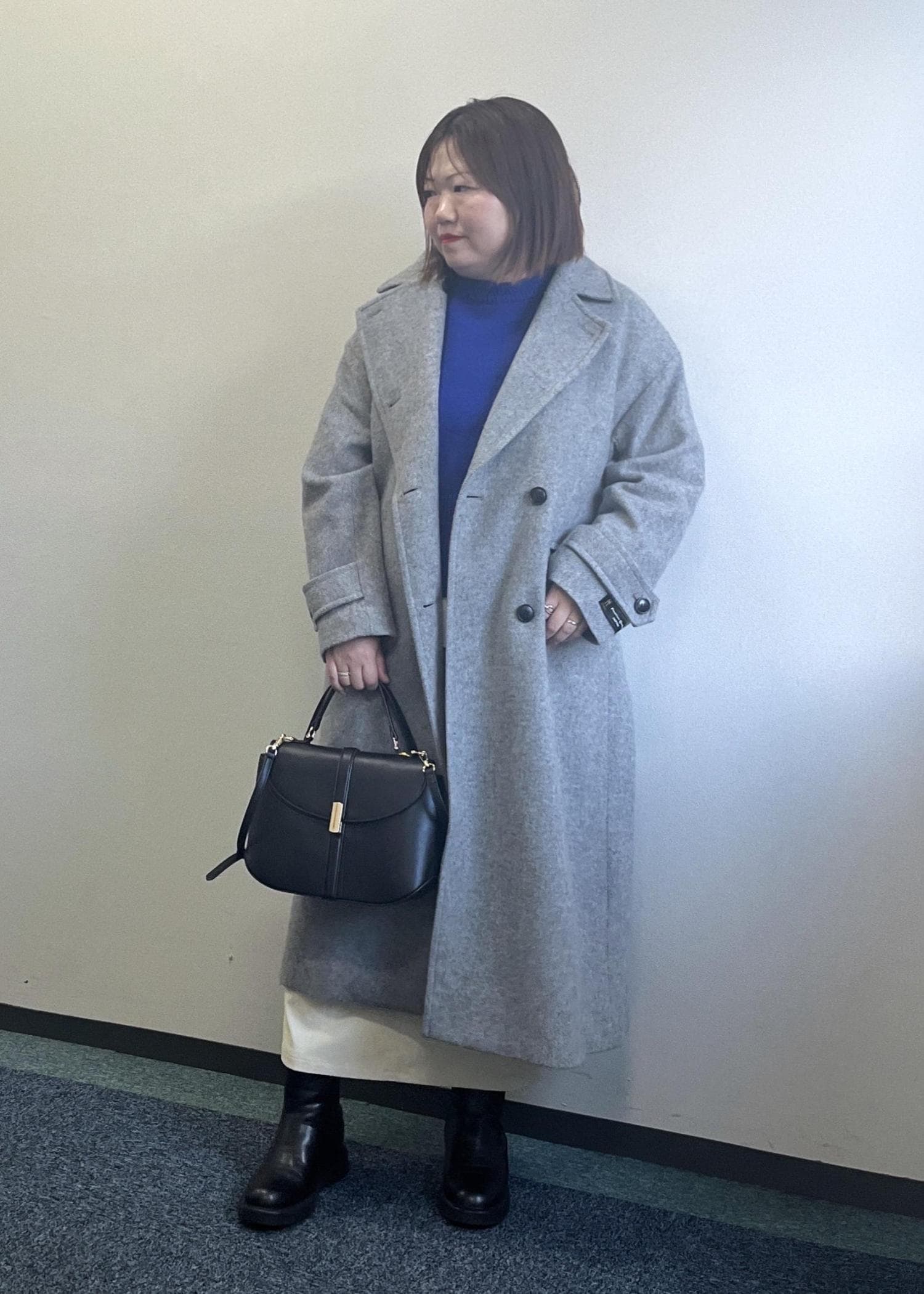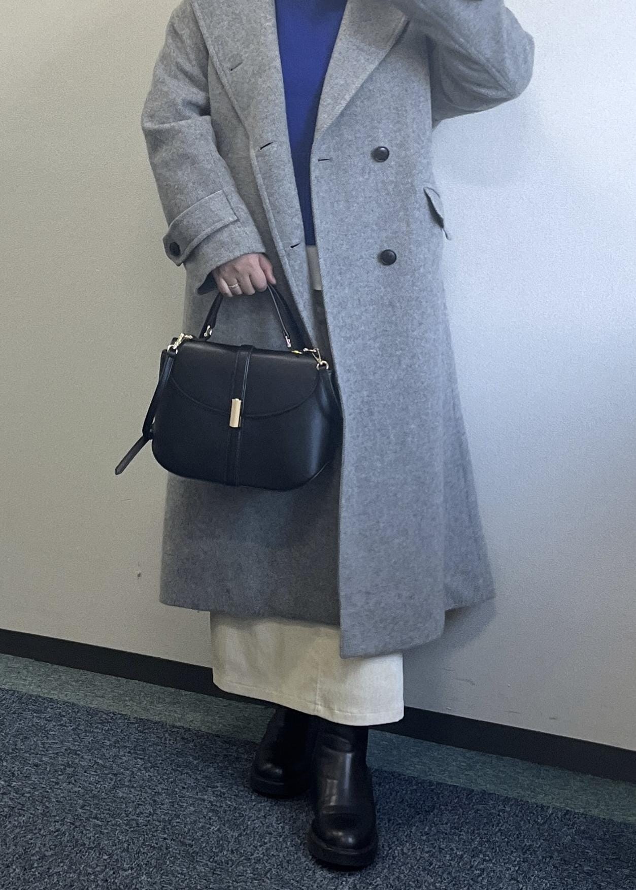ブルーのニットにグレーのロングコートを合わせた大人っぽいコーディネートです。