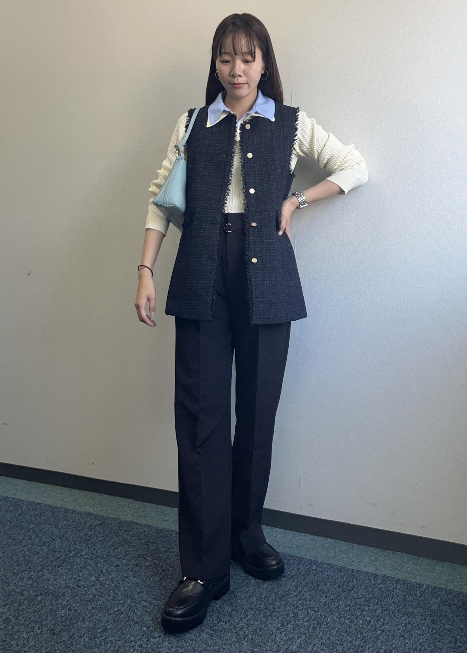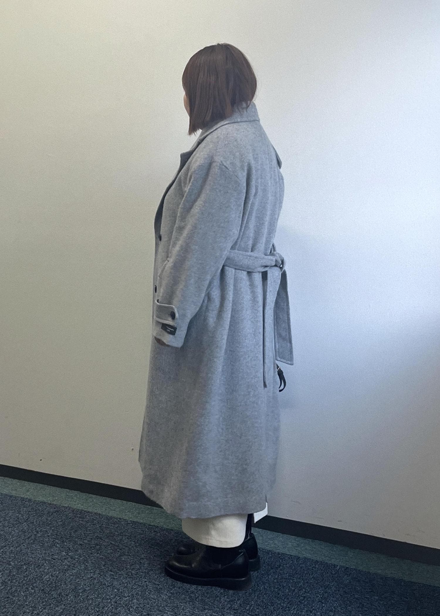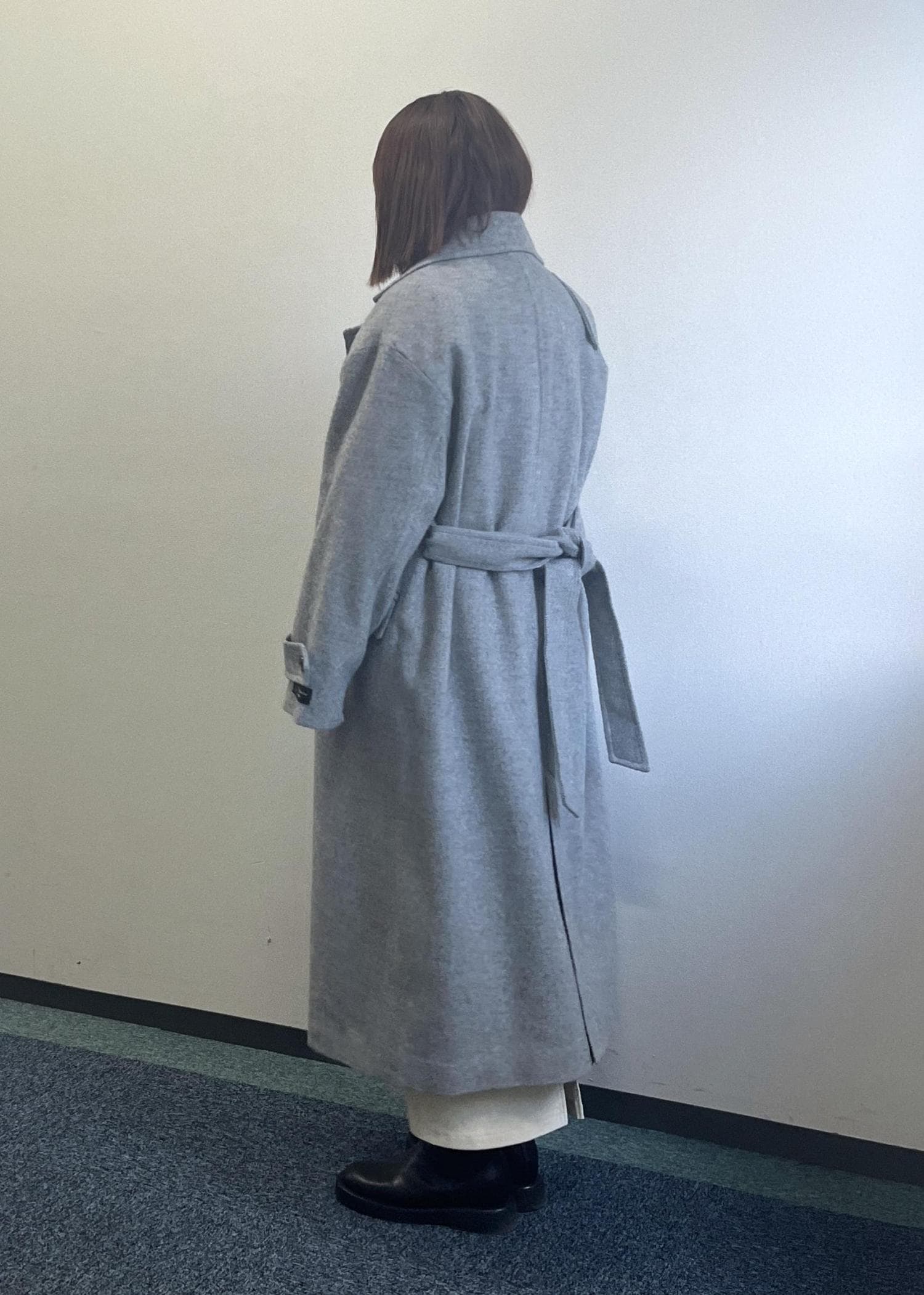 ブルーのニットにグレーのロングコートを合わせた大人っぽいコーディネートです。