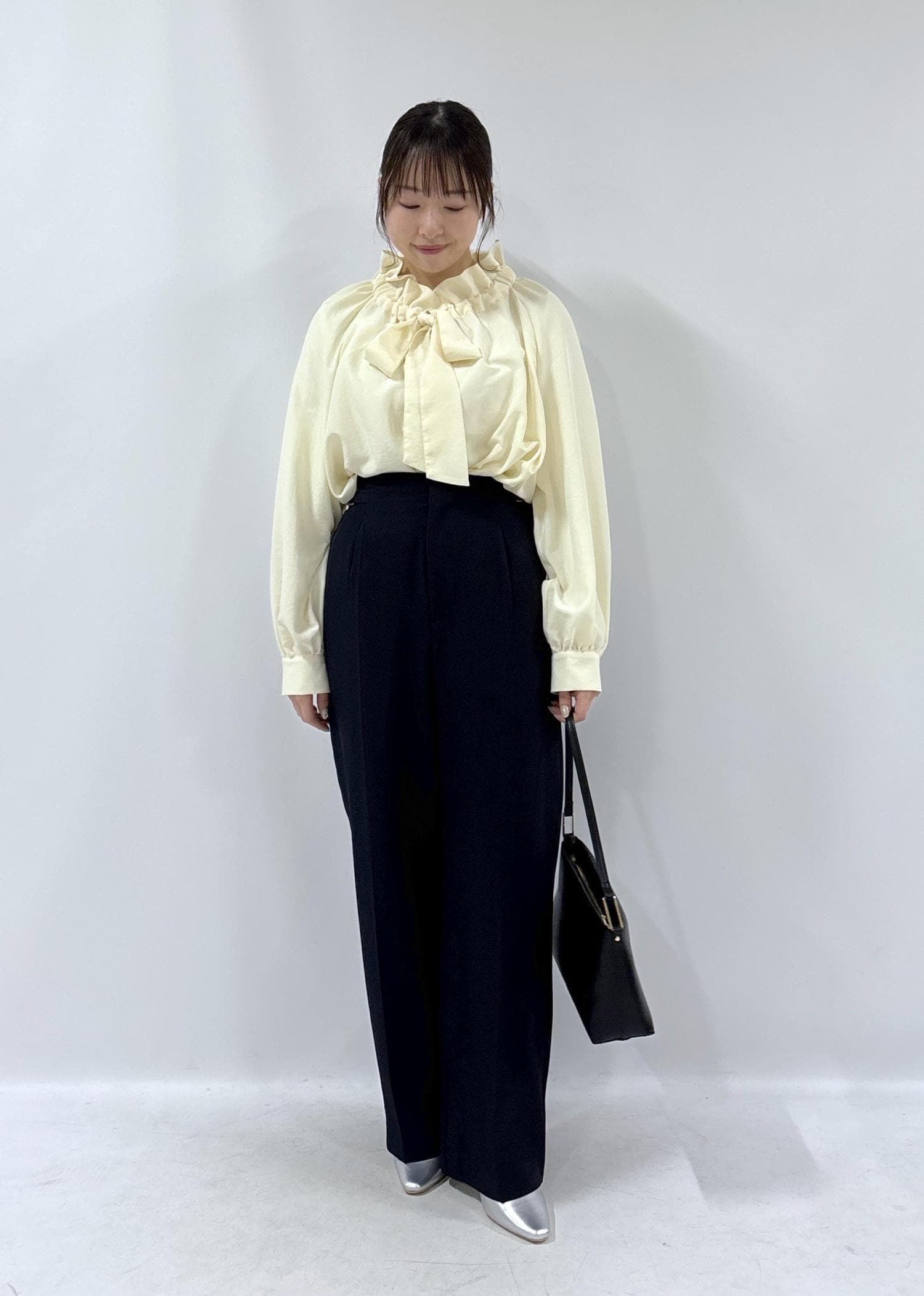 春らしいパステルイエローのブラウスを使用したオフィス向けキレイめコーデです。