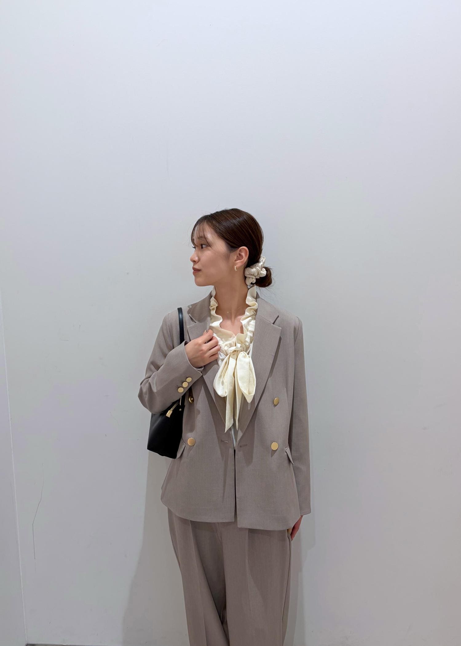 ベージュのセットアップコーデに、クリーム色のフリルブラウスを合わせ全体的に柔らかい雰囲気を出してみました◎小物とバックは黒で統一し、スタイリッシュにまとめました。