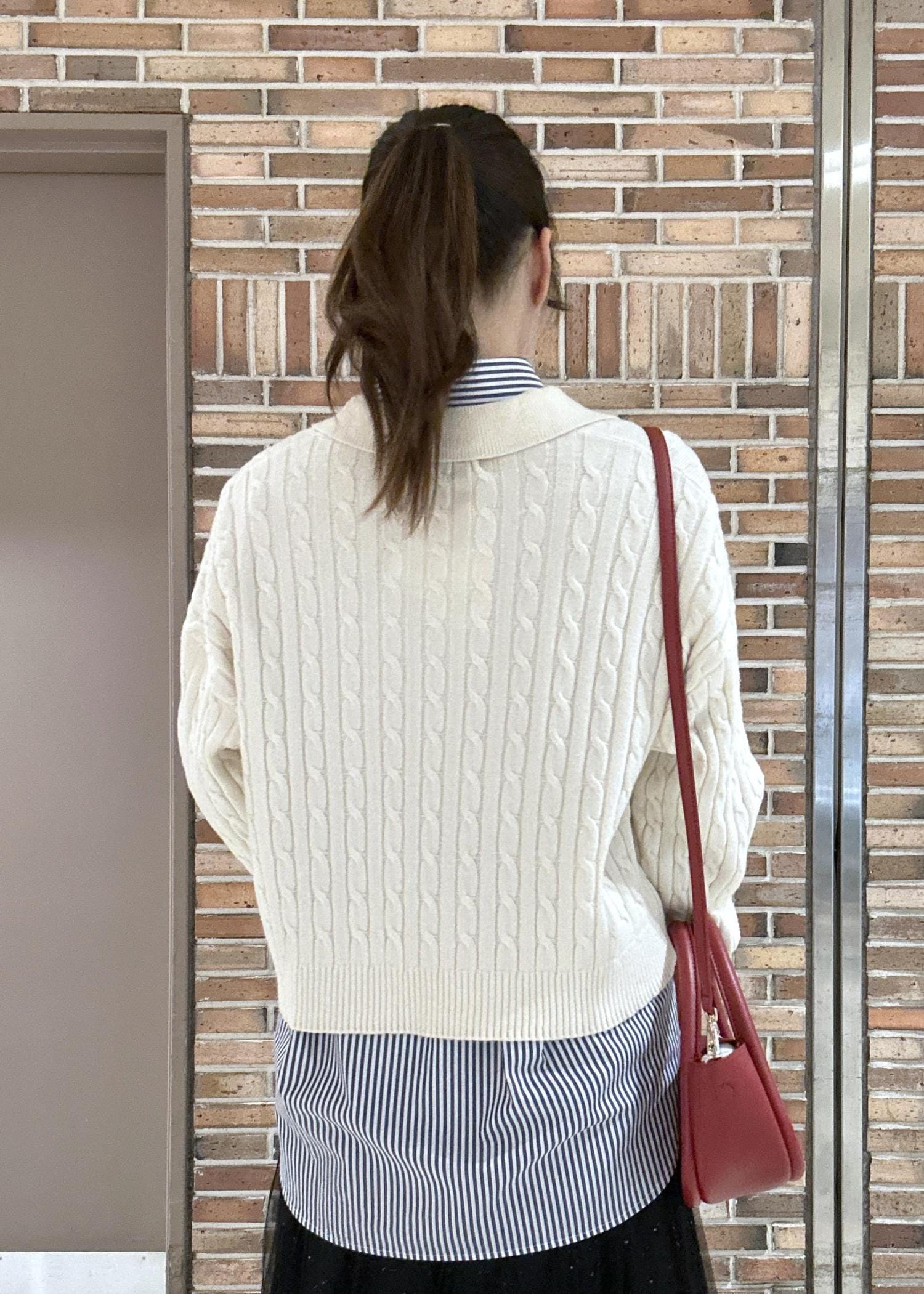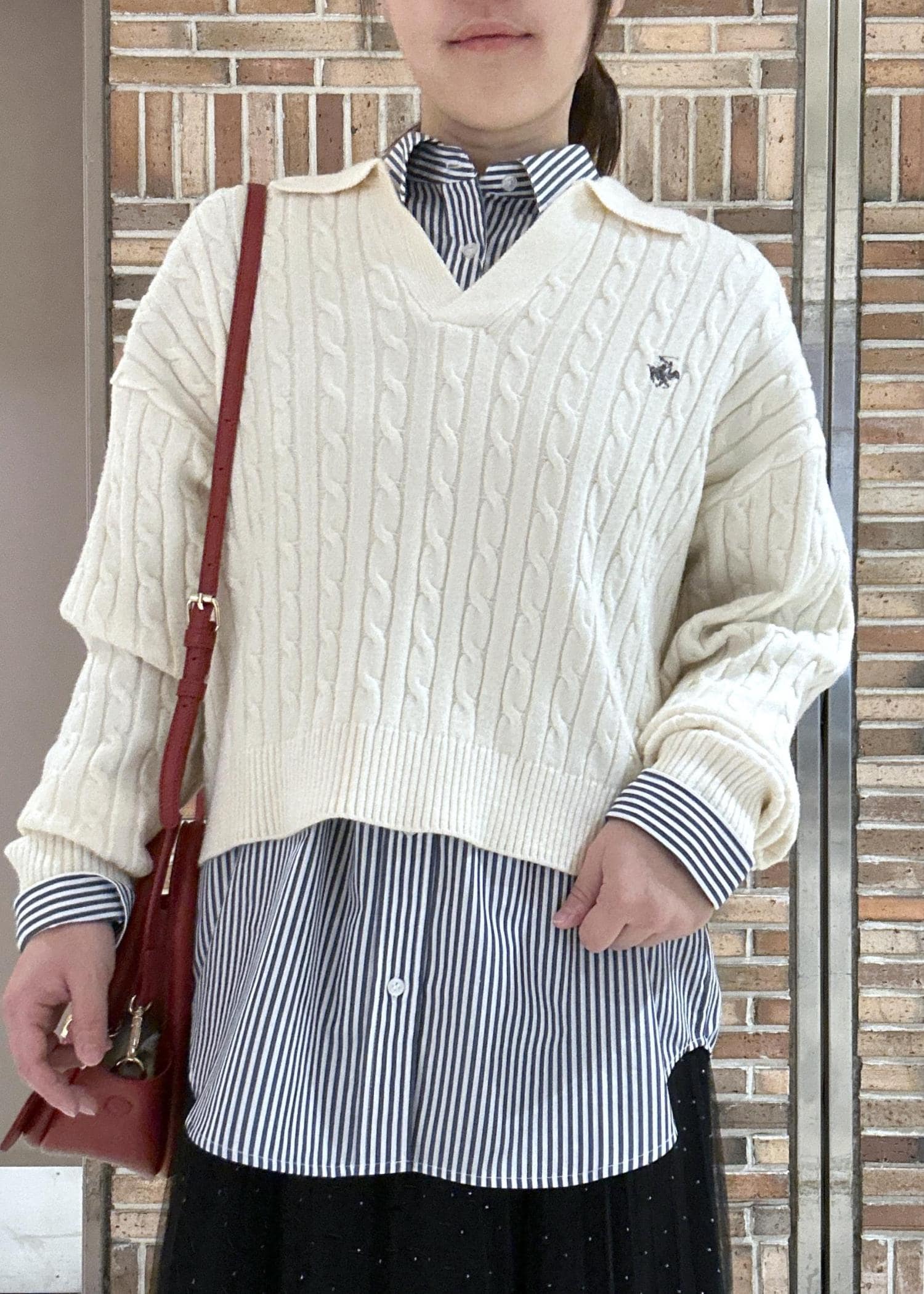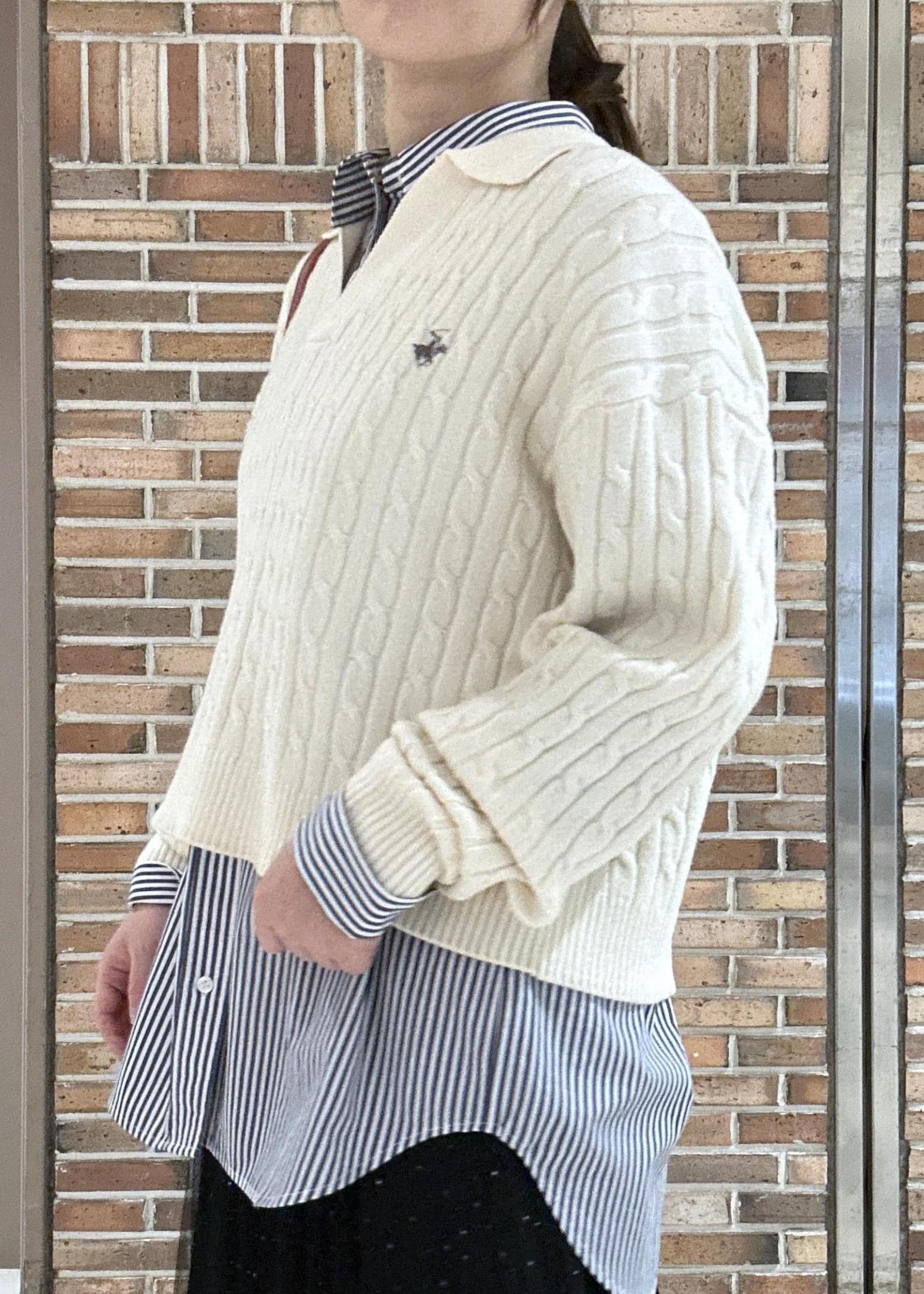ROPÉ PICNIC【BEVERLYHILLS POLO CLUB・新色追加】ケーブル編みクロップドスキッパーニットキナリ / F¥5,995レビューきれいめにもカジュアルにも合わせやすい、襟付きニット。柔らかいニットなのでチクチクしにくく、さらっと着られます。