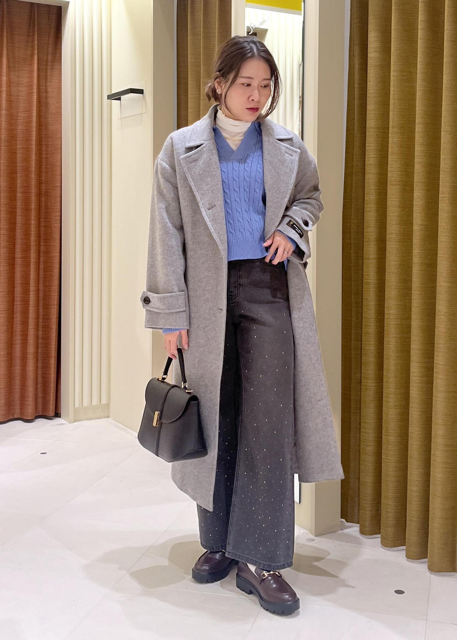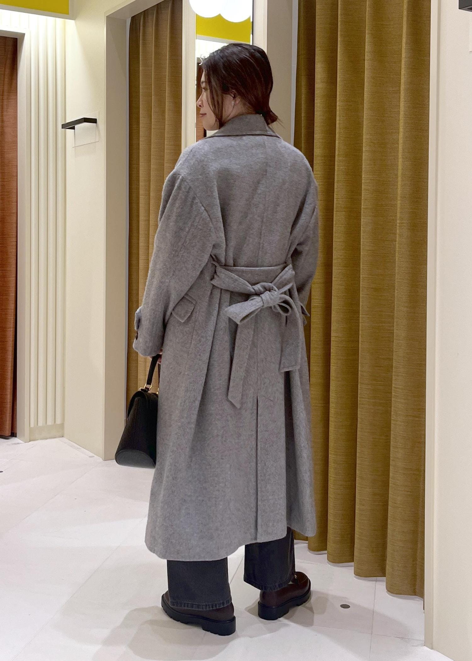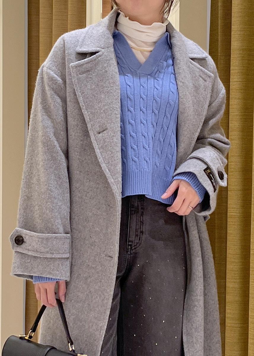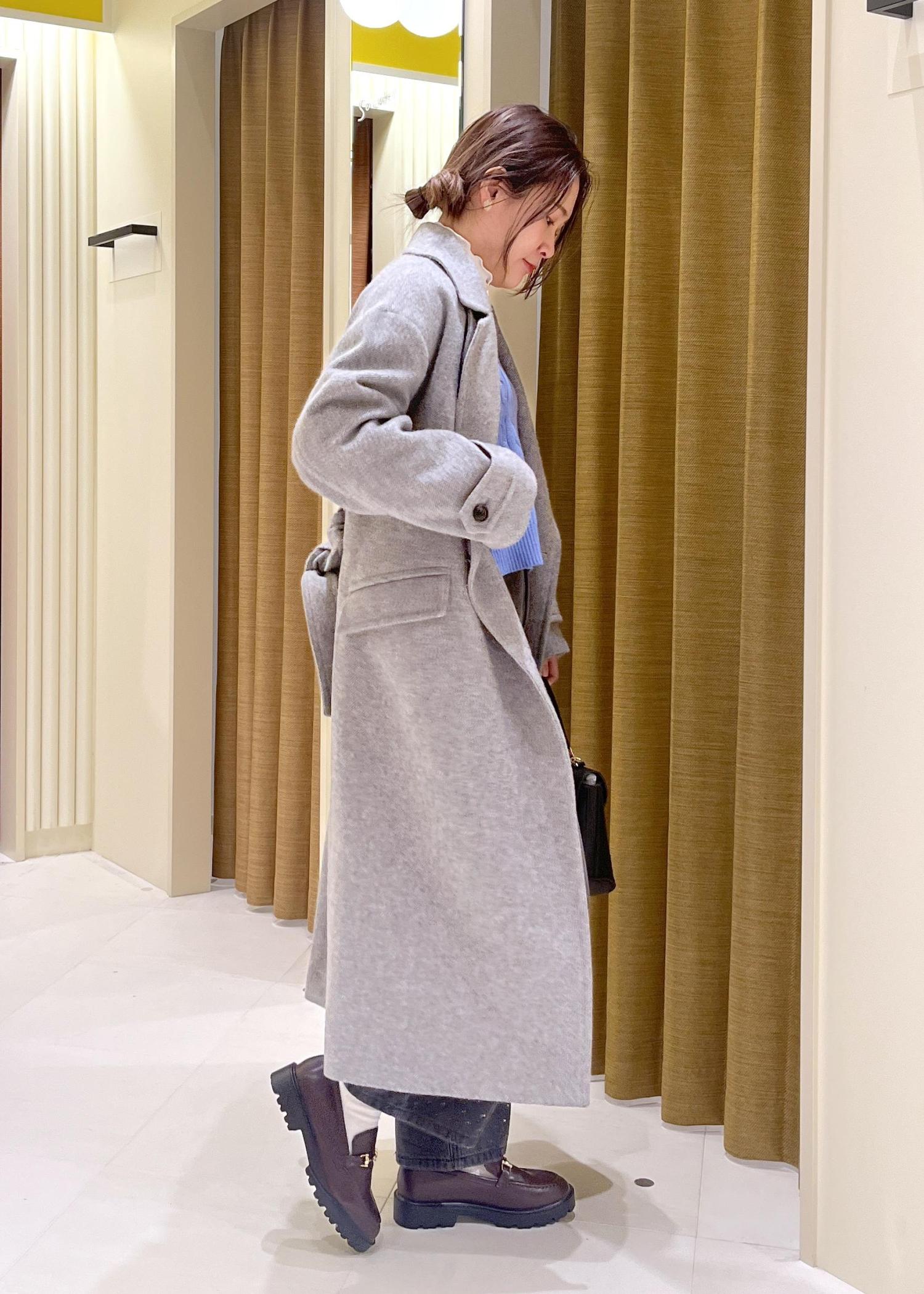 ROPÉ PICNICJAPAN FABRIC スタンドカラーロングコート/一部WEB限定カラーライトグレー / F¥15,840レビュー161cmの方が着用で、すねあたりの丈感。足を覆ってくれるので前を閉じれば風を通さずとても暖かく着用できます。ウール素材で少しふわっと羽毛立ちのある素材。ちくちく感はあまり感じなかったです。