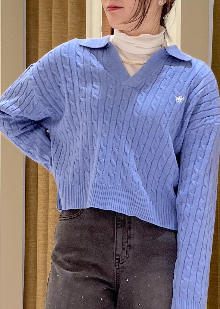 ブルーのニットは鮮やかで主役になるアイテムです。