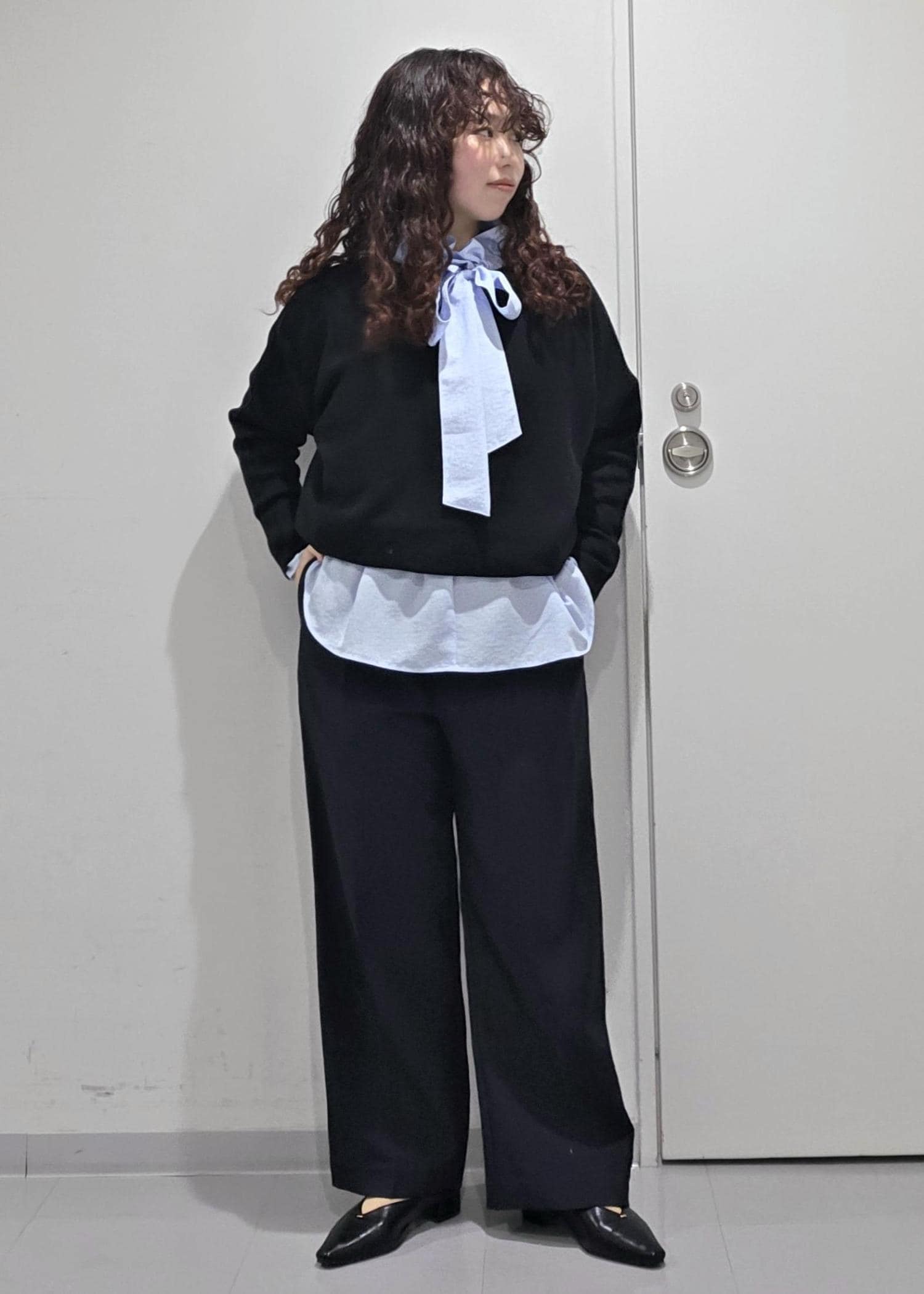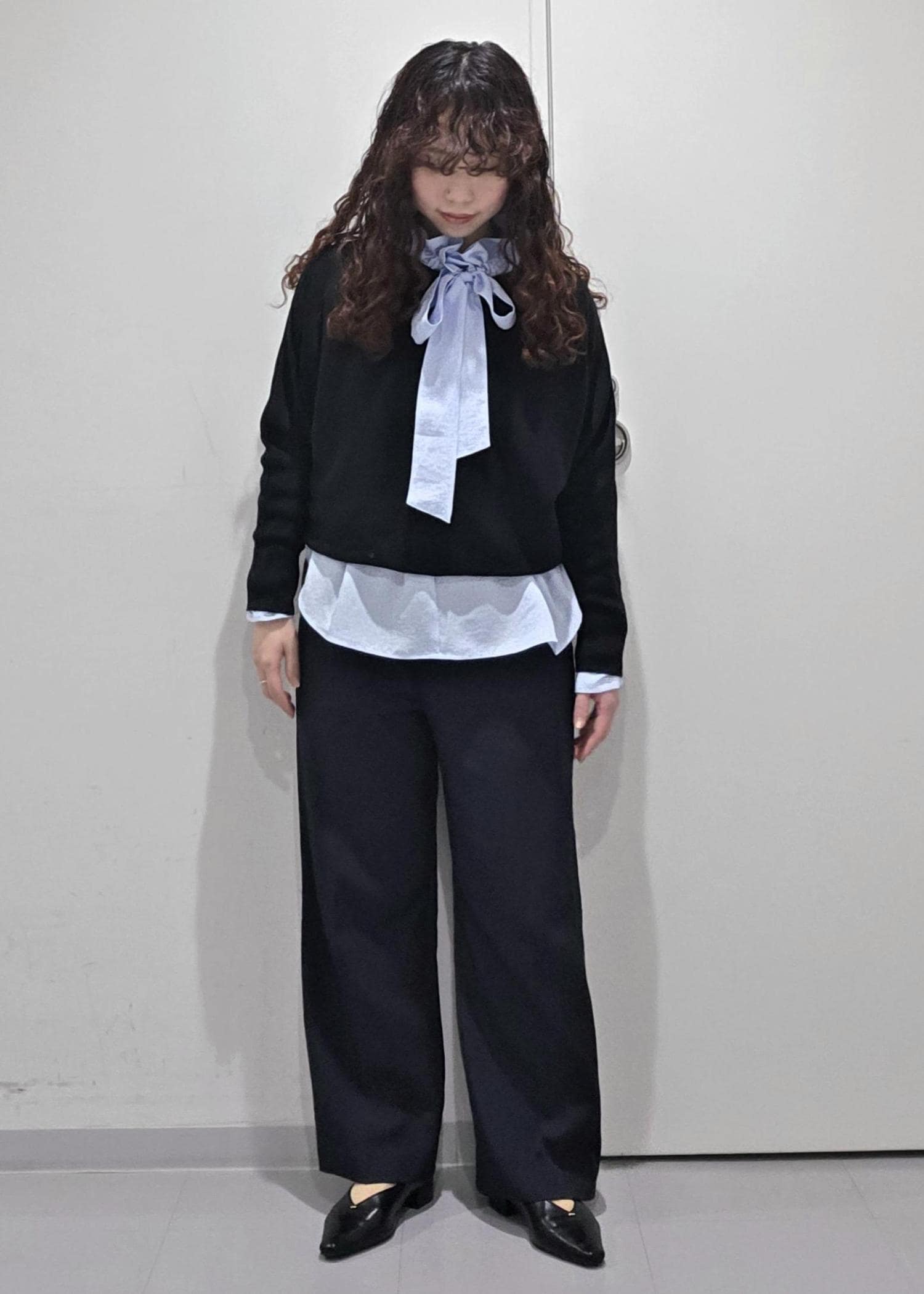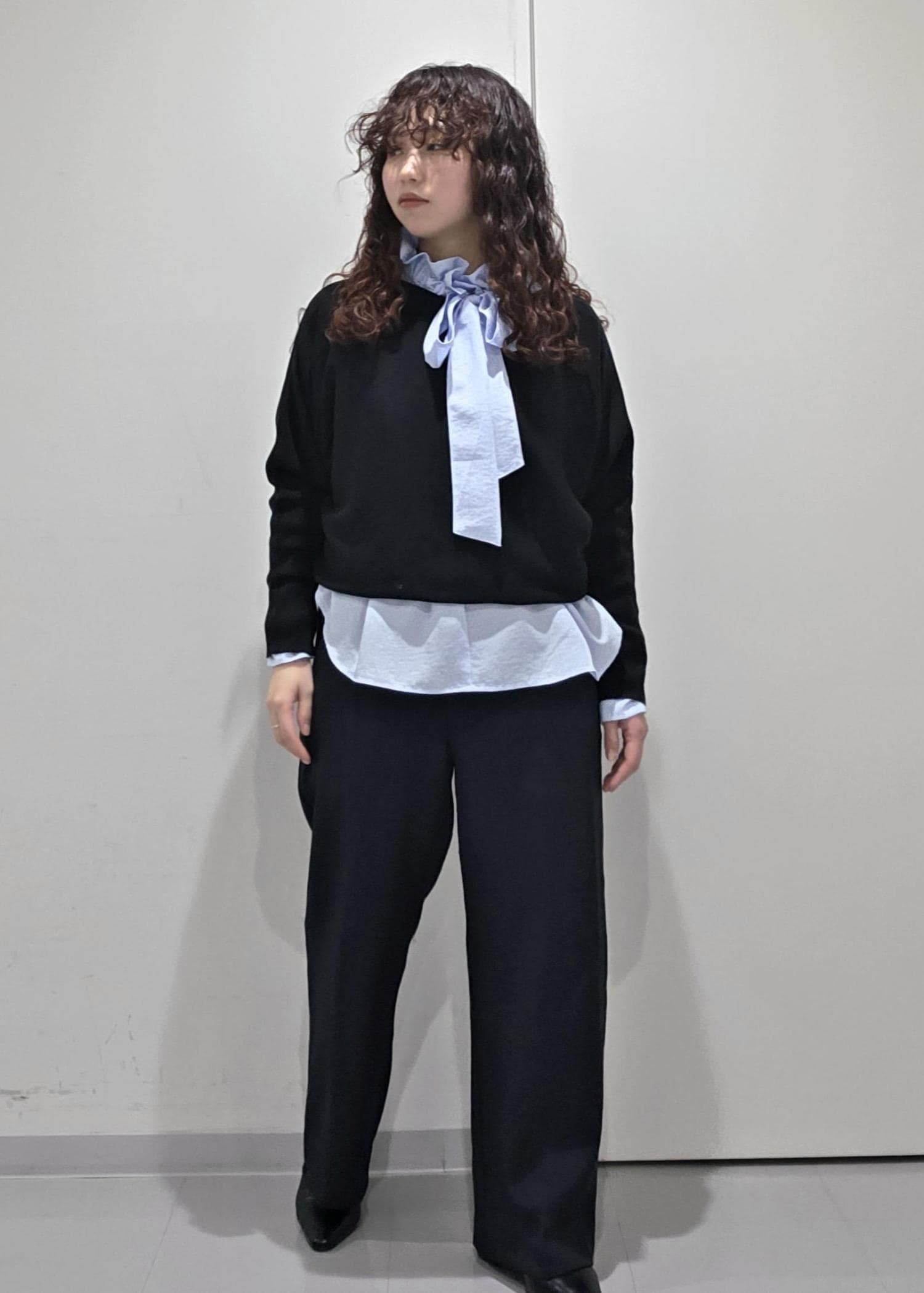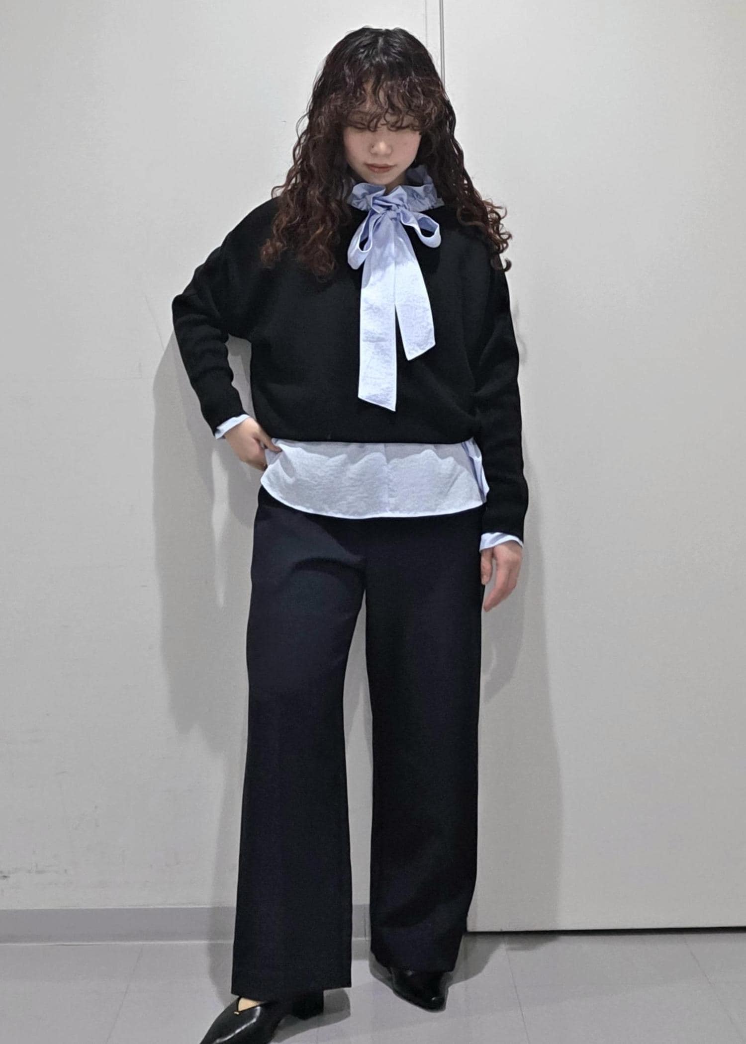 ブラックのトップスにネイビーのパンツだとシンプルなので、明るいブルーをイン。