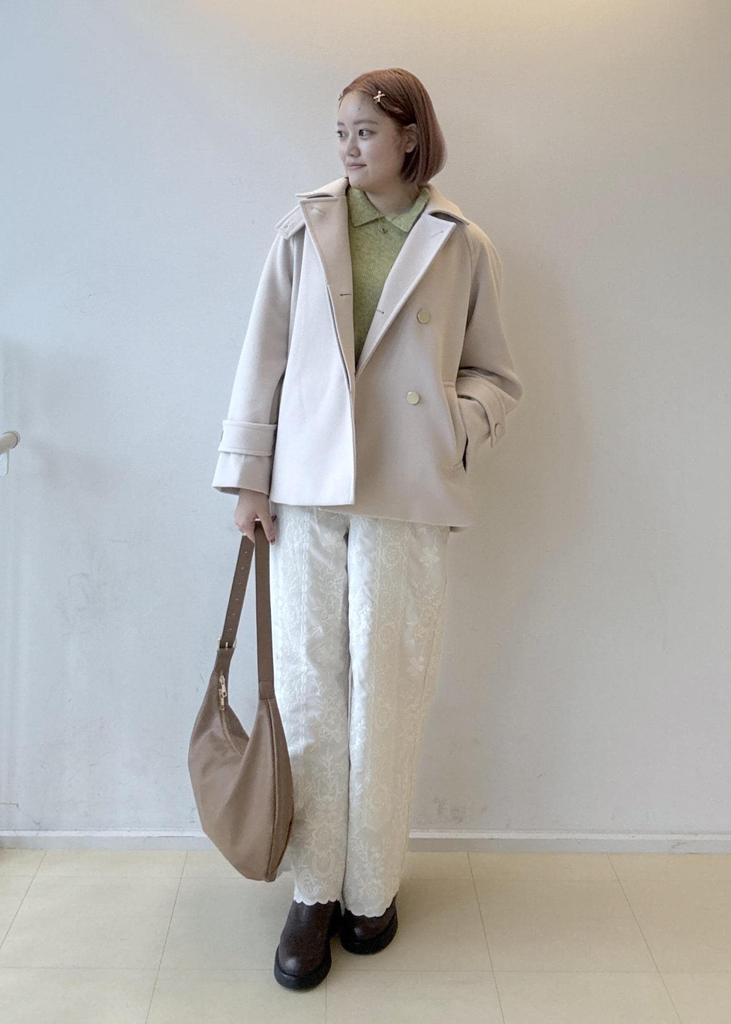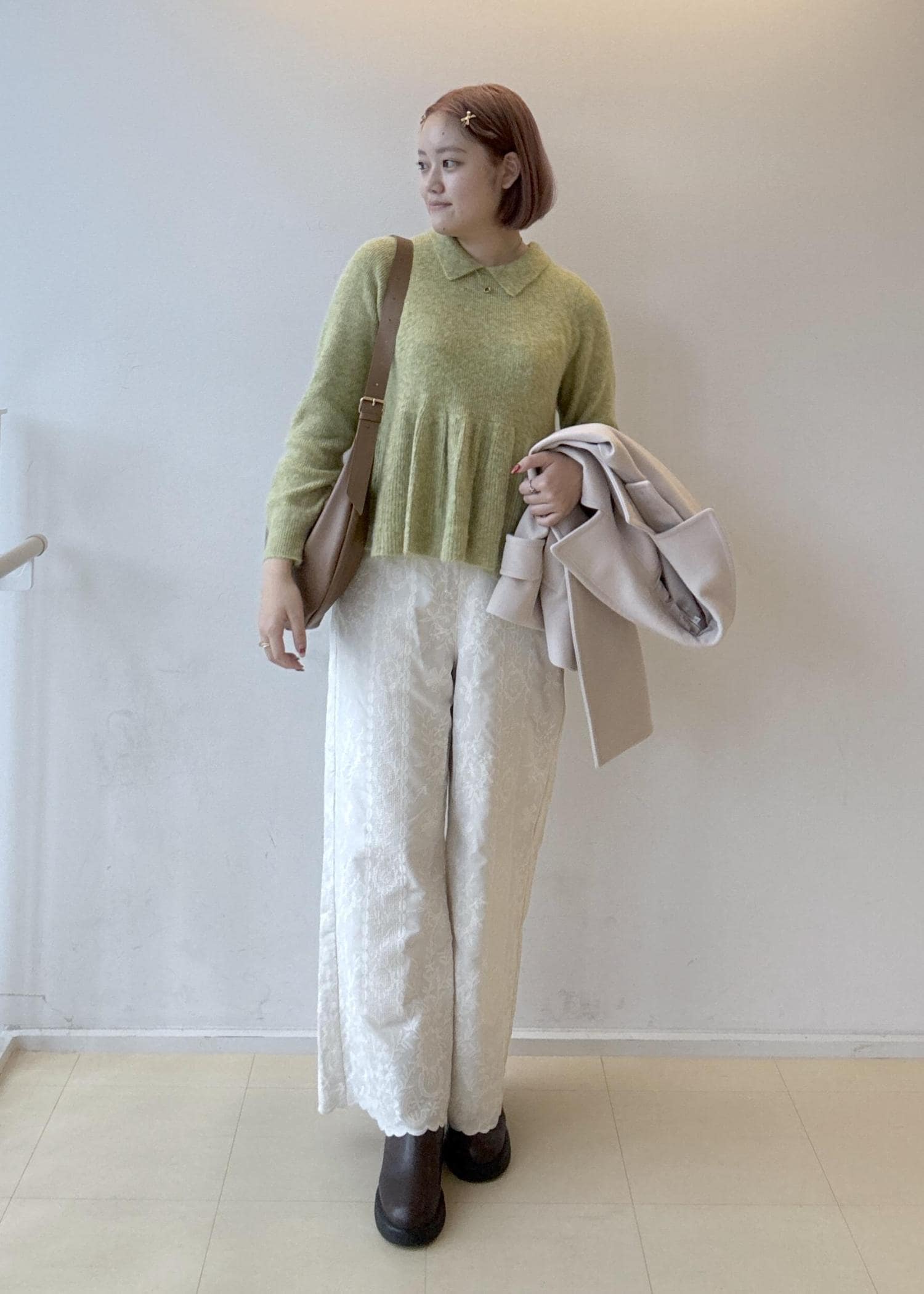 黄緑色を映えさせたかったので、アウターとパンツは白を合わせました。