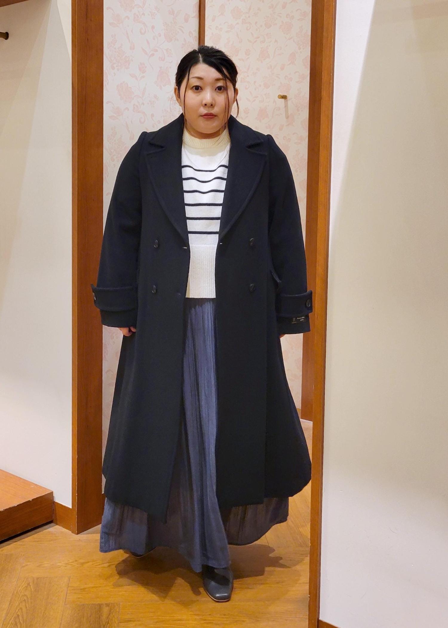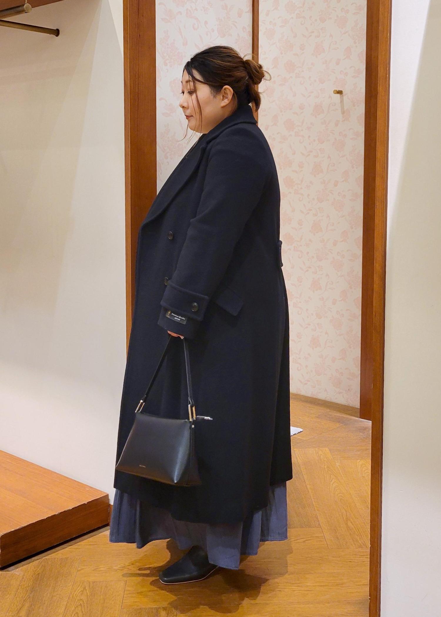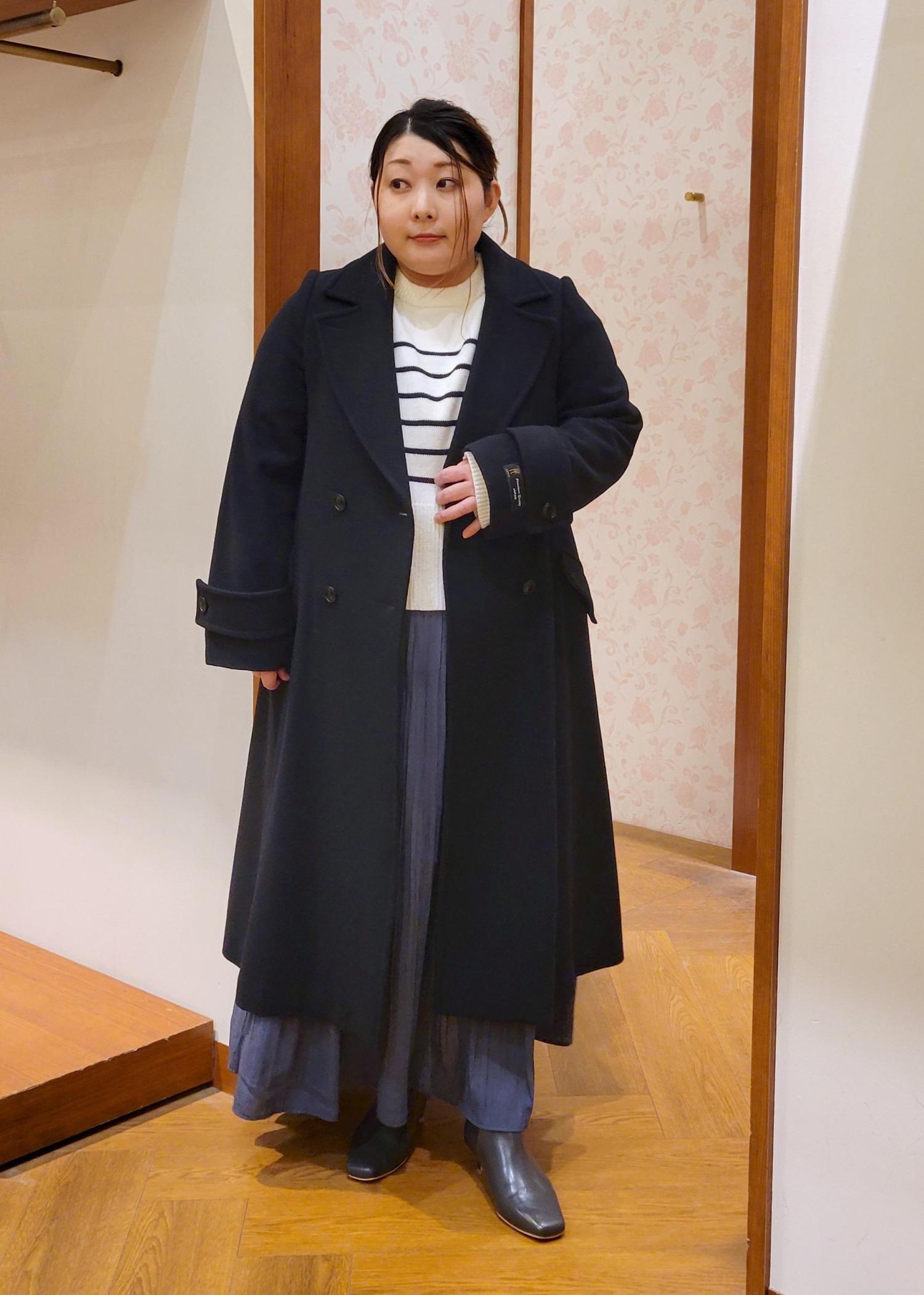 ROPÉ PICNICJAPAN FABRIC ダブルチェスターコート/一部WEB限定カラーブラック / F¥19,800レビュー普段Lサイズやフリーサイズを着用していますが、ニットを着てギリギリ着れるサイズ感で、コンパクトに感じました。上品なデザインなのでどんなシーンにも合います。