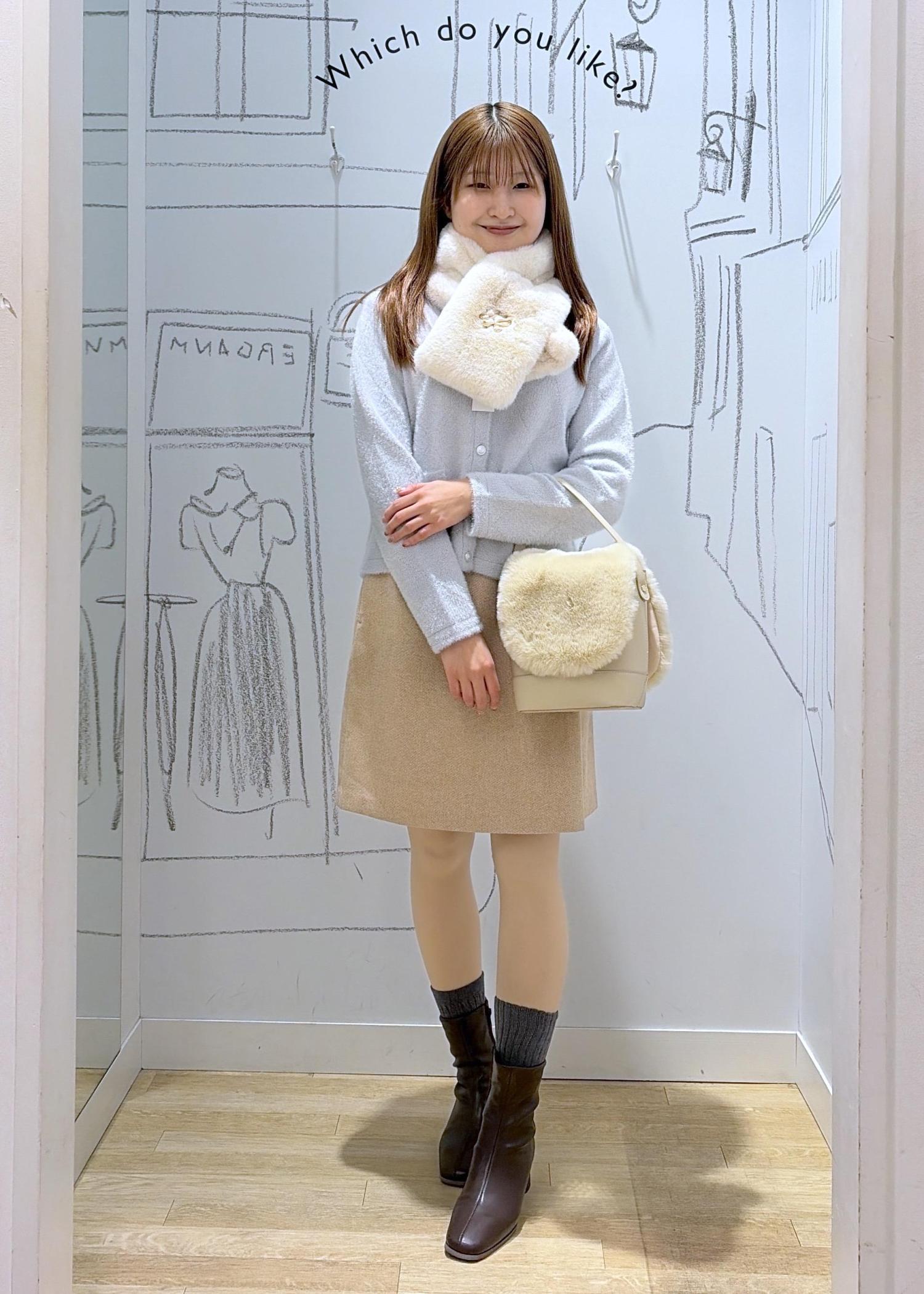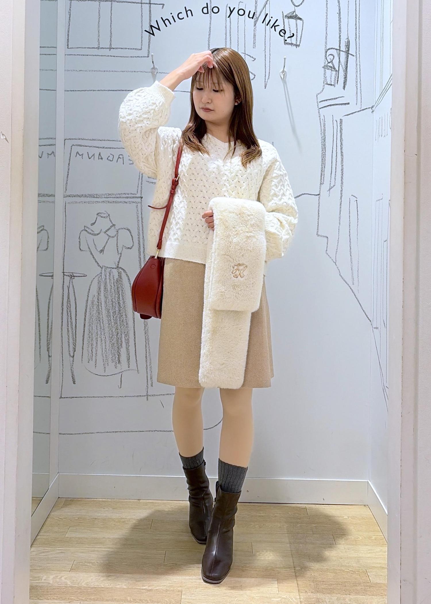 そして冬でも可愛くなりたい!そんな方へミニスカの中では長めタイプのベージュをチョイス!そして赤色のバックにより引き締まり、可愛さと上品さをup♡