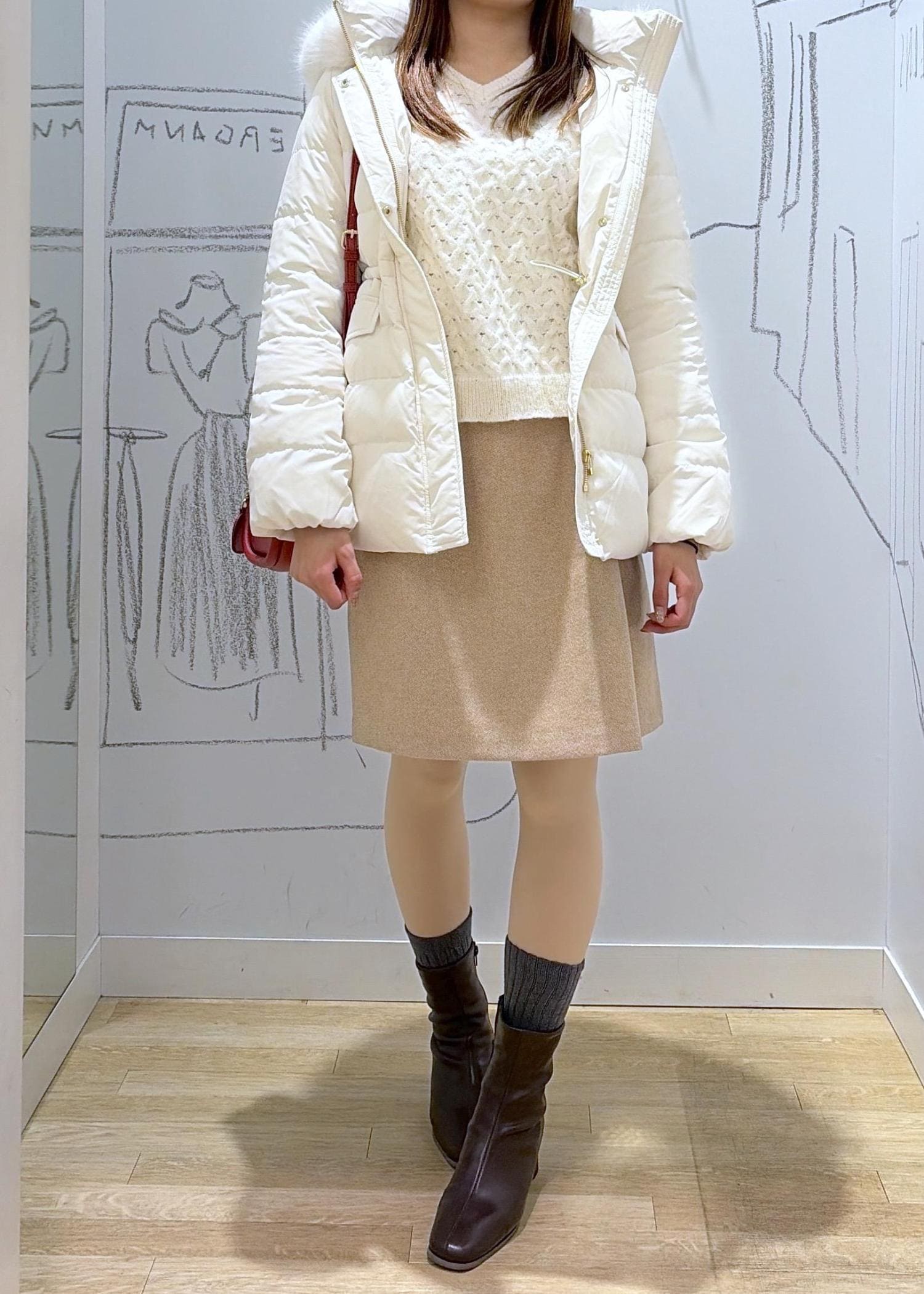 アウターとトップス白色に統一して甘く可愛い雰囲気に。