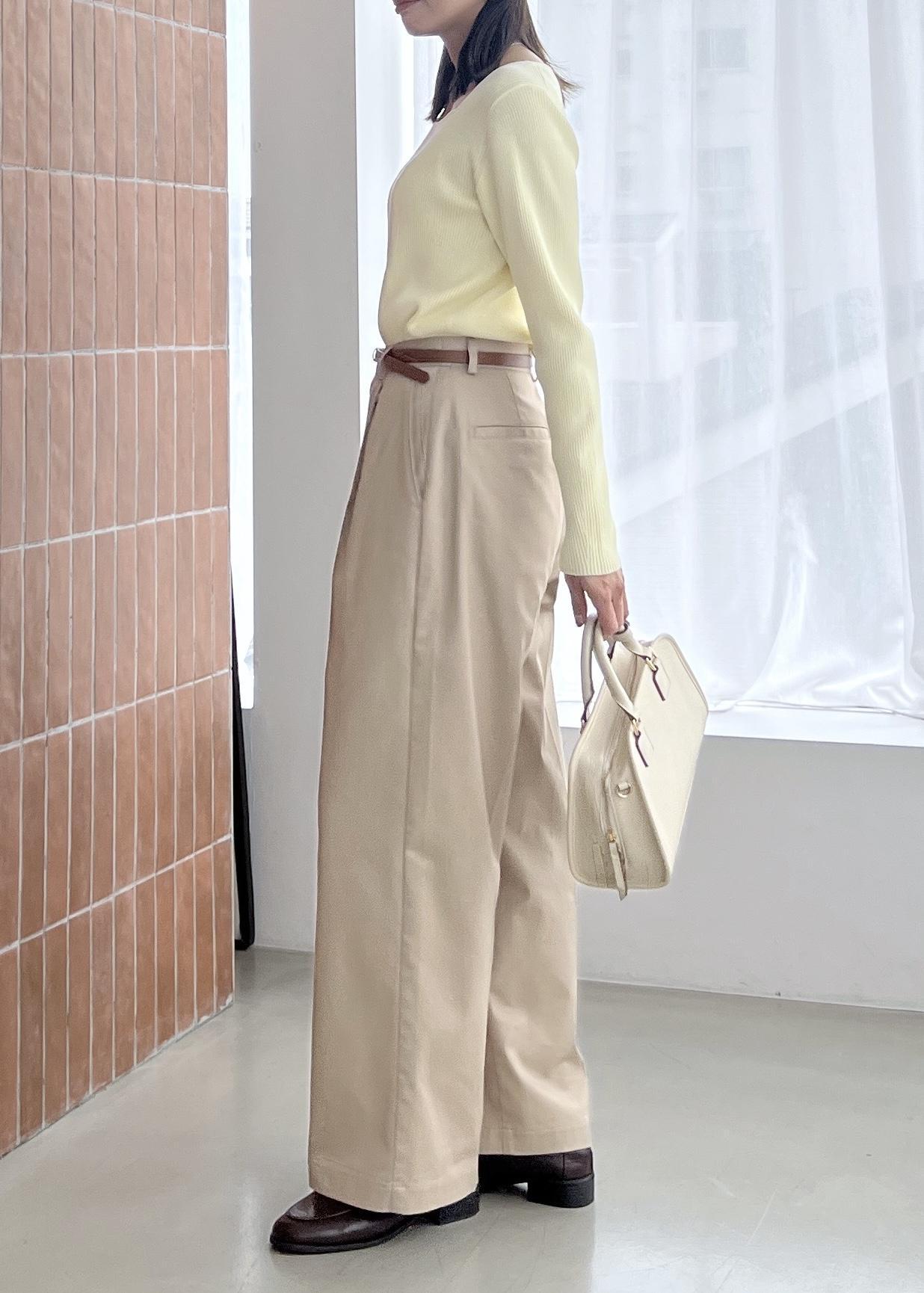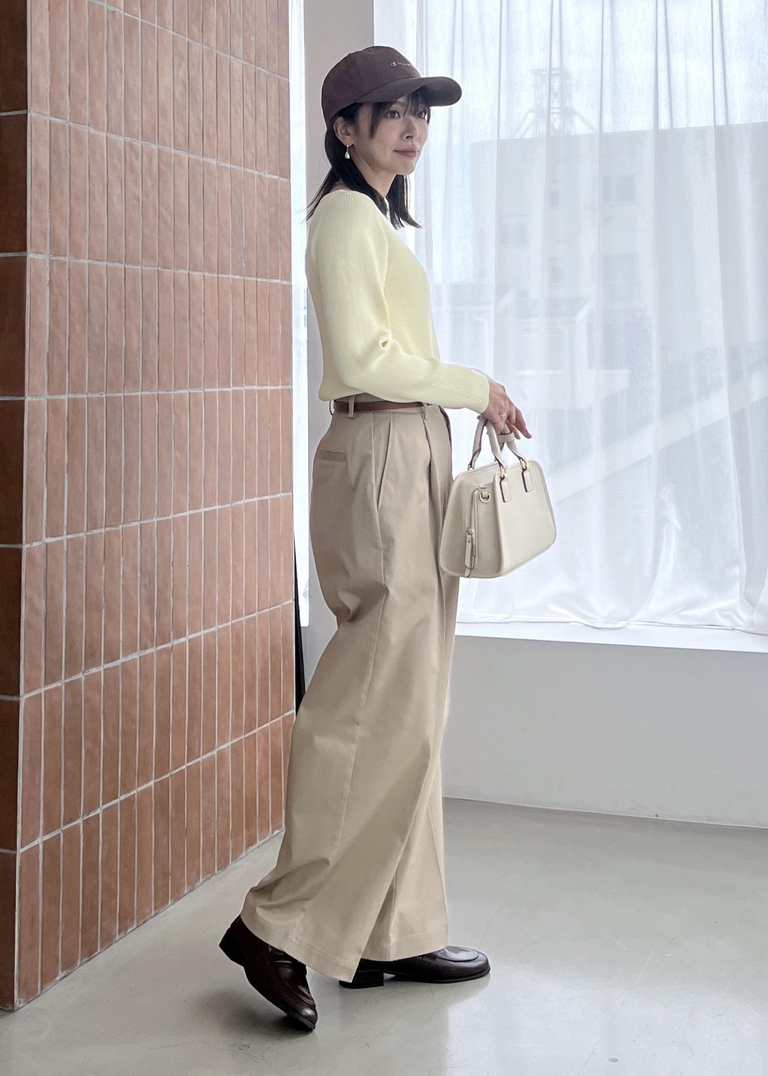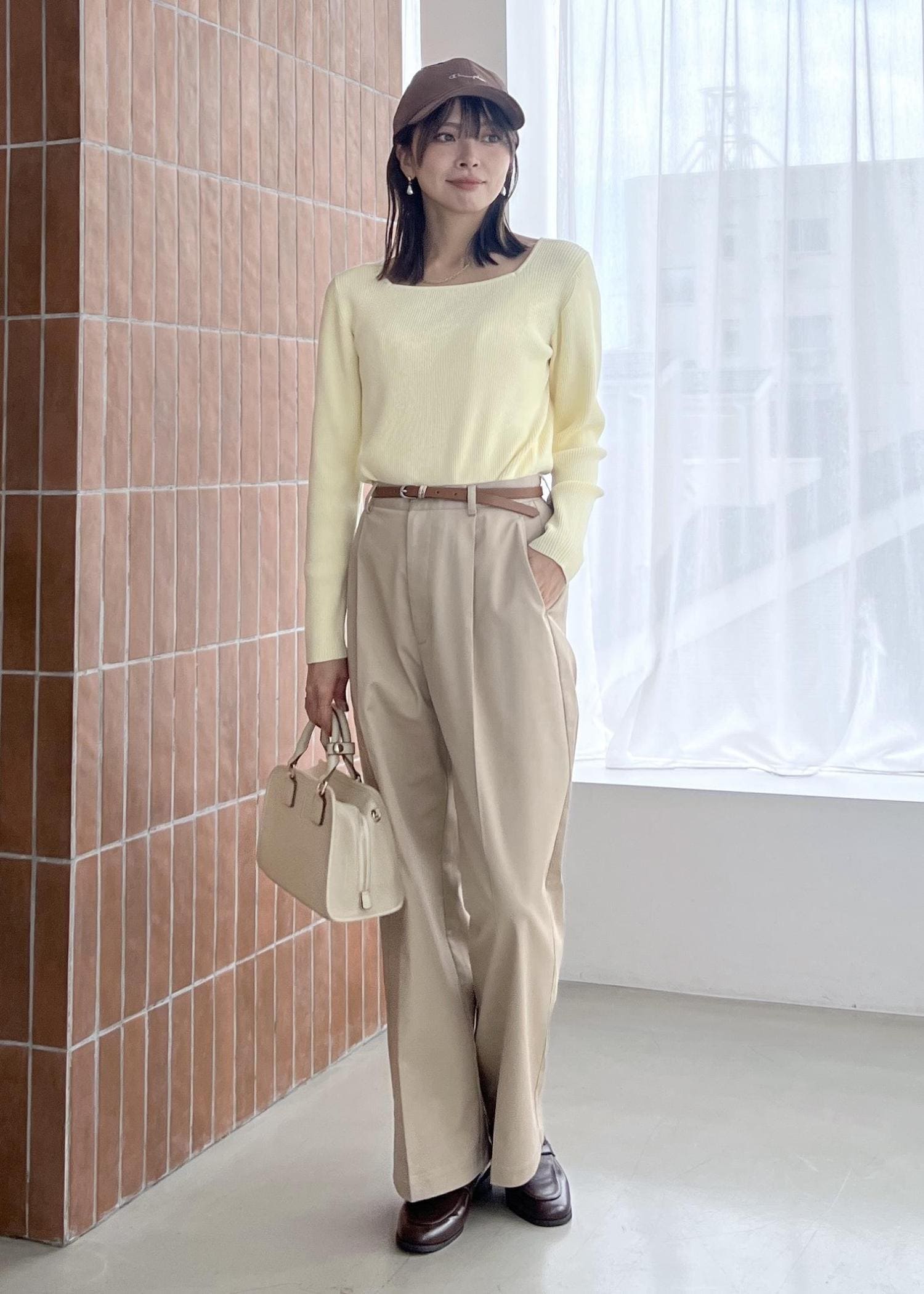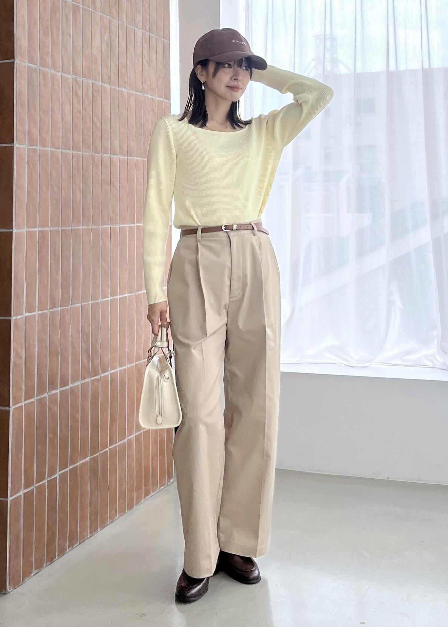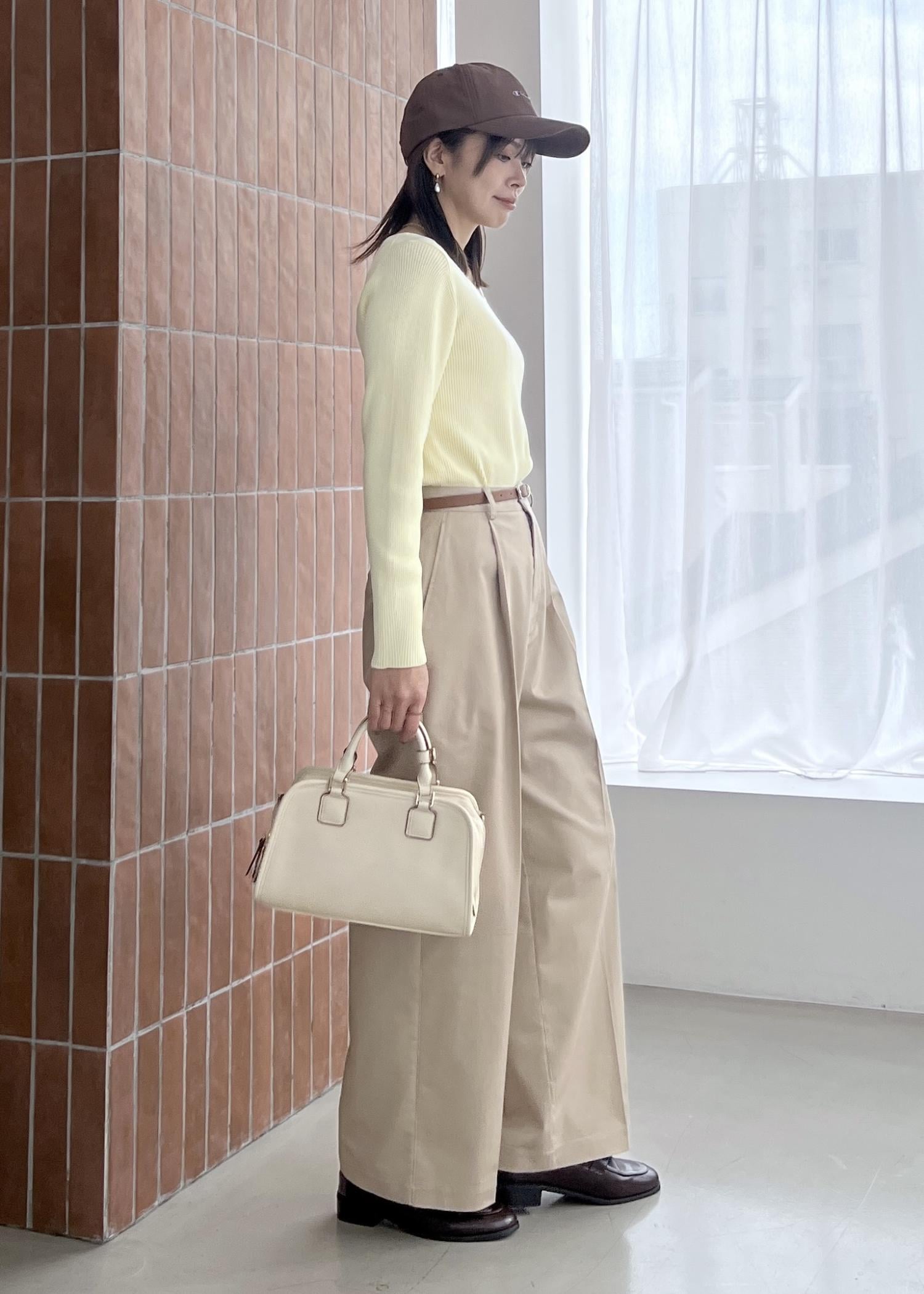 イエロー×ベージュにはブラウン小物で締め色をプラスするのがポイントです。